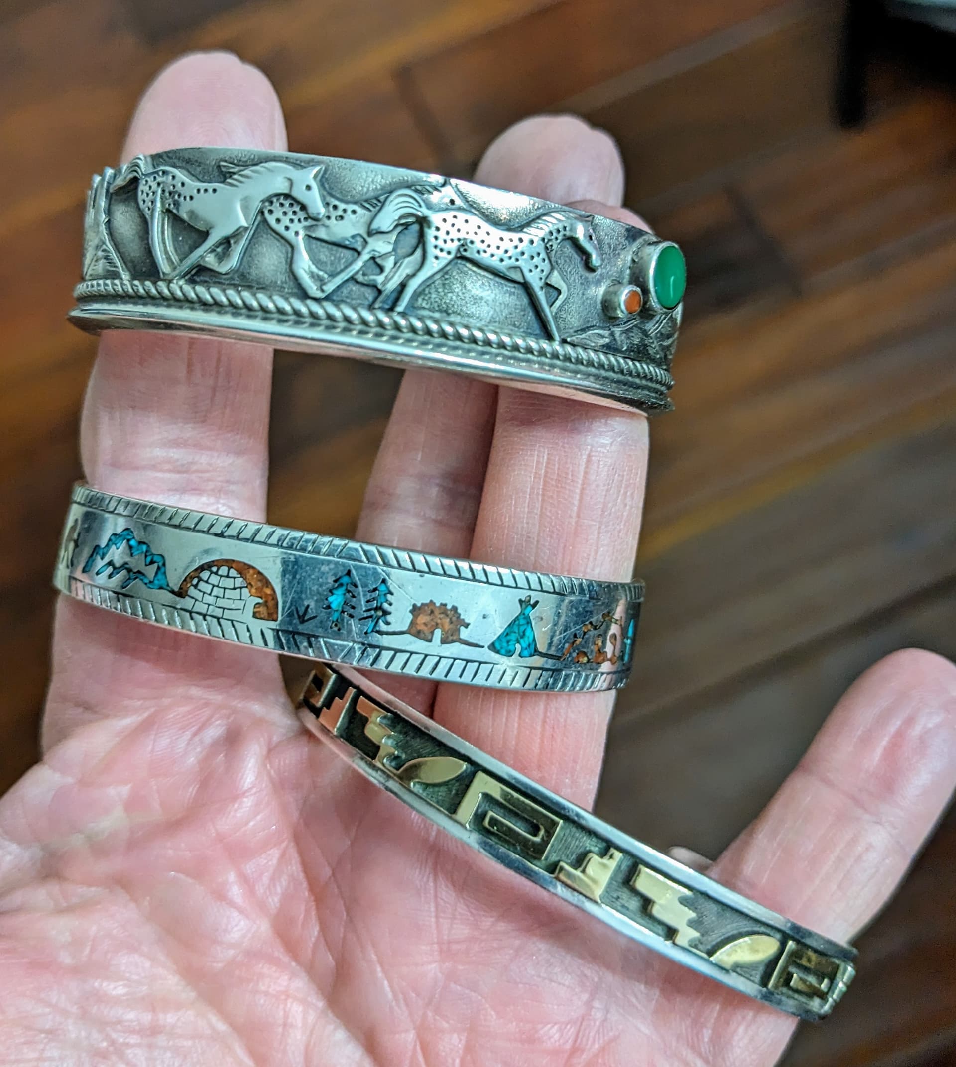 Desert scenes/stories. My fave horse cuff! Yes, that is the story cuff that we all made funny stories about (early man leaves home, travels the world, encounters snakes, and moves to a larger city, among others, ha). The gold ones with symbols is a rain prayer, I’m told