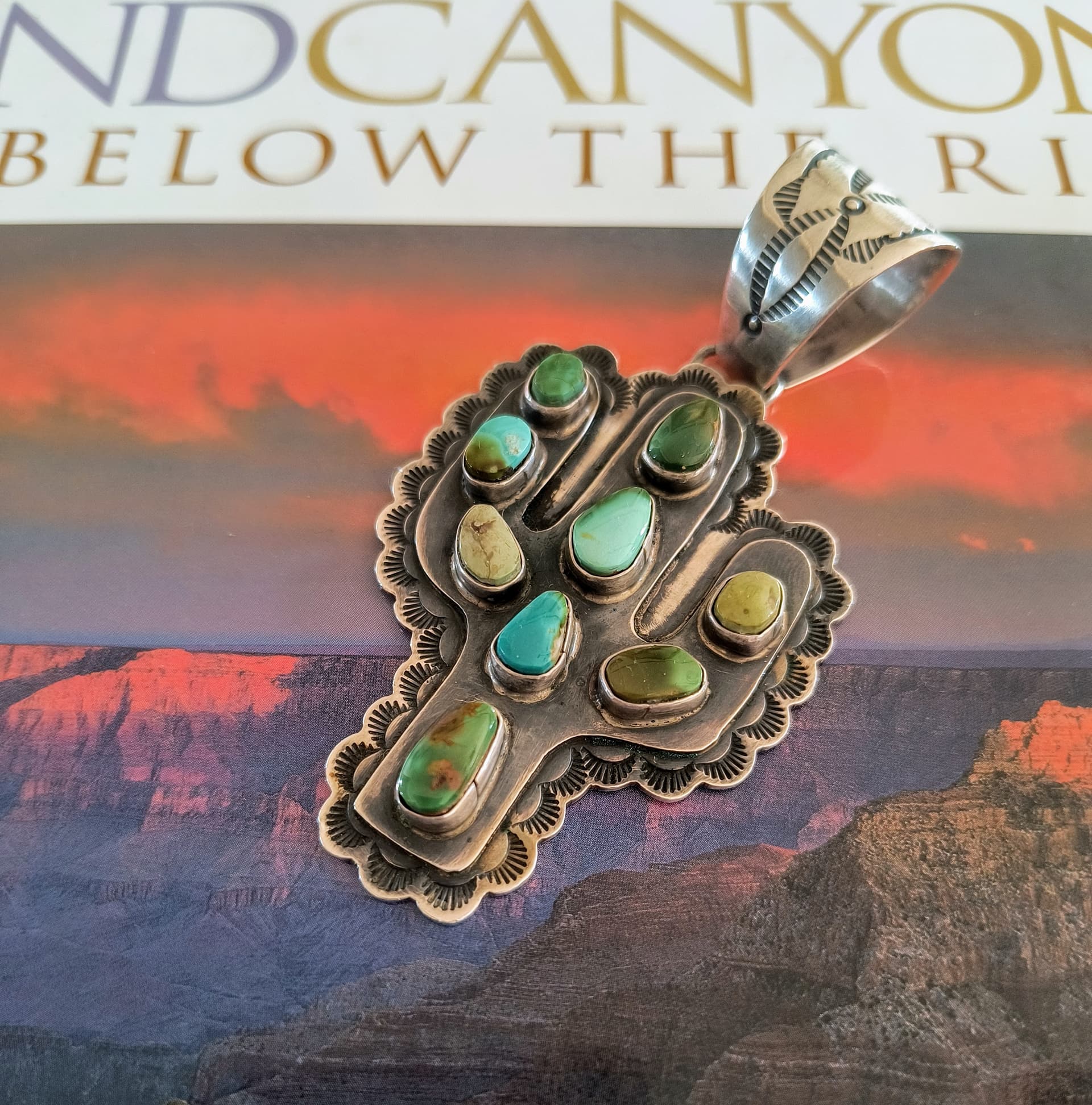 The first is a collaboration piece by Britwest and Navajo Robert Livingston. She told me the stones are all natural Sonoran Gold turquoise. It’s large, about 3 1/2 inches, and fits nicely on a number of my necklaces. I love saguaros, and my friend in Phoenix has two in her yard.