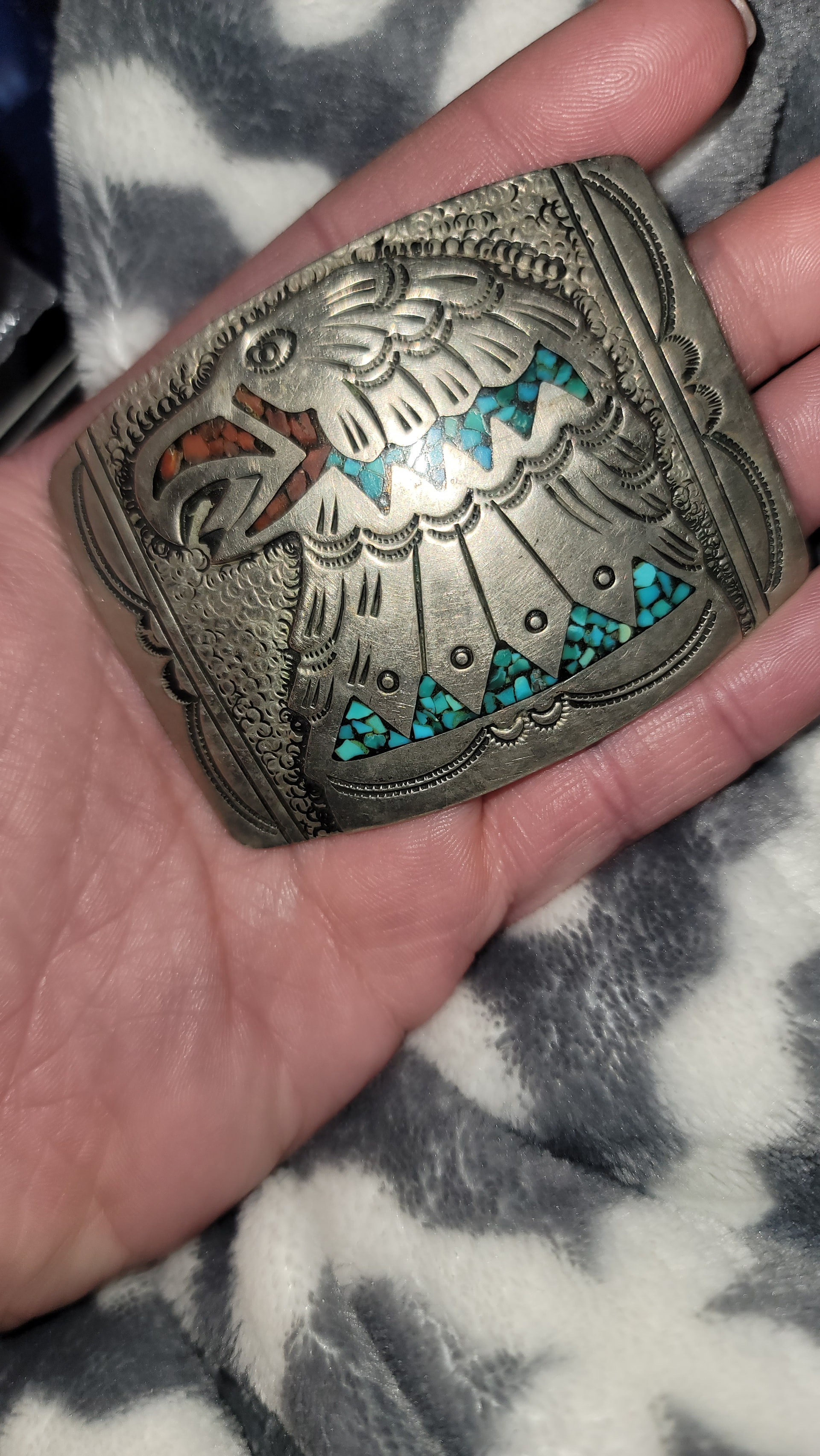this looks like standard 70s chip inlay, but i would have it tested for sterling because it looks like it may be alpaca. that will definitely effect what it is worth.