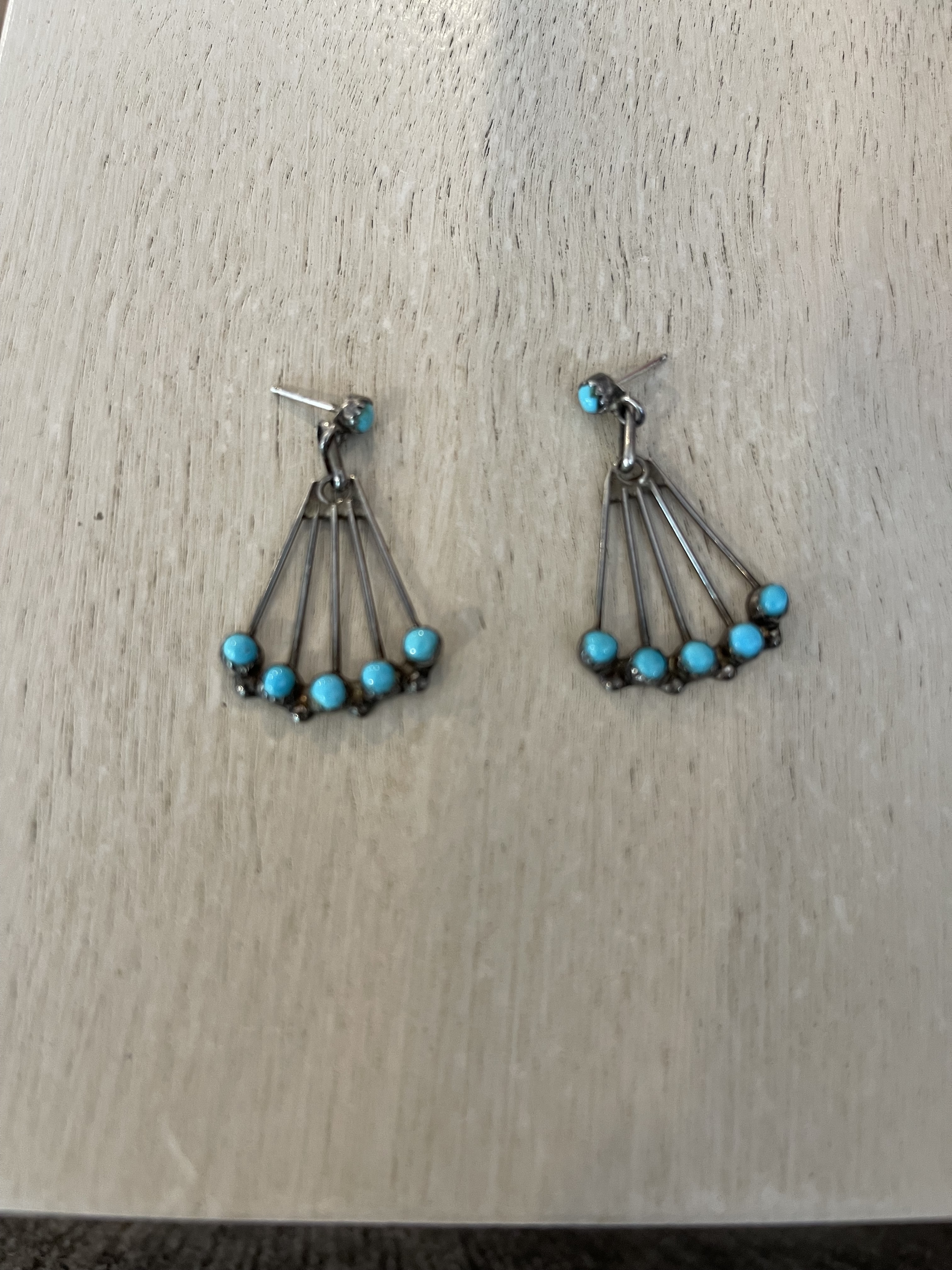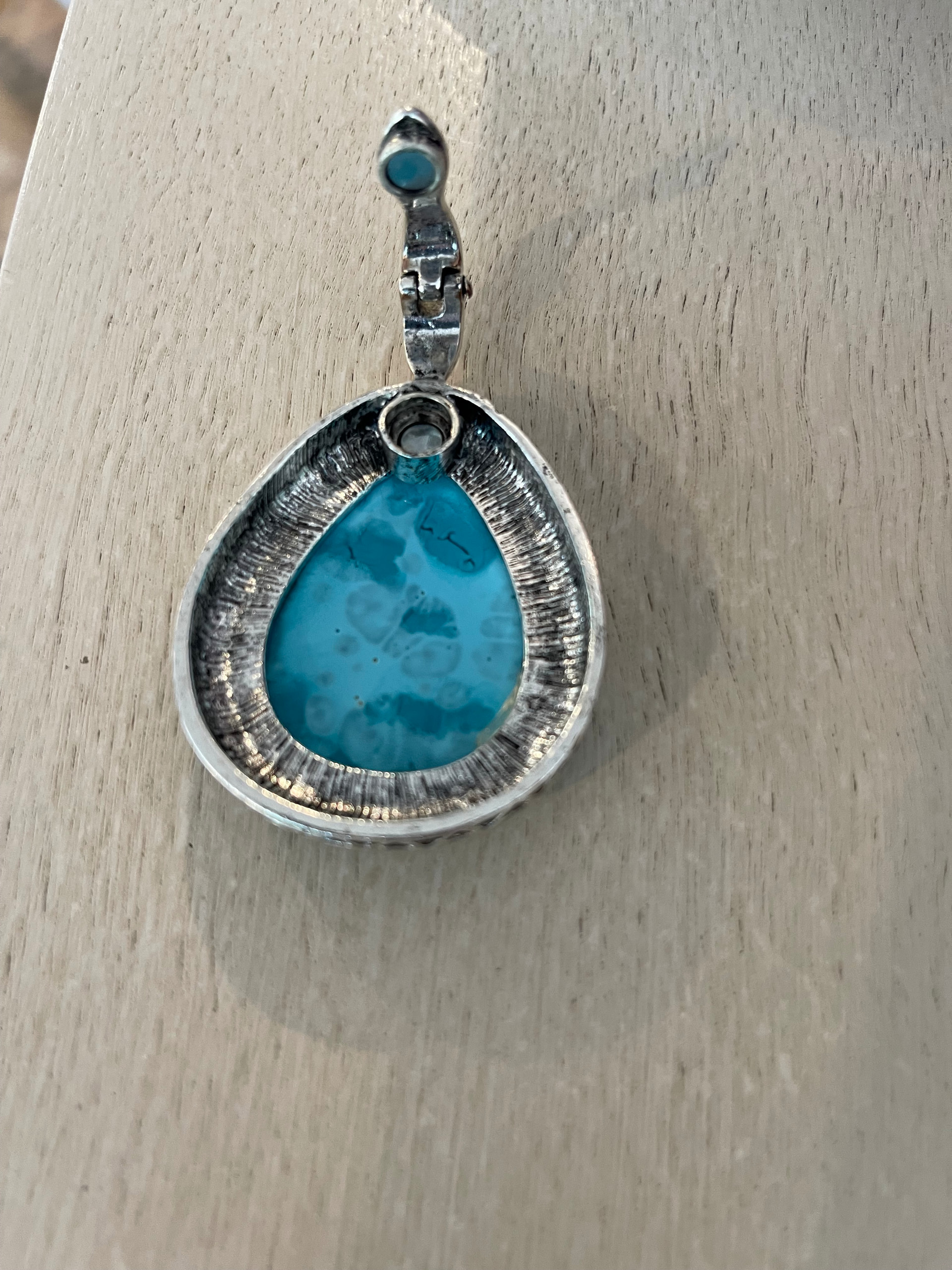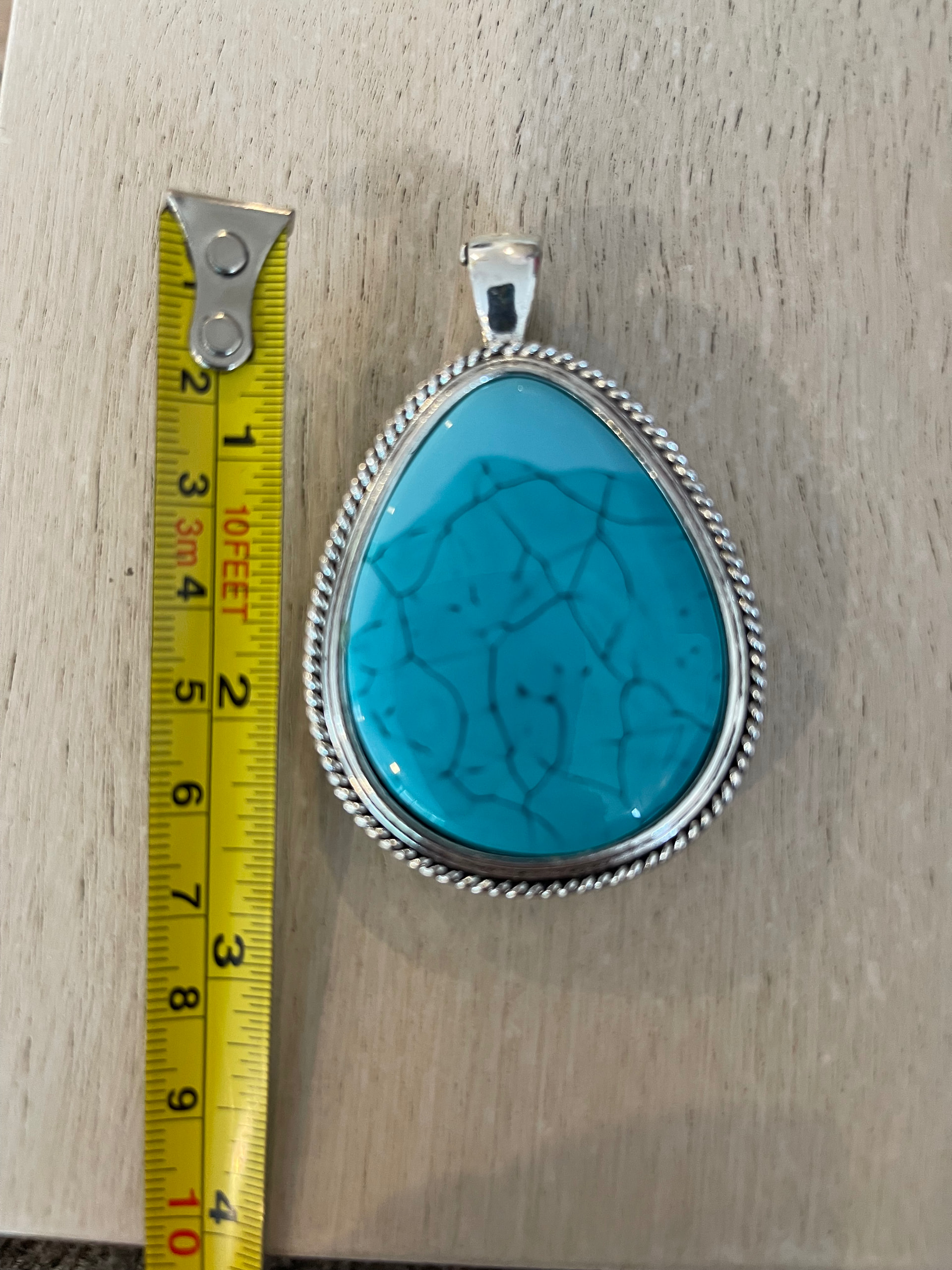 The turquoise-colored pendant is a base-metal Asian import with a likely howlite stone, not Native American, not turquoise.