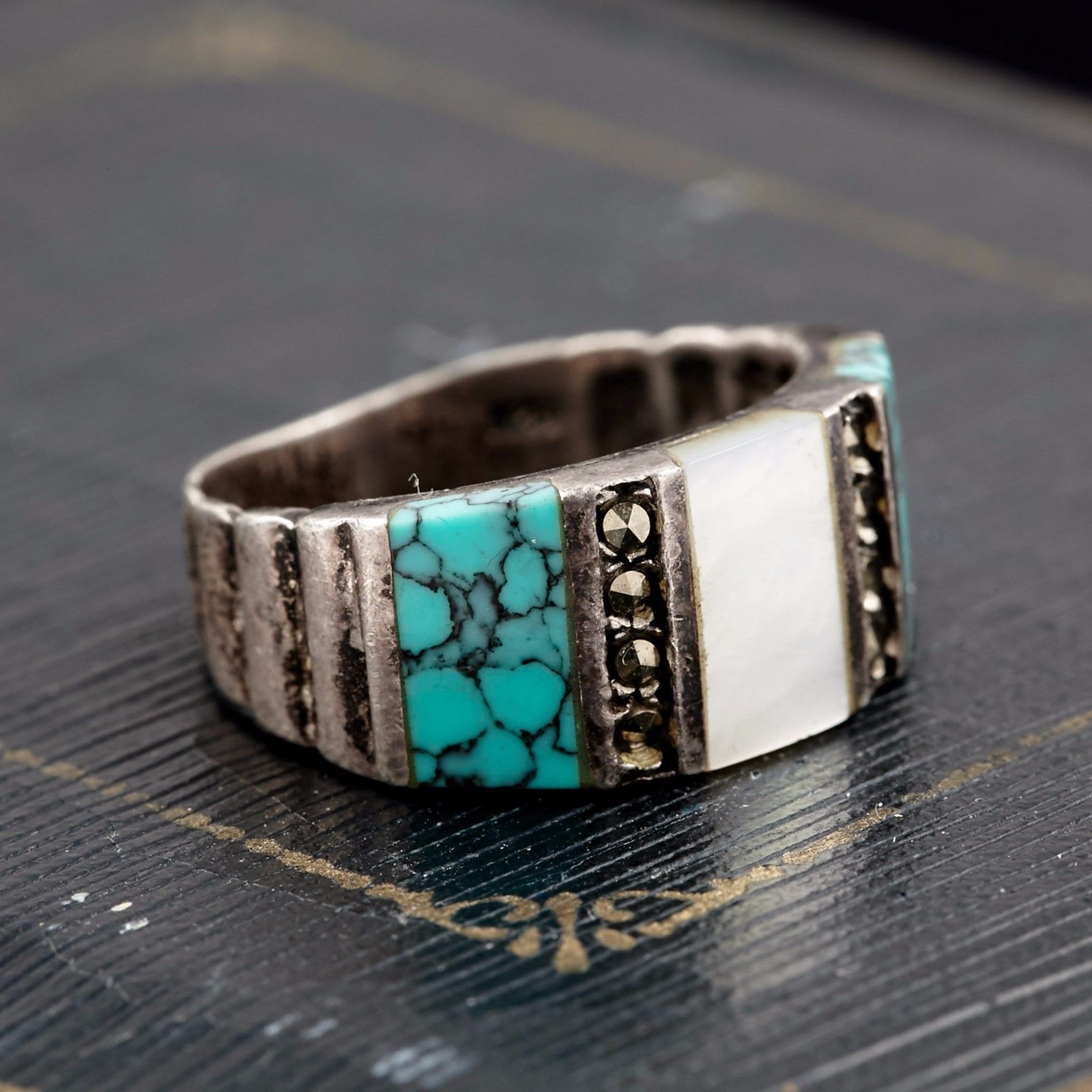 Hi, Nice ring! I just bought the same one size 6.75. CW is probably a Southwest manufacturers mark (according to some help). Maker unknown. It is a high quality Spiderweb Blue Mountain Turquoise with Marcasites and a clean MOP center piece (the one Marcasite looks missing but is just crooked). Checked good for .925 Sterling band. Price went up and down and I had to snag it when the price was right. Should be worth more than $40 (I sure would hope for!). A real beauty, a little worn but it is vintage, maybe '70ish? Don’t quote me on the date…