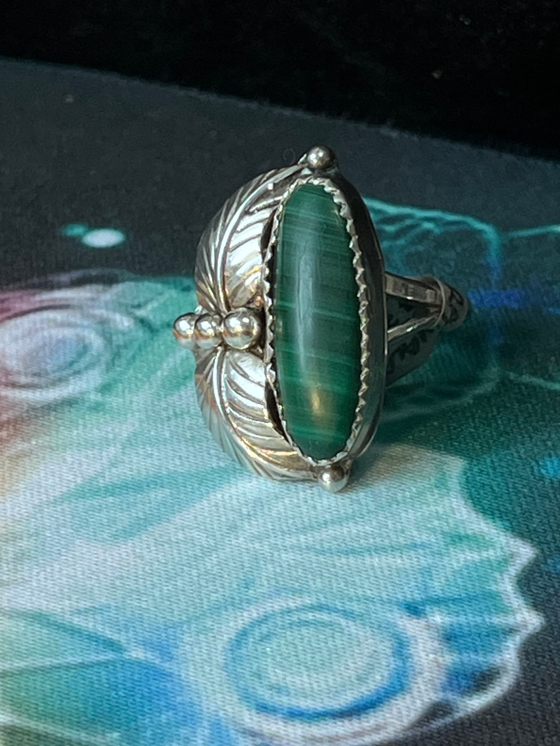 Hi ~ I see that you have this ring currently for sale in your Etsy shop. I’d agree with your description that the stone is malachite. Since you mention in your post here that there’s no hallmark, I’d suggest referring to the ring as Southwest style. Without a verifiable hallmark, you really can’t claim that it’s Native American.