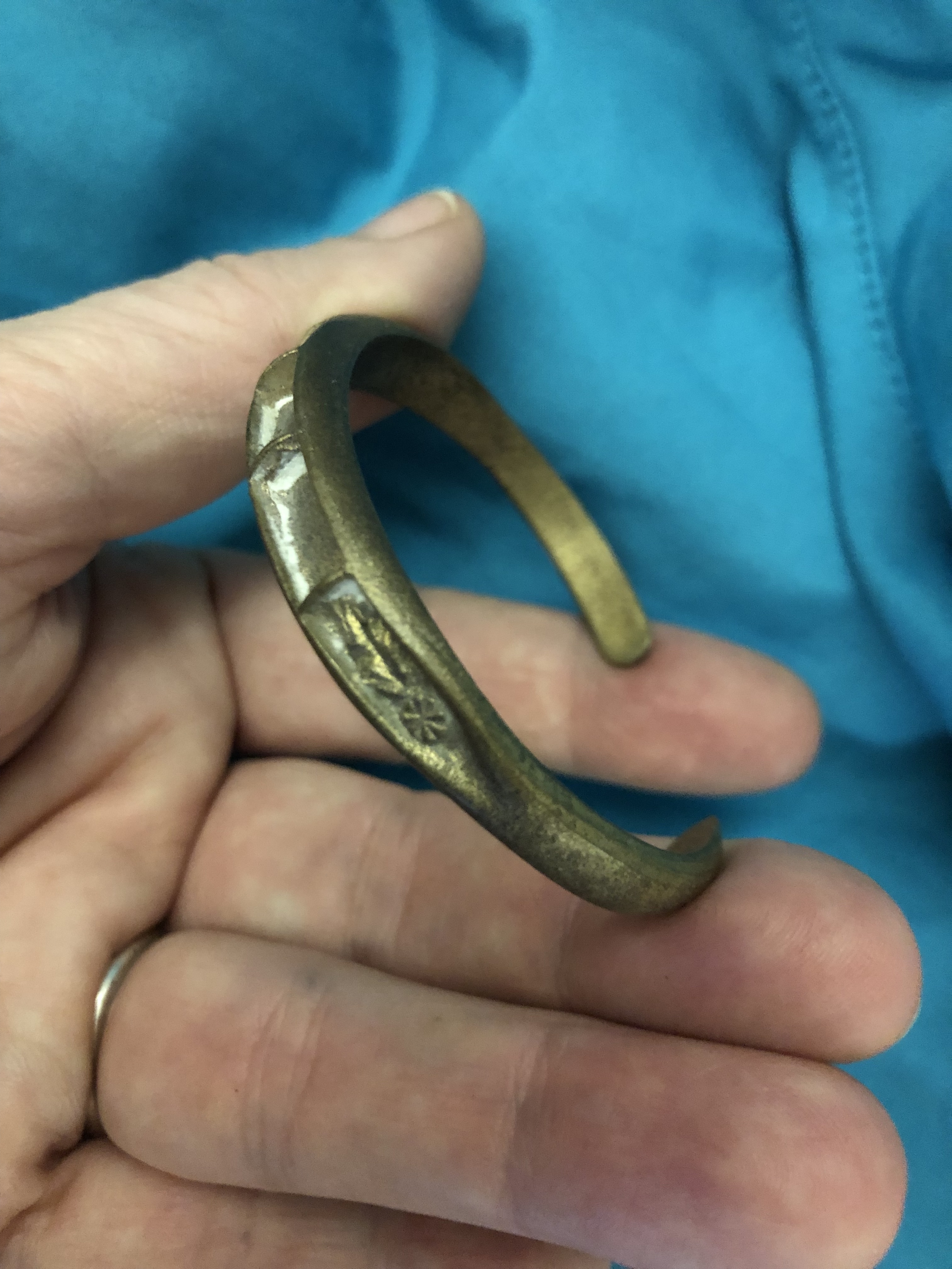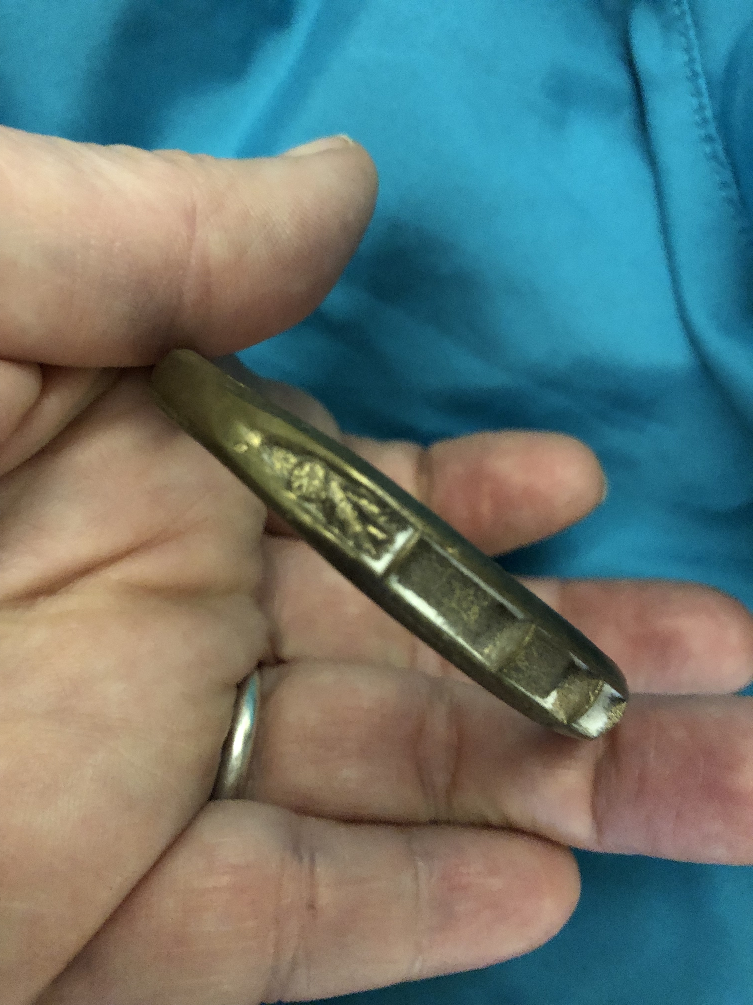 This is one of the many interesting things I’ve hoarded over the years. Just going through boxes today and trying to get rid of things. Any idea what this is and if it has any value to anyone. No hallmarks. Looks like cast brass with sections for inlay, or a mold or sample piece…?