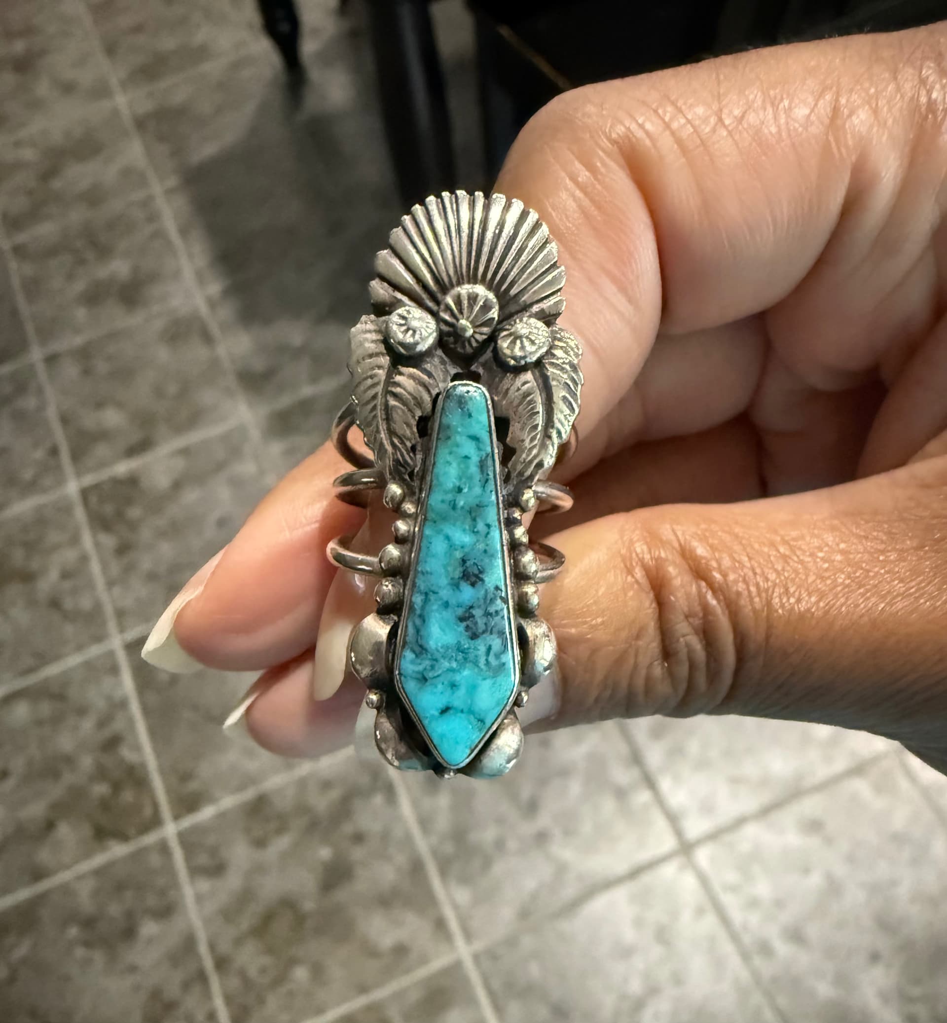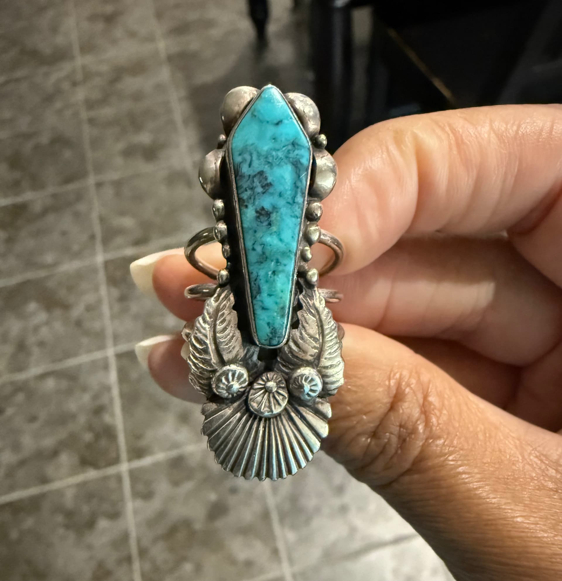I thought I’d share one of my favorite rings. I noticed I may have been wearing this ring upside down. I love math and angles, so I buy turquoise pieces I find cut in non traditional shapes. I had been wearing it with the feathers on top but noticed the hallmark was upside down. I wonder what was the thought behind making this ring? I’m always curious to know. It reminds me of the people I have lost when I wear it. Happy thoughts Have a great day all!