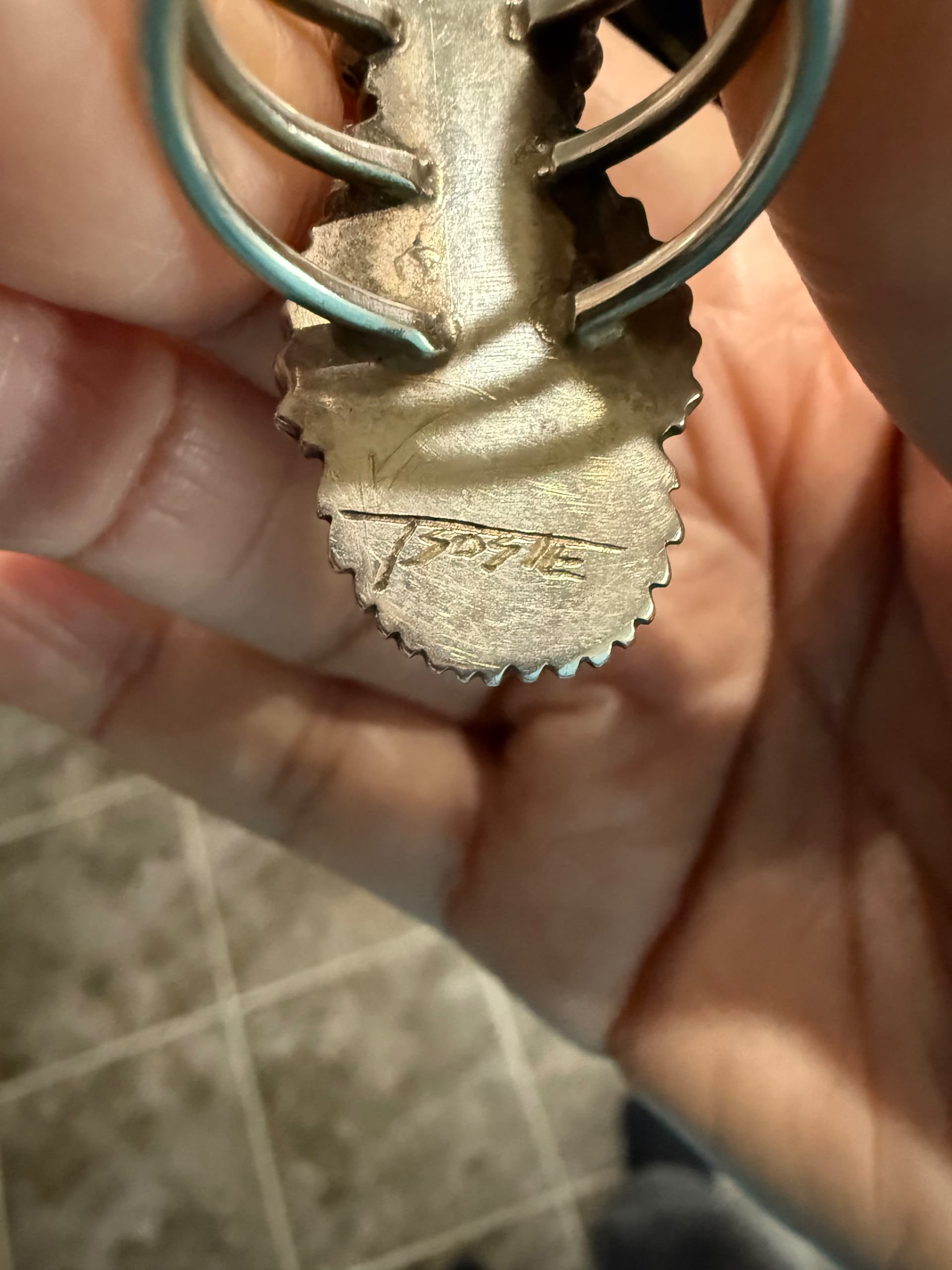 @CyanideRose18 Boy Howdy, I like this ring! But, I almost stopped reading at, “I love math…” (math is my nemesis). Seriously, though, that’s a lovely piece of turquoise and a cool looking ring. Here’s my take: the feathers/headdress indicate the top of the ring. When the ring is oriented in that way, I see an elaborate figure (the turquoise being the “body”). You brought up something that I’ve pondered about for years with rings: the placement of the hallmark - is the maker telling me their vision of how the ring should be worn? Sometimes, I see it the maker’s way, other times I don’t .