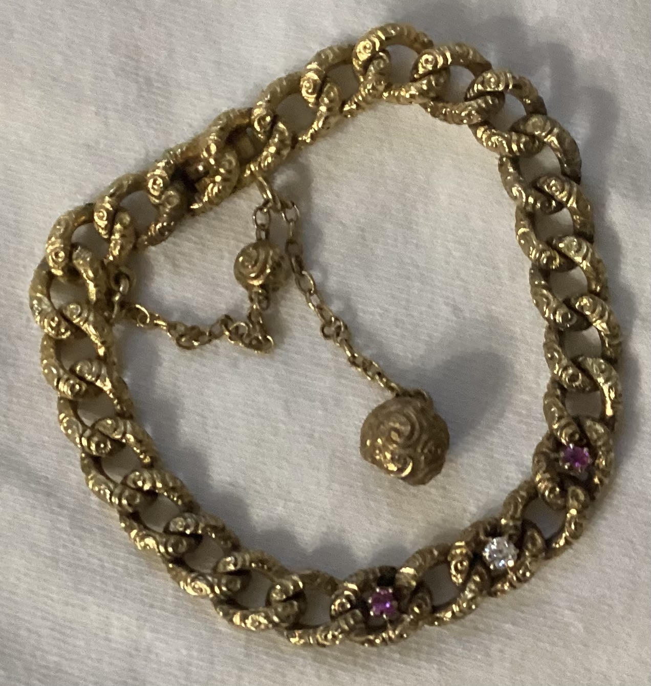 Look on the inside of the clasp for a possible assay mark. Is the chain hollow? Many of those were 14k to 22k hollow gold, Victorian era, never marked. The bracelet I have is 22k verified by XRF. The clasps were often replaced so you can’t always go by the mark on the clasp.