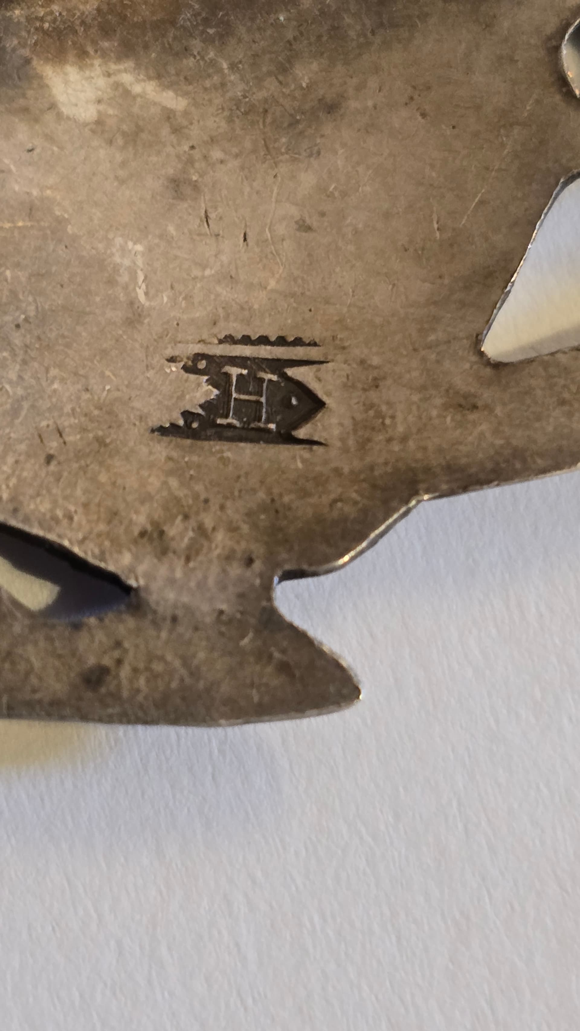 @LUCKYSTIKE Hi & Welcome. That’s a terrific Big Horn Ram pin. I checked my Bille Hougart’s book on “Native American and Southwestern Silver Hallmarks” for that hallmark but, unfortunately, I don’t see it. It can be challenging to identify single letter hallmarks. Have you tried Google Lens? Also, there’s an online hallmarks resource that could be helpful: https://www.art-amerindien.com