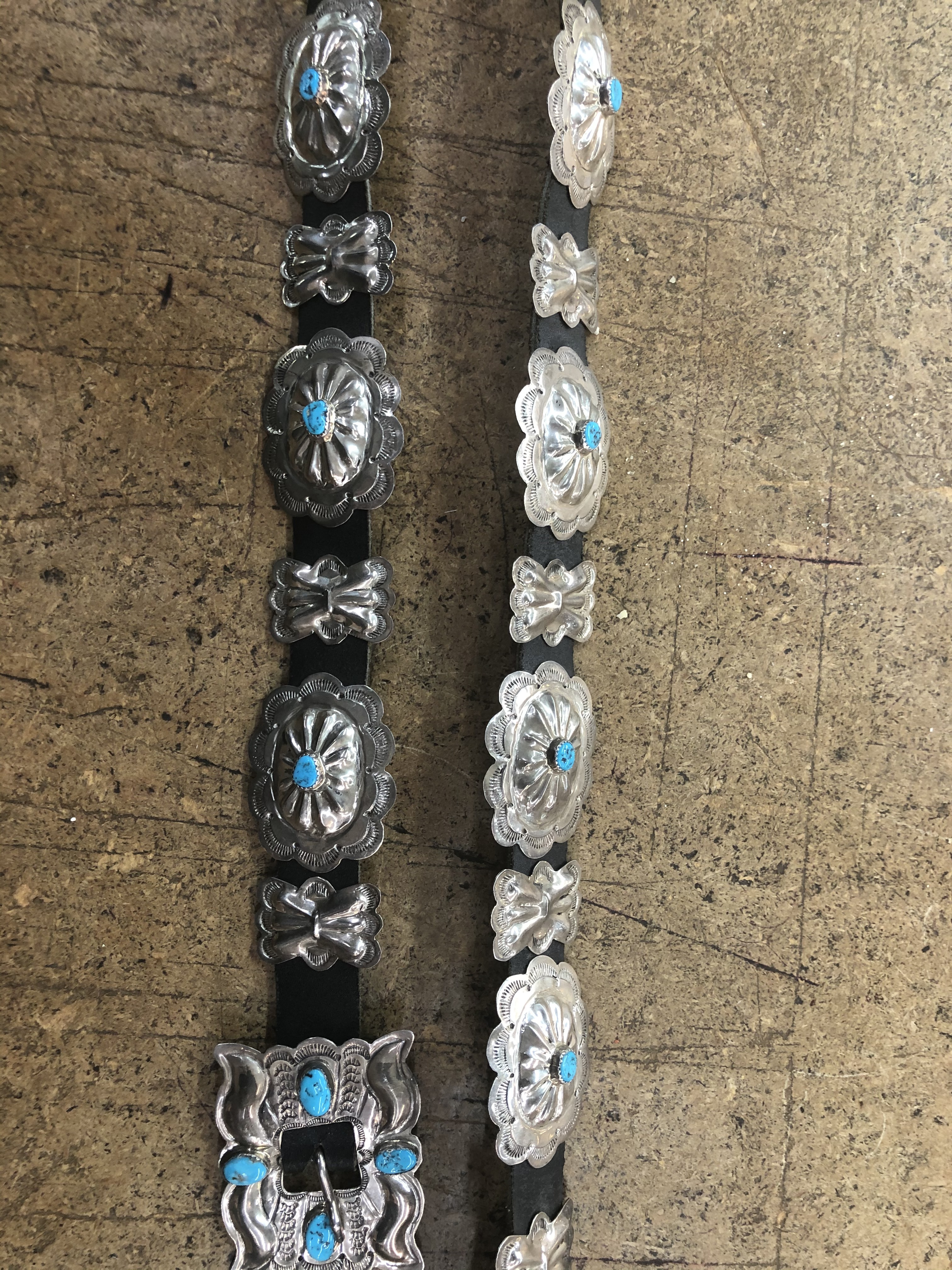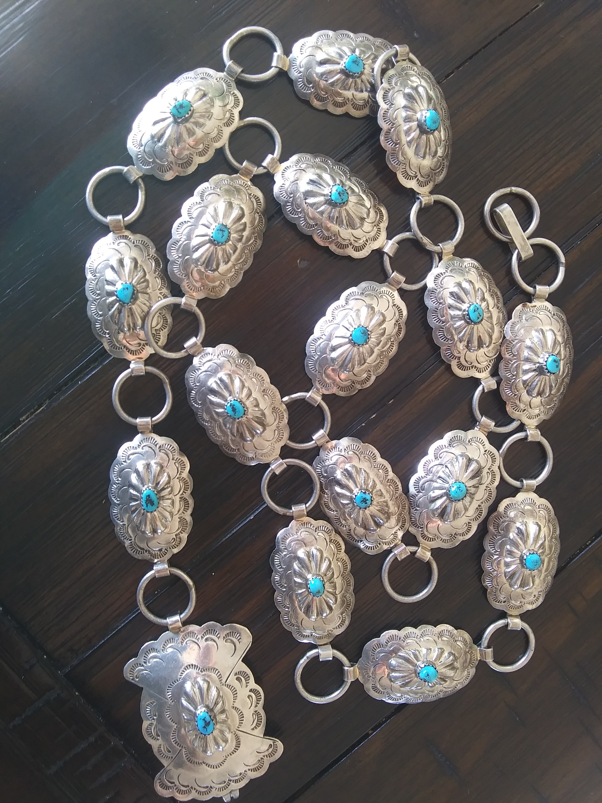 Welcome to Turquoise People, hope you enjoy the forum. The design is popular, couldn’t find a link belt but did find this Concho belt. It is hard to get an idea of the size, but guessing those conchos are around 1 1/2" x 3/4". $300ish. Are you positive it is from the 60s?
