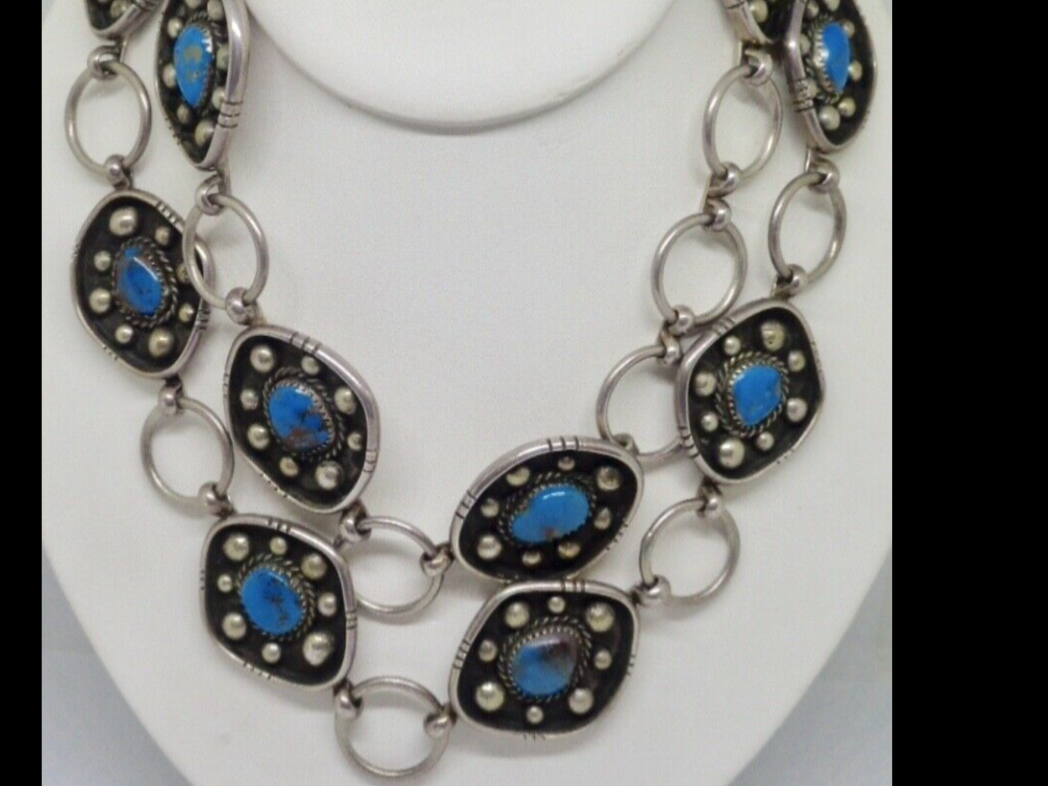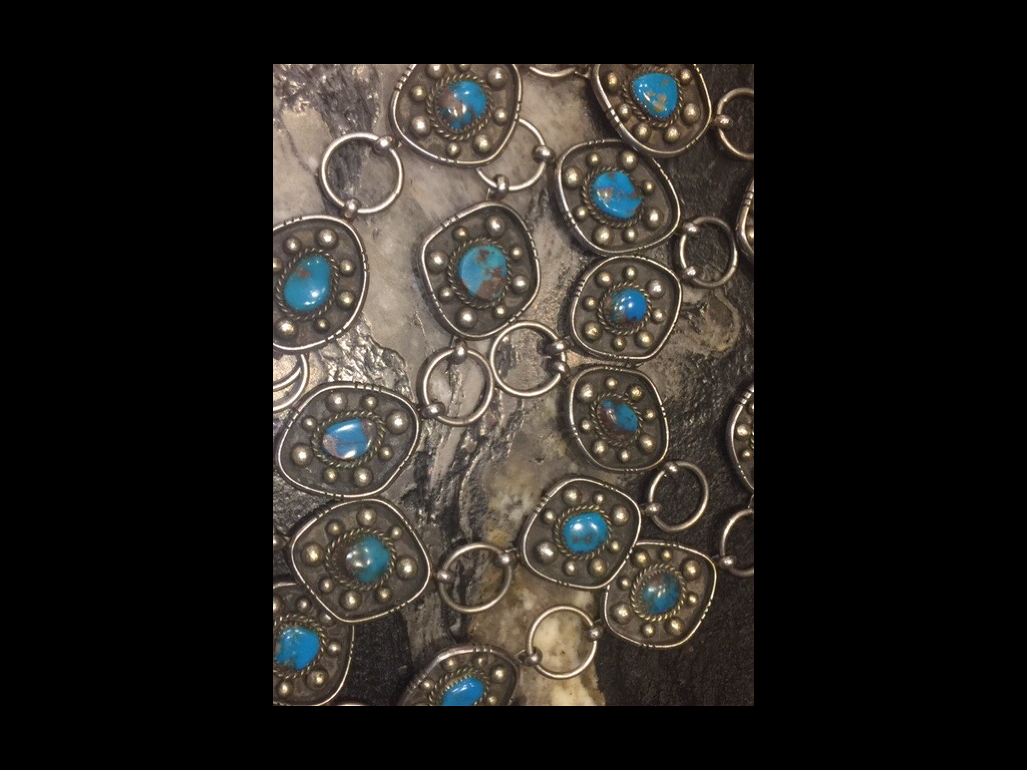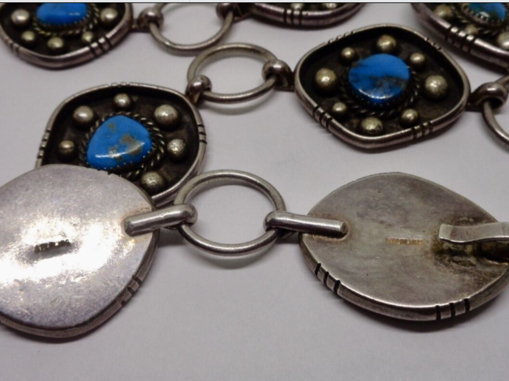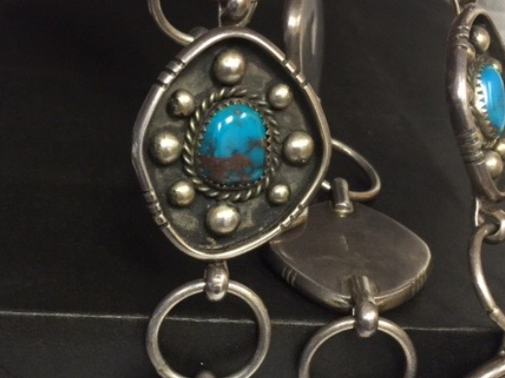 sterling stamp. Questions as to the age, Turquoise and if Bisbee what value do these smaller stones represent? Nice thing about this Concho is it is longer so it can be worn as necklace or belt.