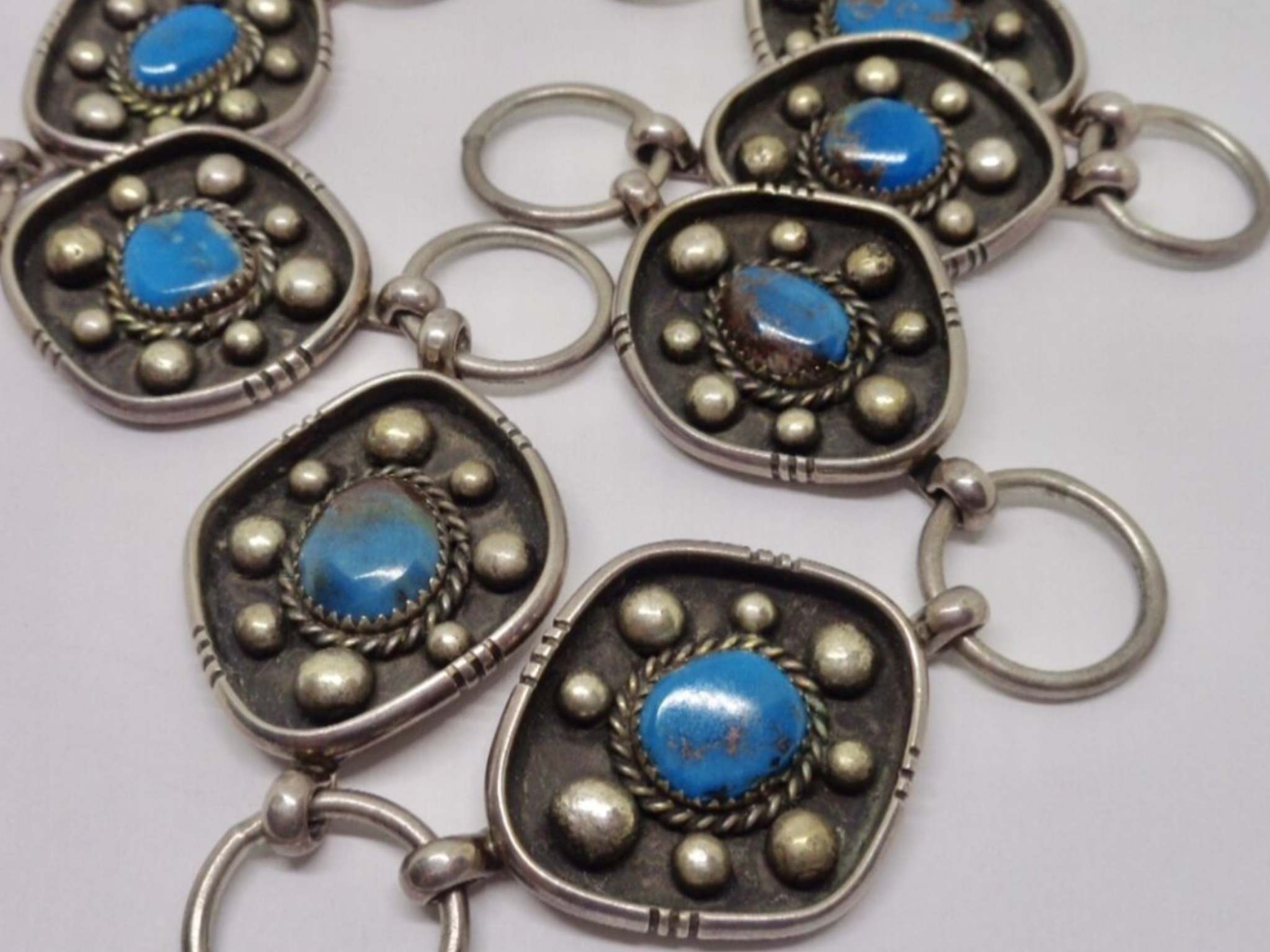 Looks like Bisbee, nice. It is hard to know the age, but you don’t see many link belts and more and it would be difficult to put this many Bisbee stones together. I think 80s - 90s. Bisbee can sell for $25 - $50 a carat for the good stuff, it is hard to tell from the image exactly what we have as a group. Some of these look like classic Bisbee and others look like a matching blue.