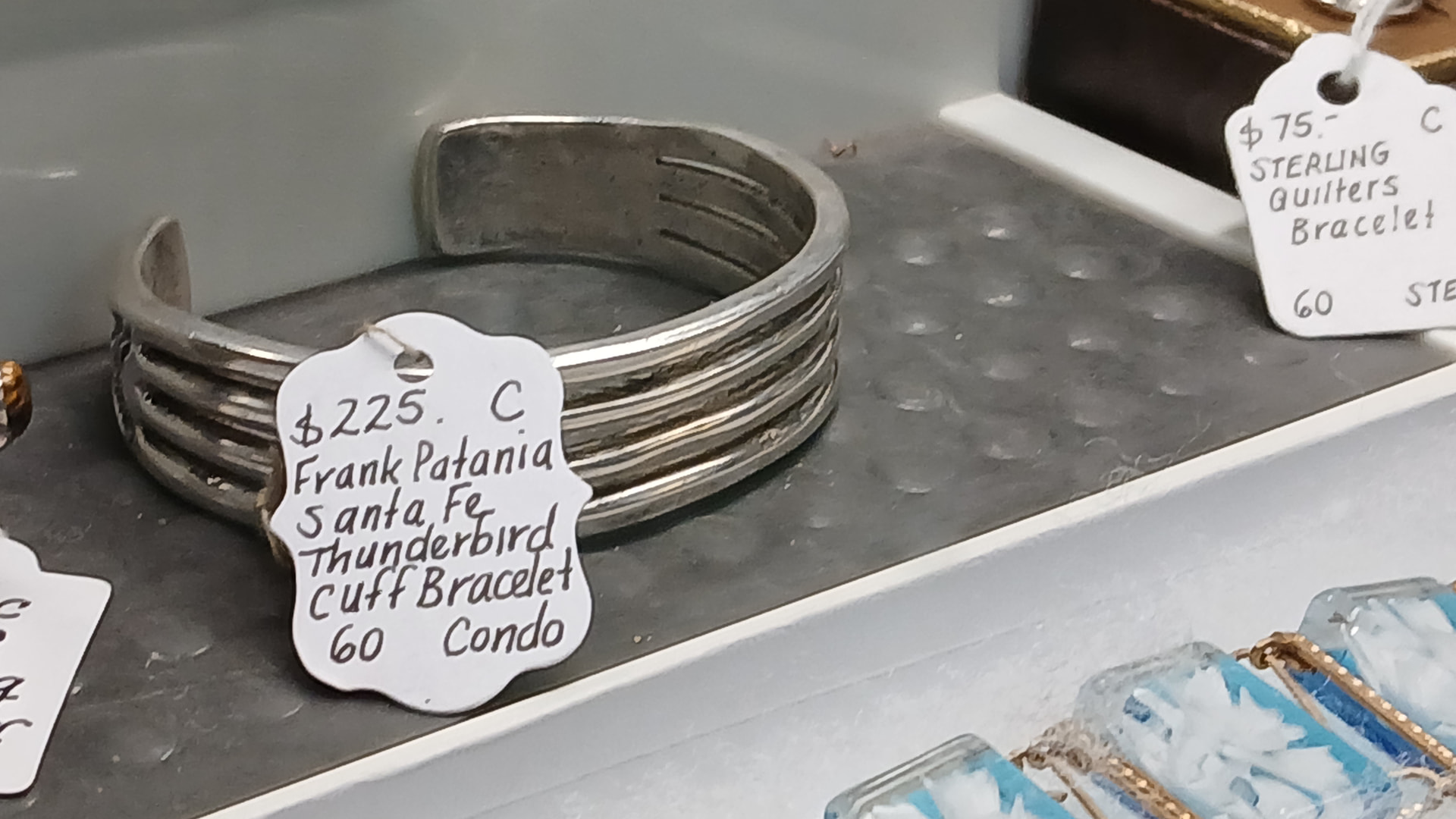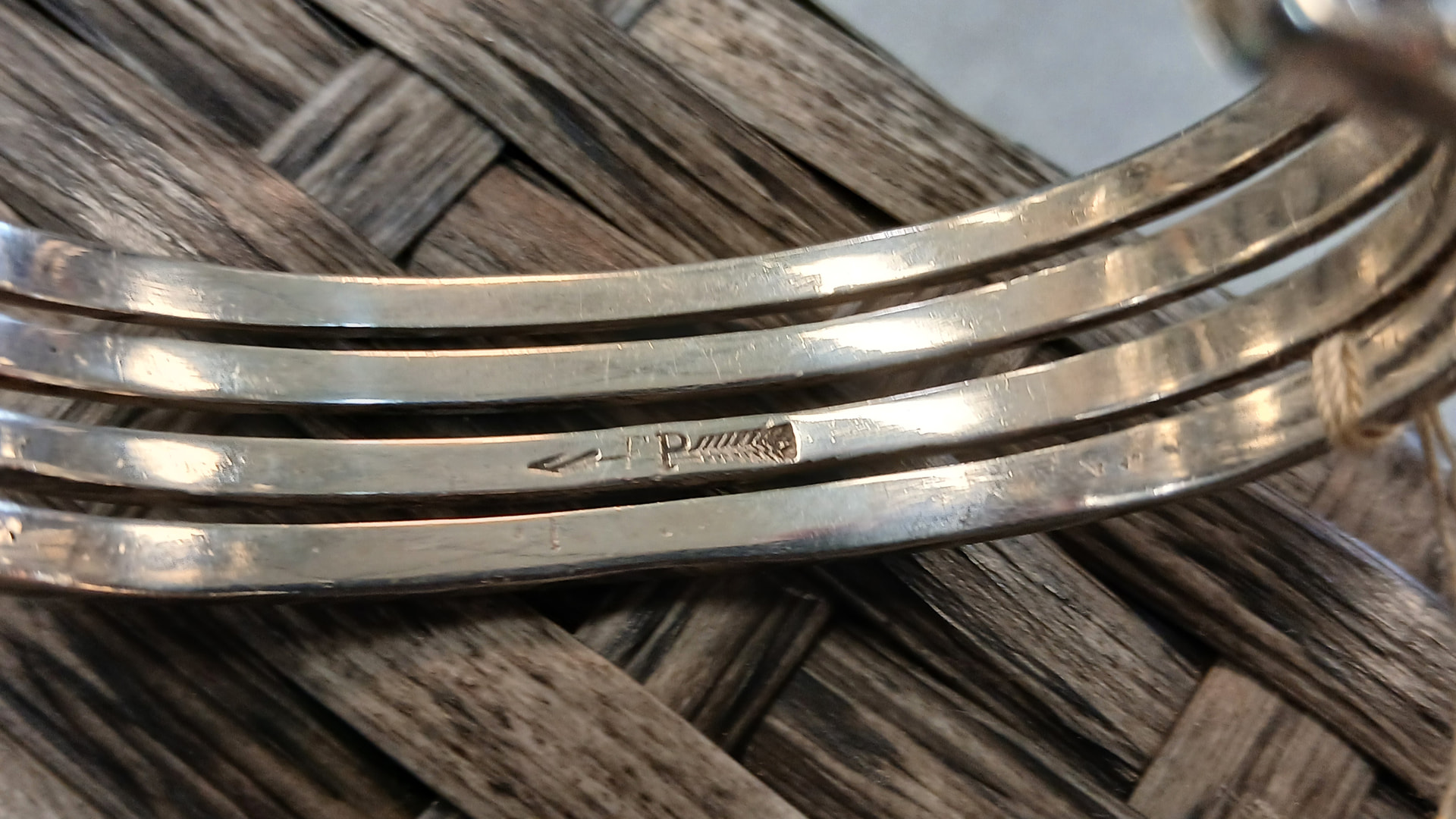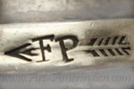 Came across this bracelet in an antiques mall, far from the wonderful finds that Stracci has discovered but was intrigued and always game for a mystery. Tagged Frank Patania Thunderbird shop, but hallmark definitely screamed otherwise. Then started to wonder if it was Fred Peshlakai, but style seems all wrong.