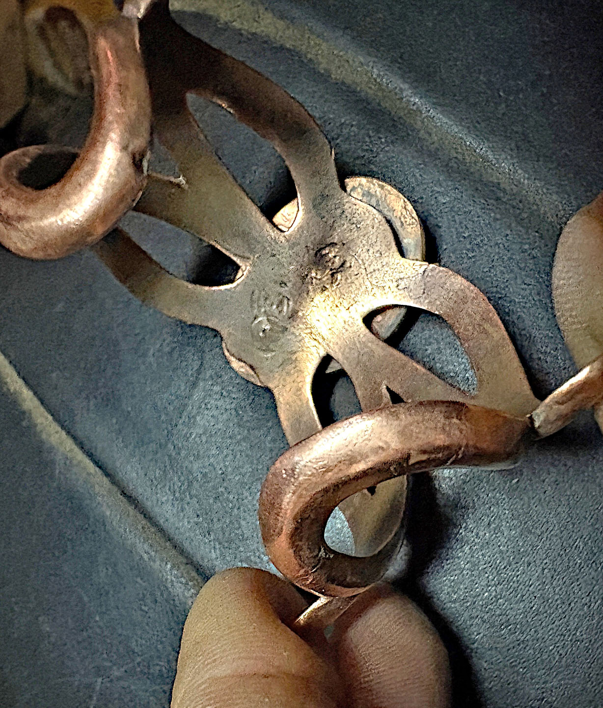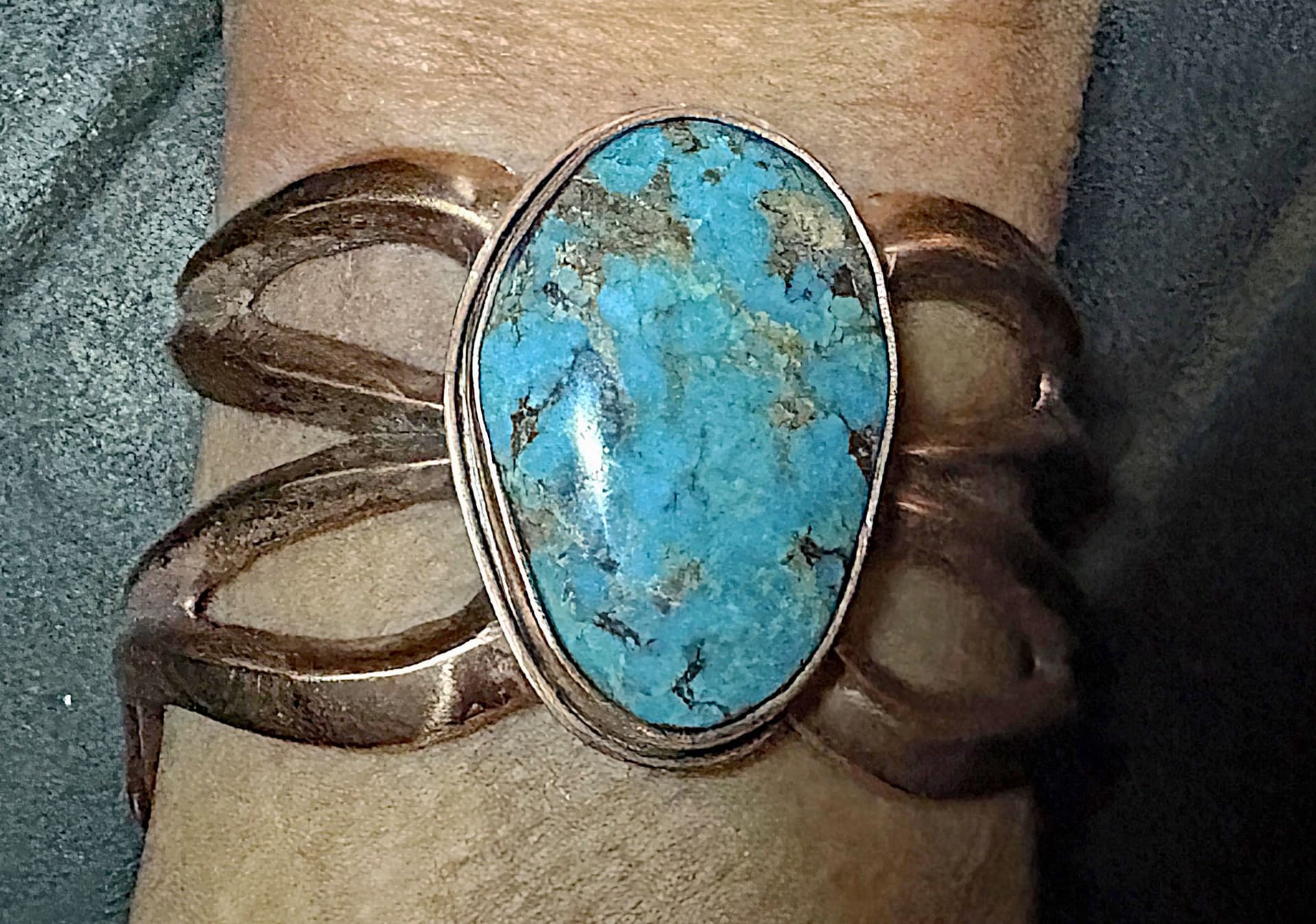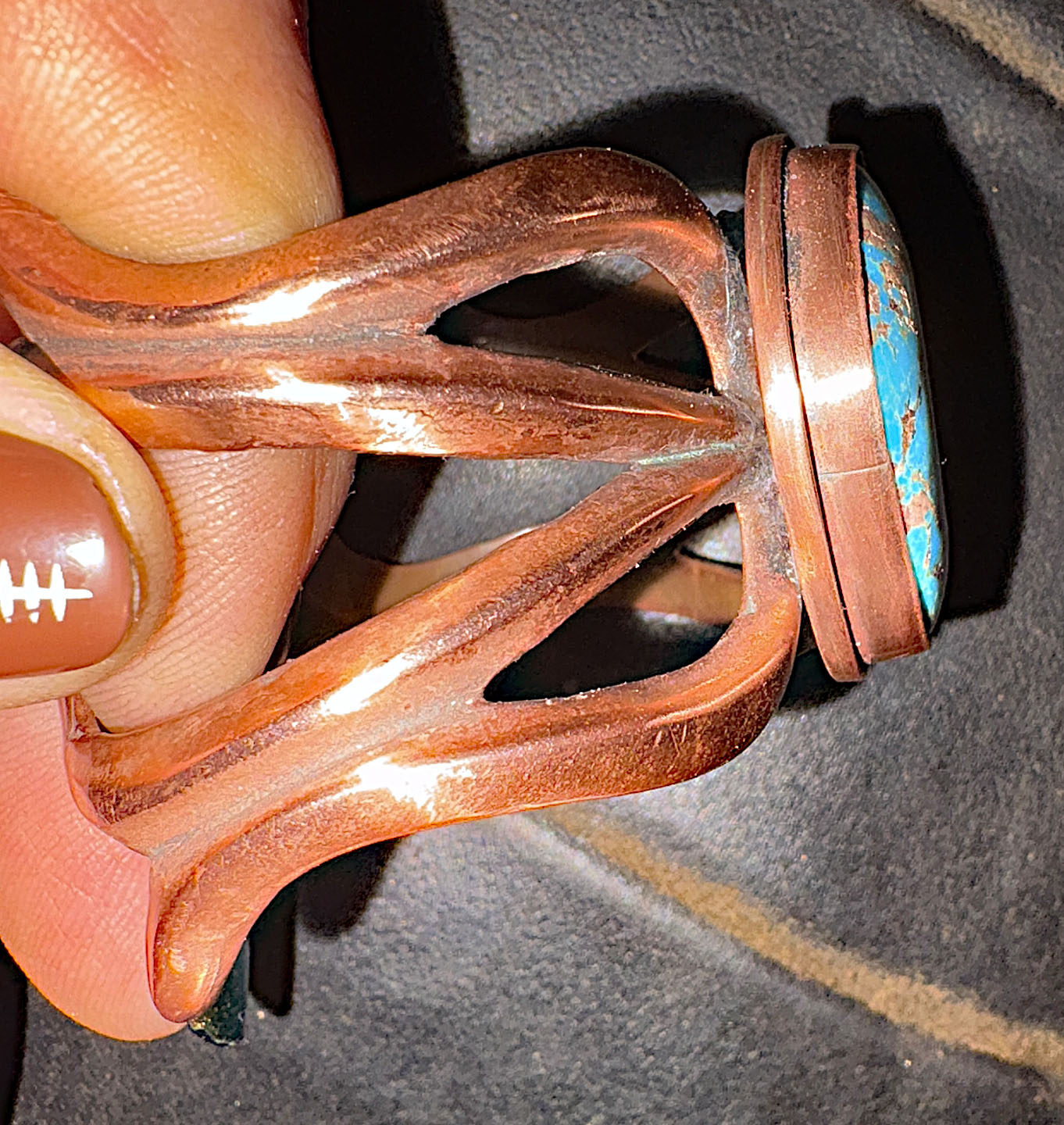 I had my Anglo artist neighbor set the turquoise and attach it to the cuff. It was her first time doing anything like this. She is an accomplished glass artist. Creates some other jewelry from brass, silver and copper. Instead of soldering the setting in place, she chose to rivet it. I will try to get some photos of the inside of the cuff.