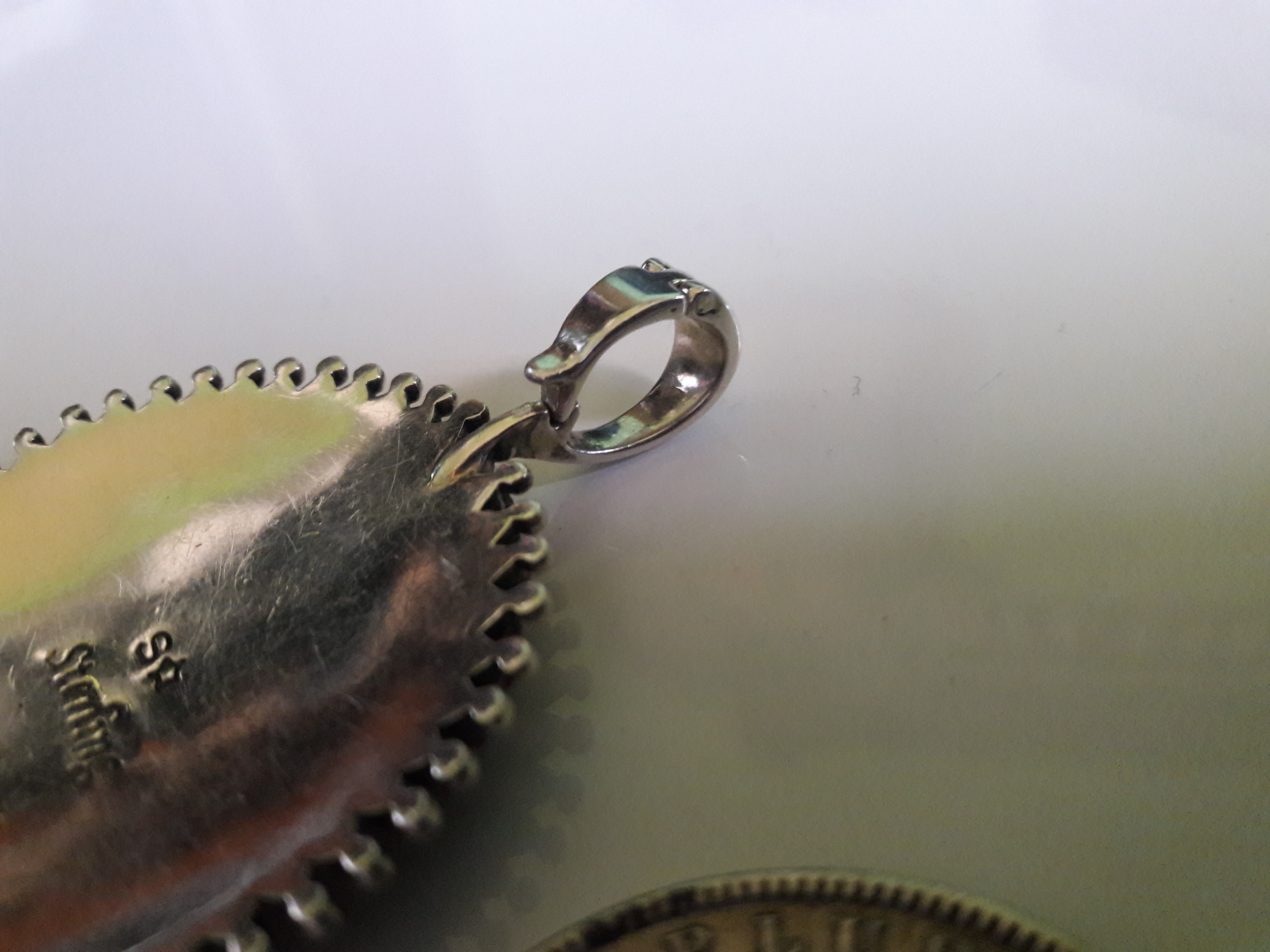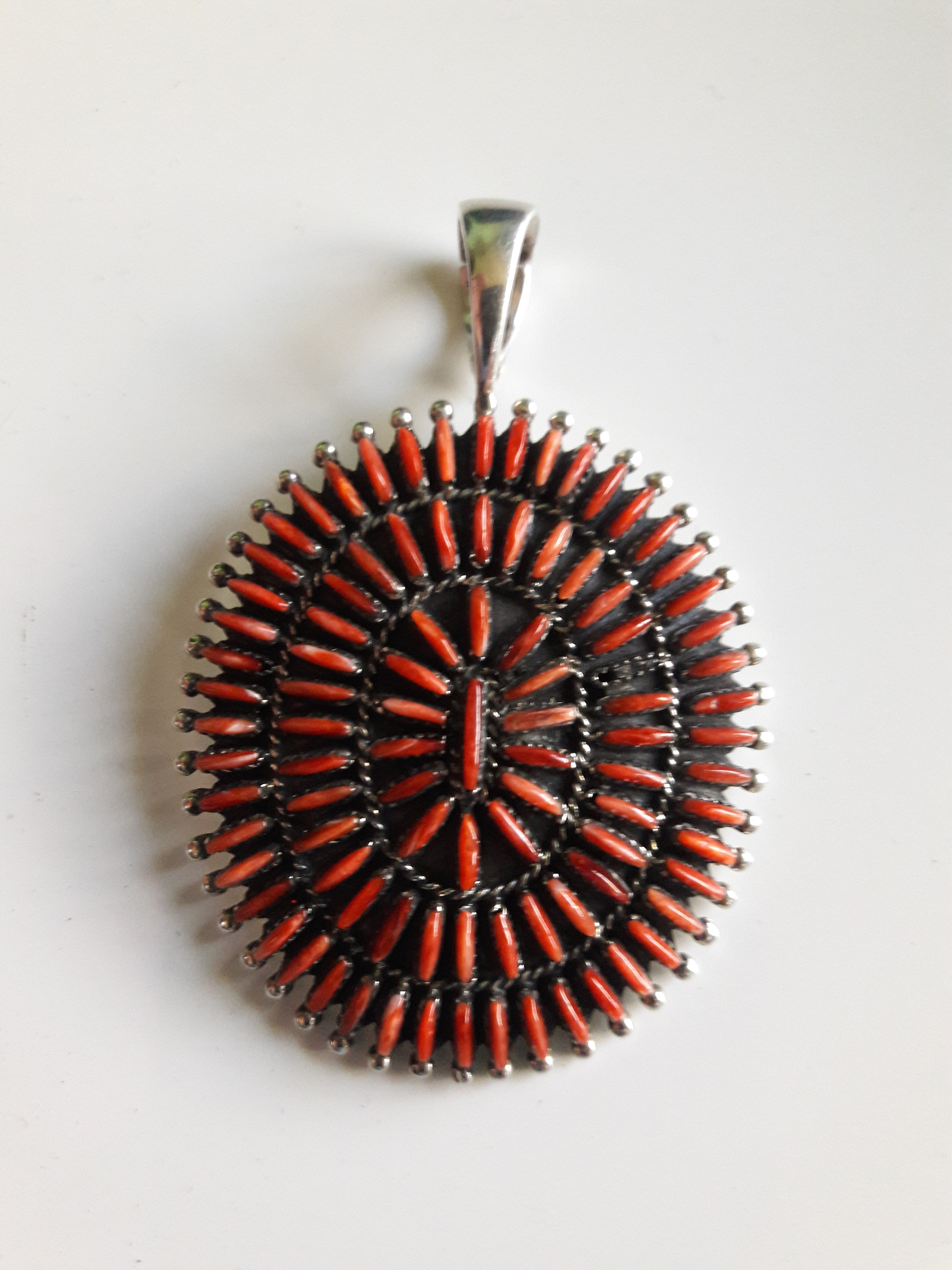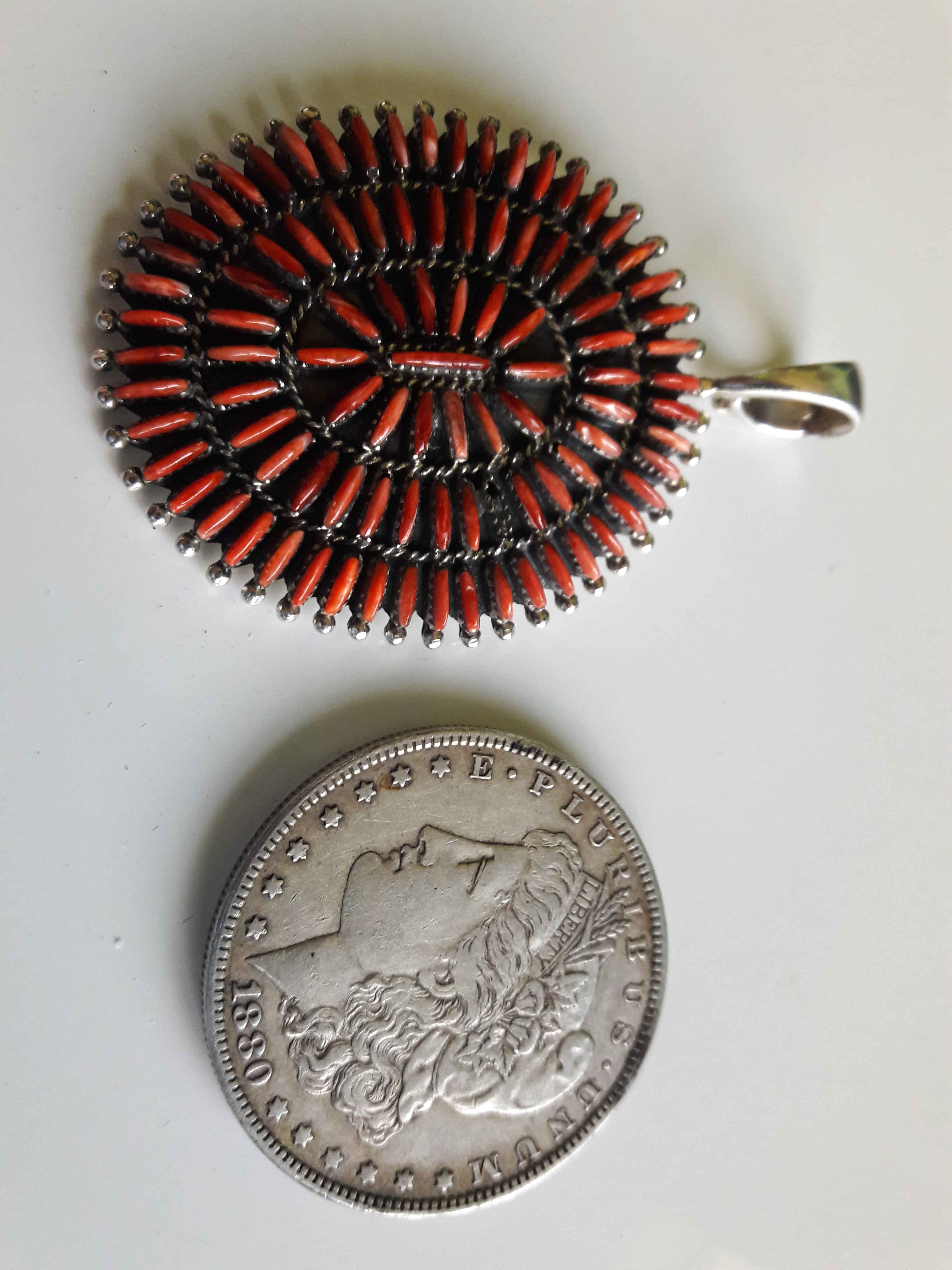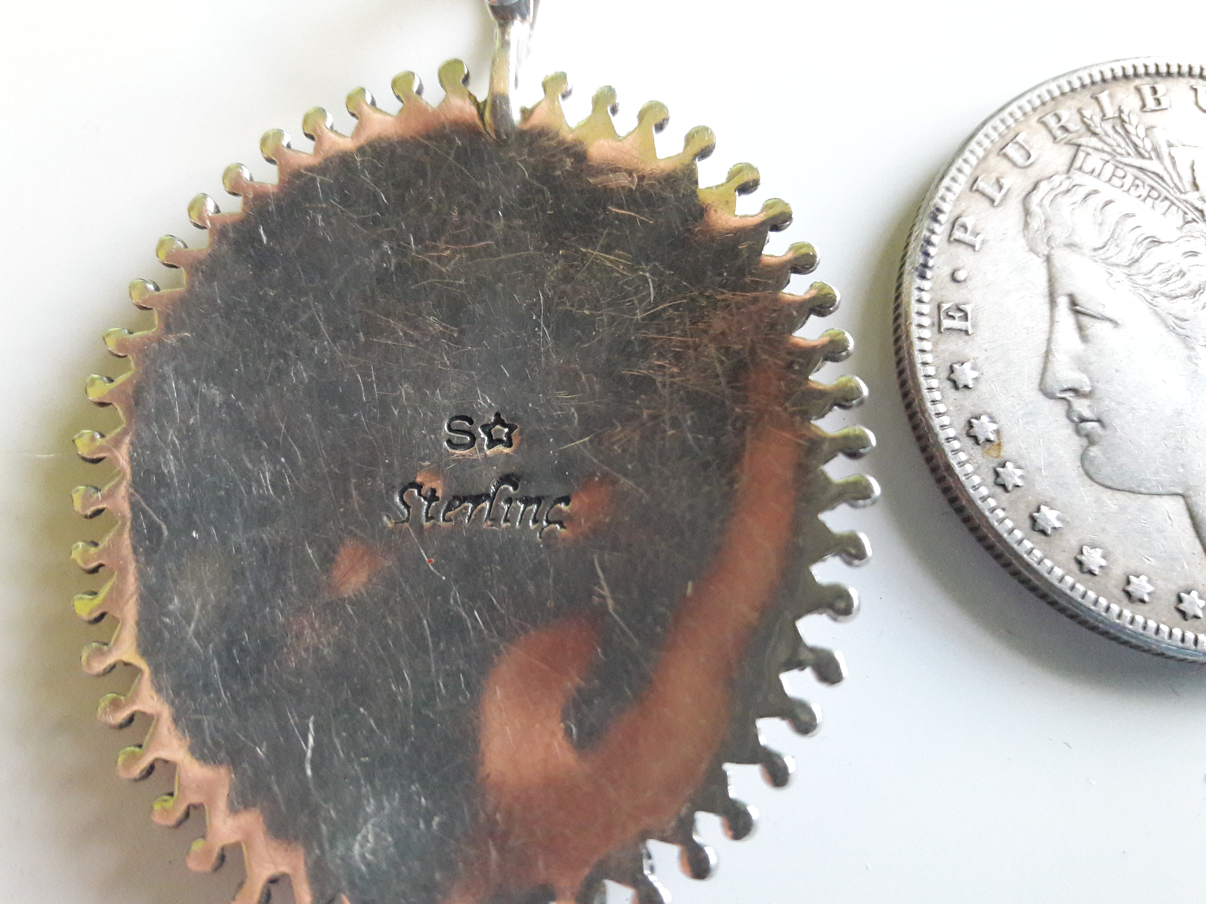 I bought this today. It has an S with a star for a hallmark. It seems like I have seen that hallmark before . I am not sure if it is coral or not. It’s stamped sterling, weighs 16 grams and is 1- 3/4" wide and 2-1/2" in tall including the bale. I was a bit suspicious because of the very low price until the lady pointed out the missing piece to me, I had not noticed it. I will see if Jason and the guys can plug a new stone in there. Also the bale opens up and snaps shut securely which I’ve not seen before.