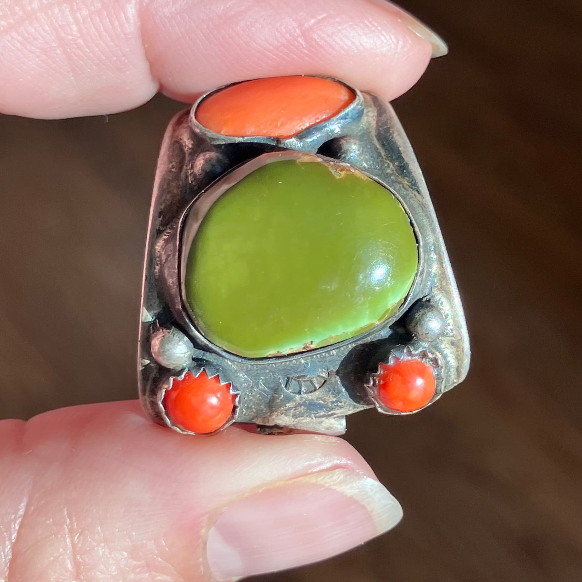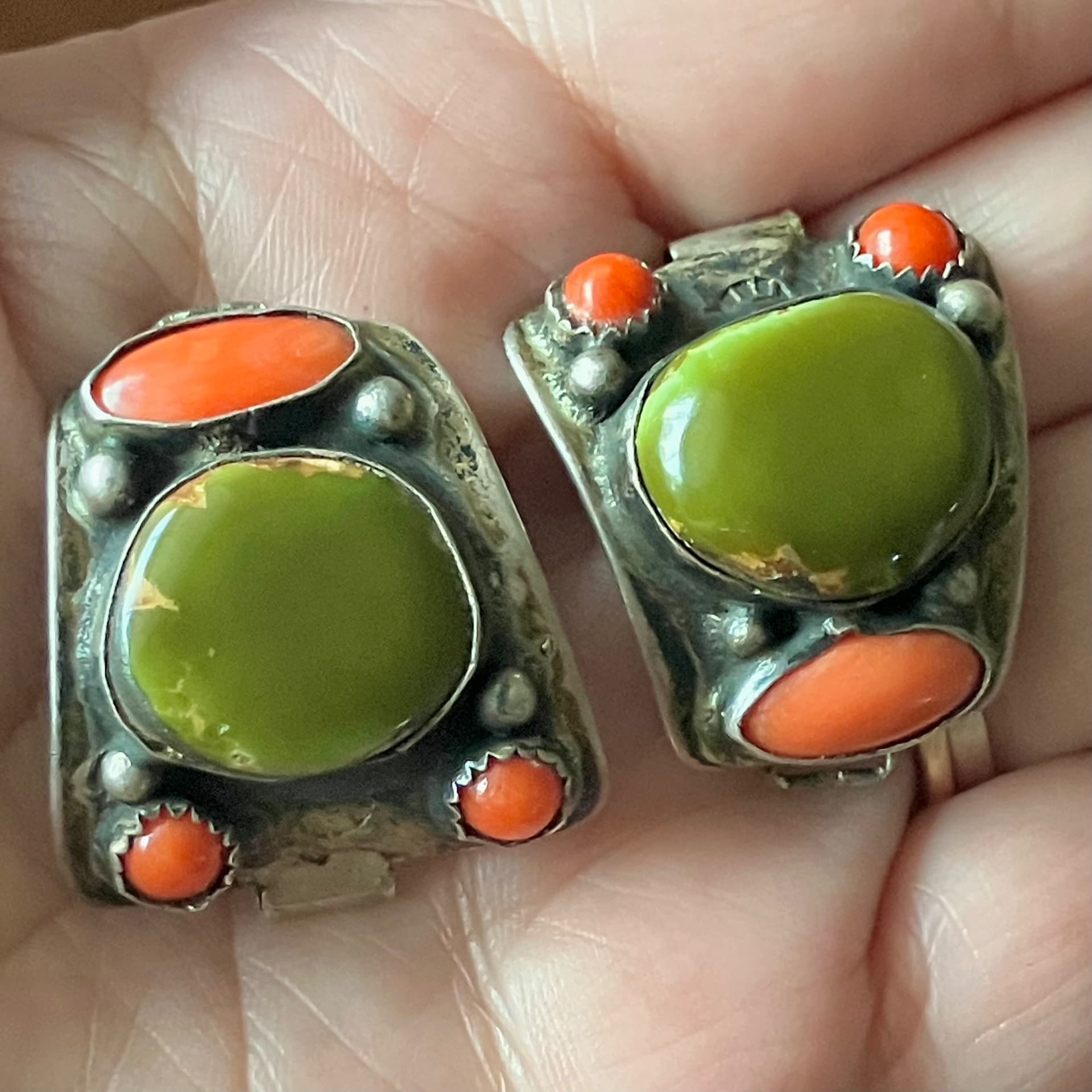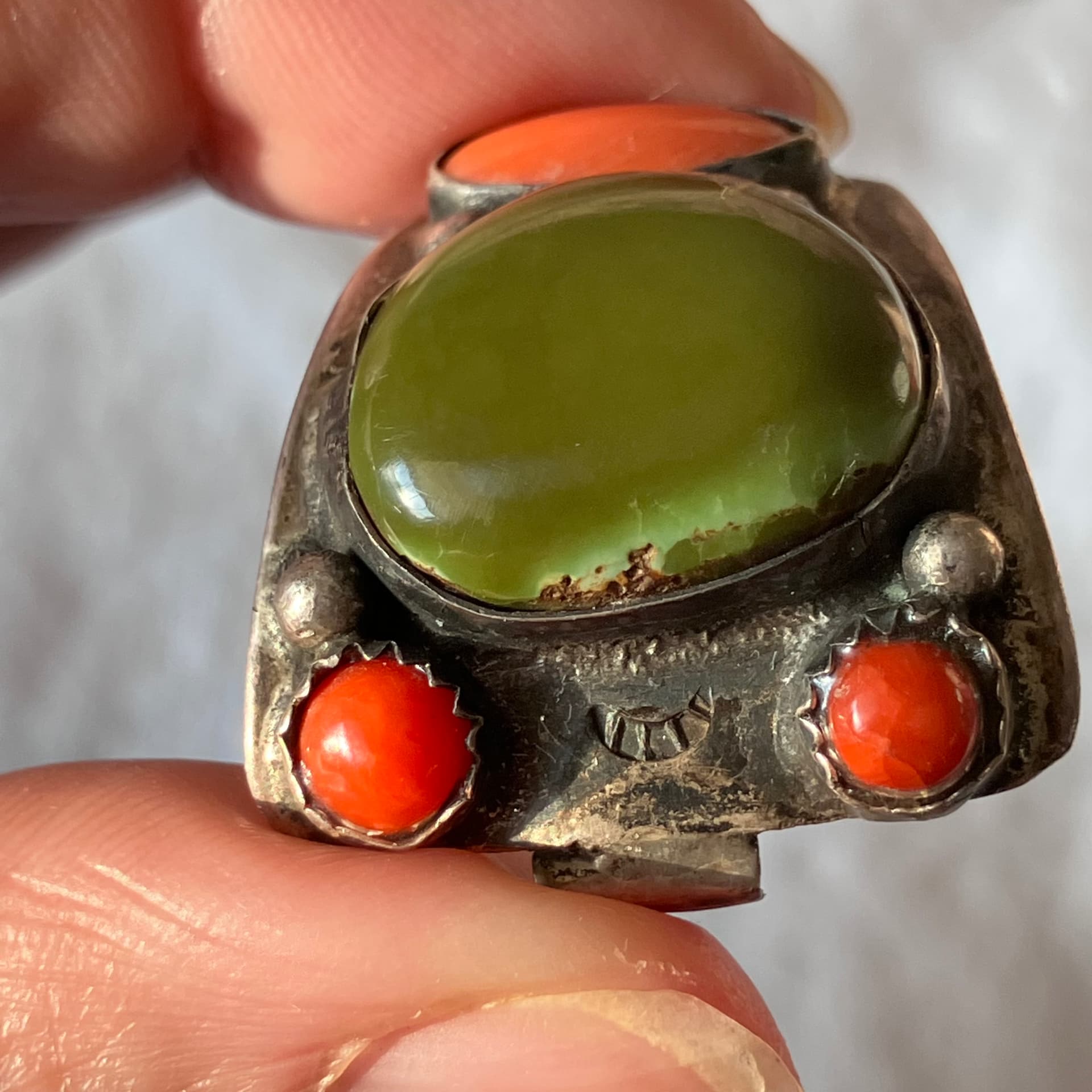@Zippy528 Hi ~ I’m not so sure that’s a hallmark on the front side of the watch tips. Looks to me to be a simple, stamped design. Are there any markings on the reverse of the tips? The green stone may possibly be Green Kingman turquoise. I can’t determine from photos whether that’s genuine coral or not. Anyways, just my 2 cents.
