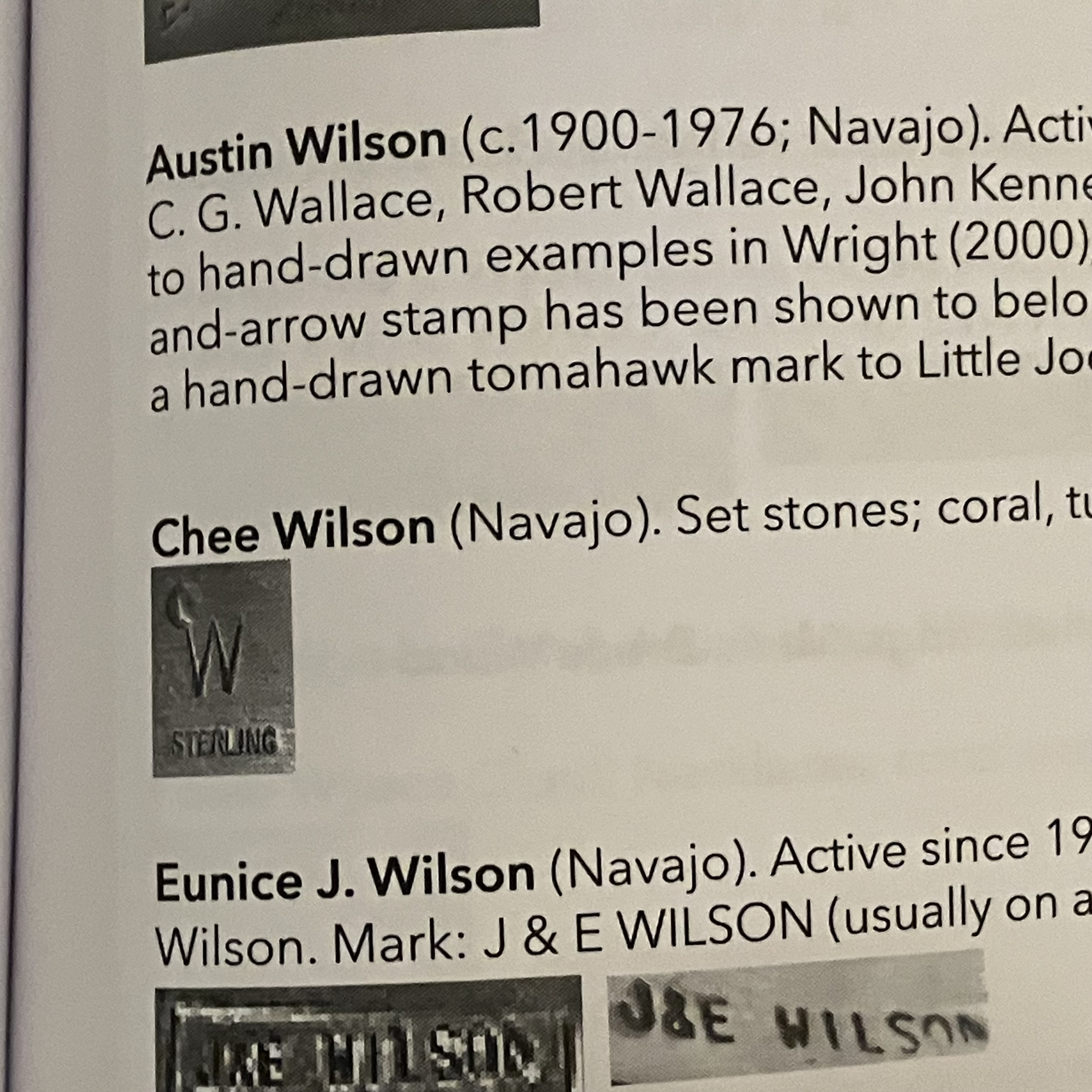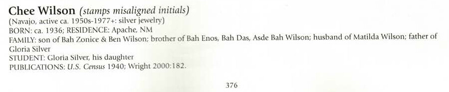 In Bille Hougart’s Native American and Southwestern Silver Hallmarks 5th edition book I found on page 339 the name Chee Wilson but I couldn’t find any other references online. I was hoping someone would recognize hallmark. Thank you in advance.