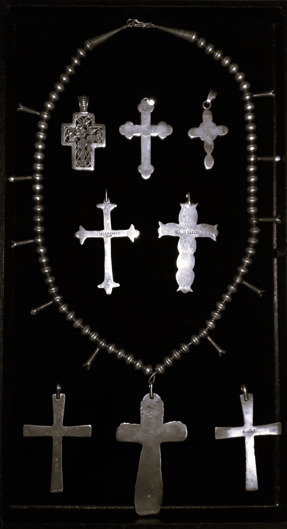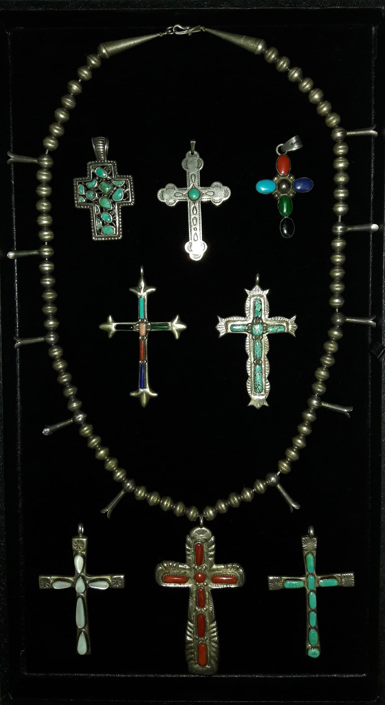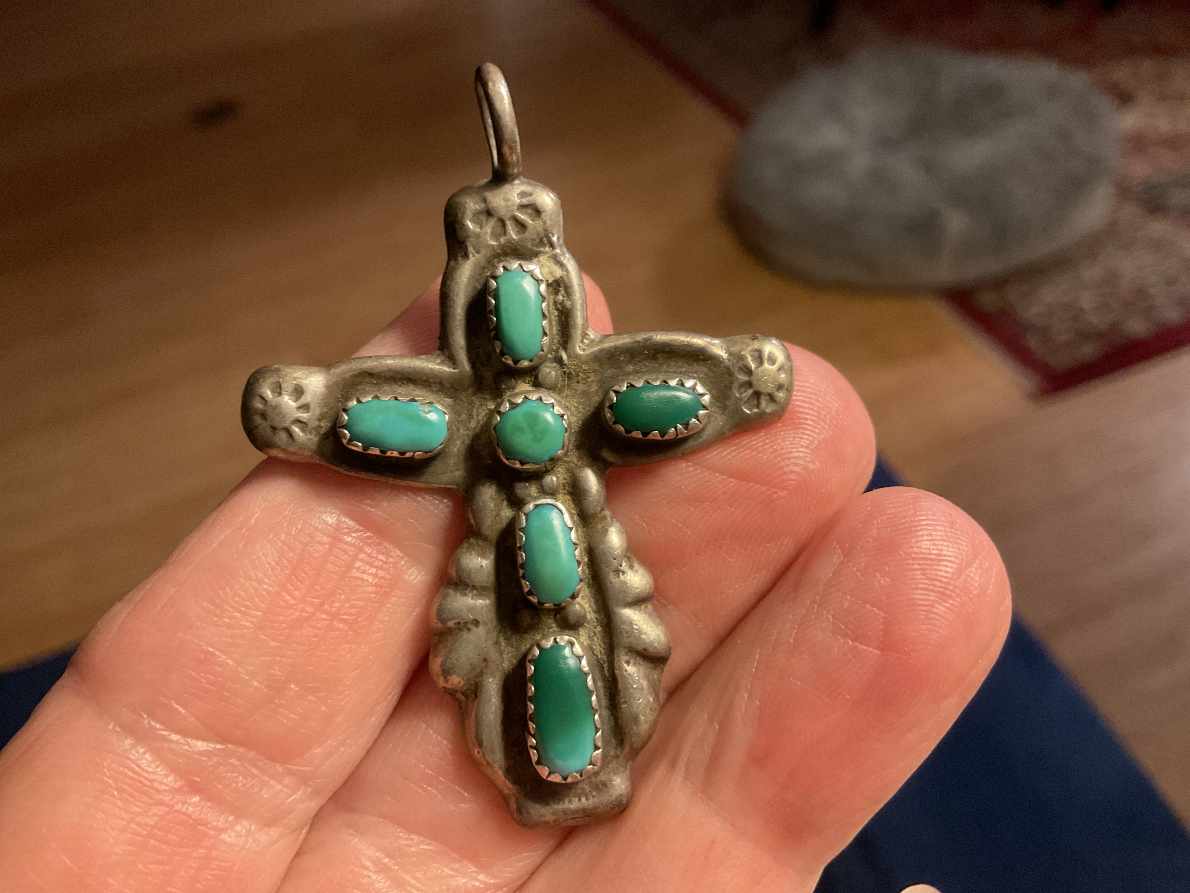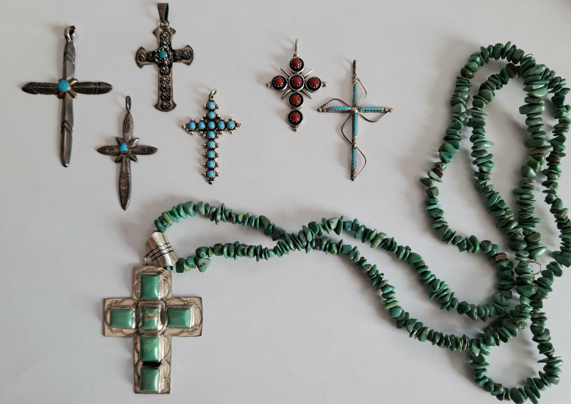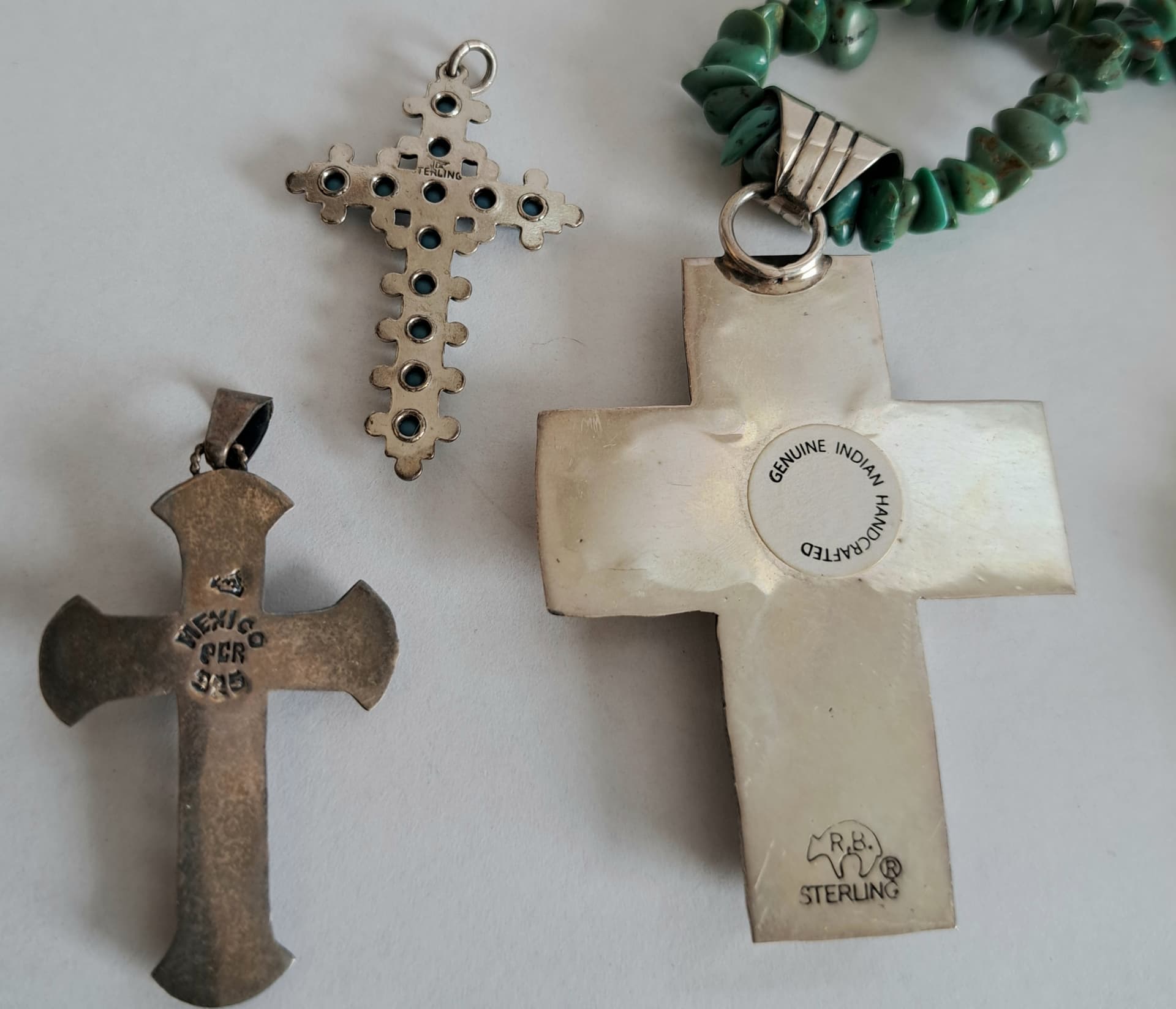 The coral cross & petit point turquoise cross were purchased almost 20 years ago at one of the gift shops in Yellowstone NP. The only crosses hallmarked, in any way, are shown in the 2nd photo. I didn’t remember I had this many, lol. So much jewelry tucked away…
