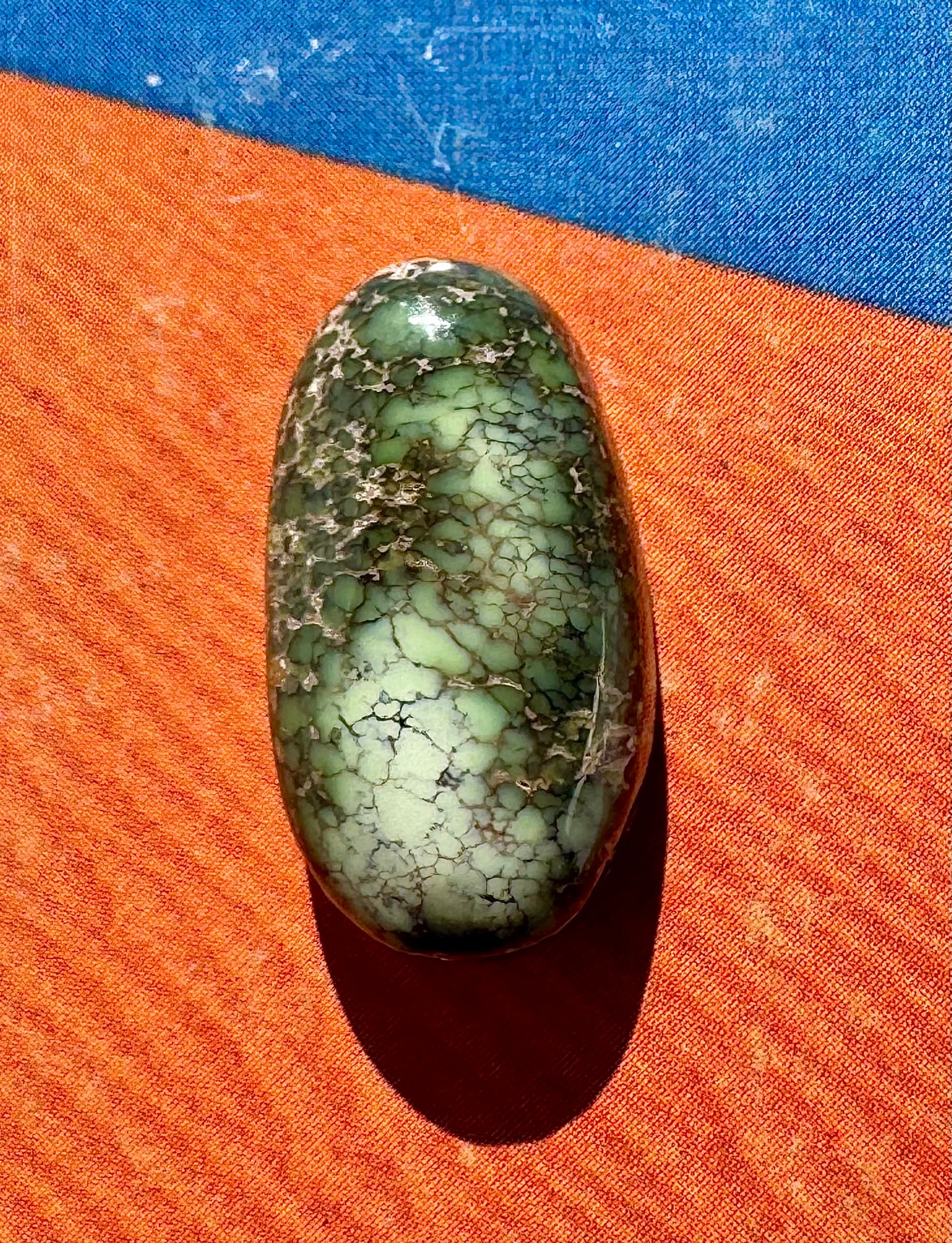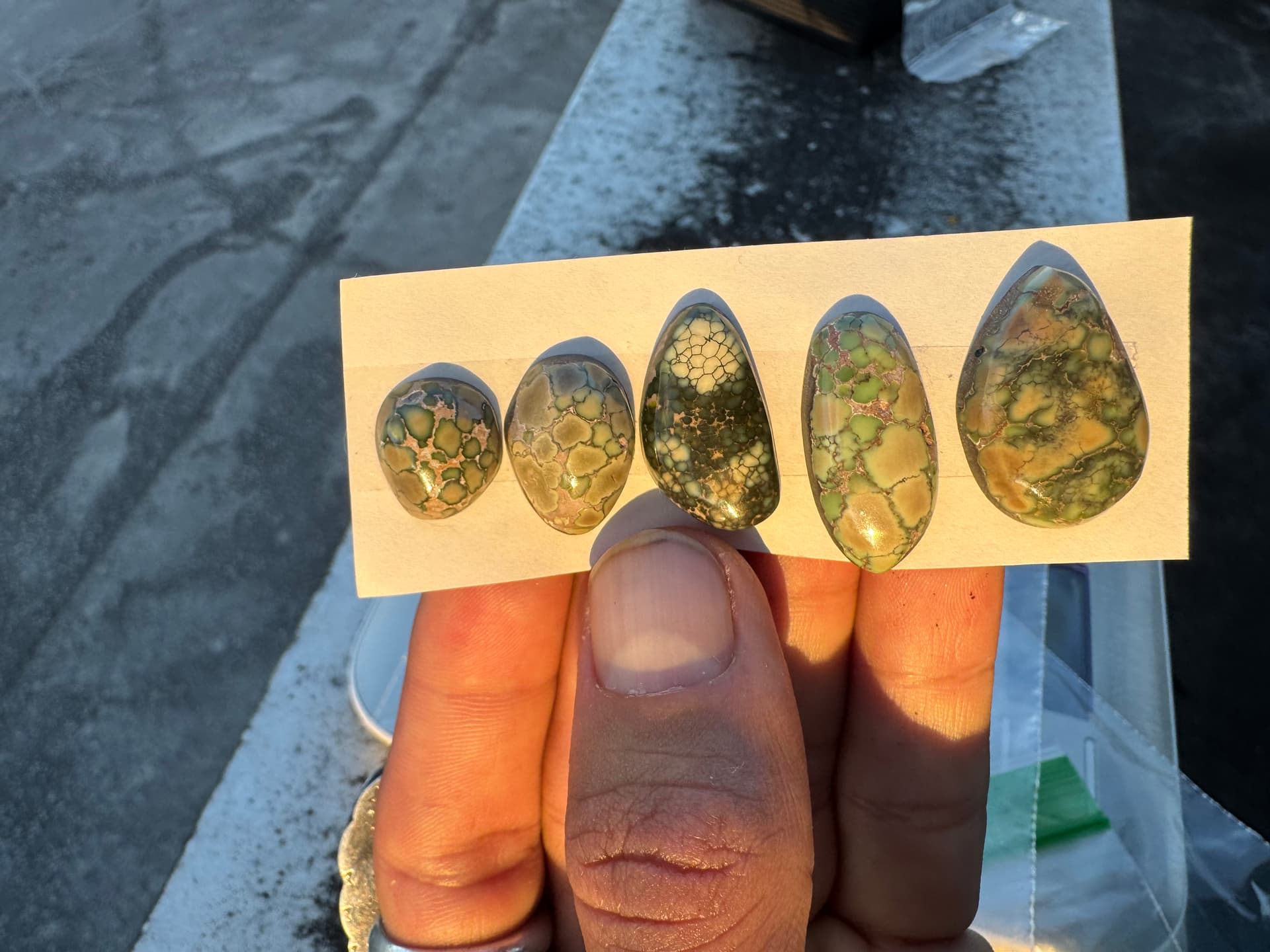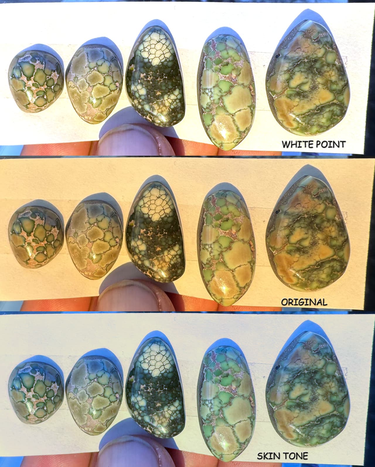 It is in natural daylight….but I hear you, I’ll get a more zoomed in photo that actually shows the polish/reflectiveness, and the other cabs that look more obviously like variscite. No one was trying to rip me off, i got them for very little from a woman emptying out an entire stash and she made no claims, and yes my cuff and ring that look similar have provenance, this does not IE why I am asking. I own Tony cotner material myself, I am not a total noob here….