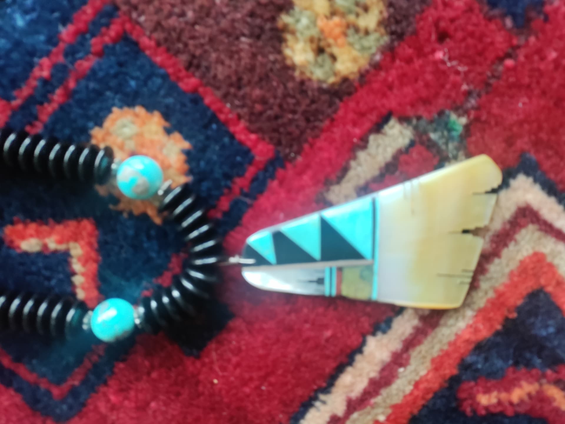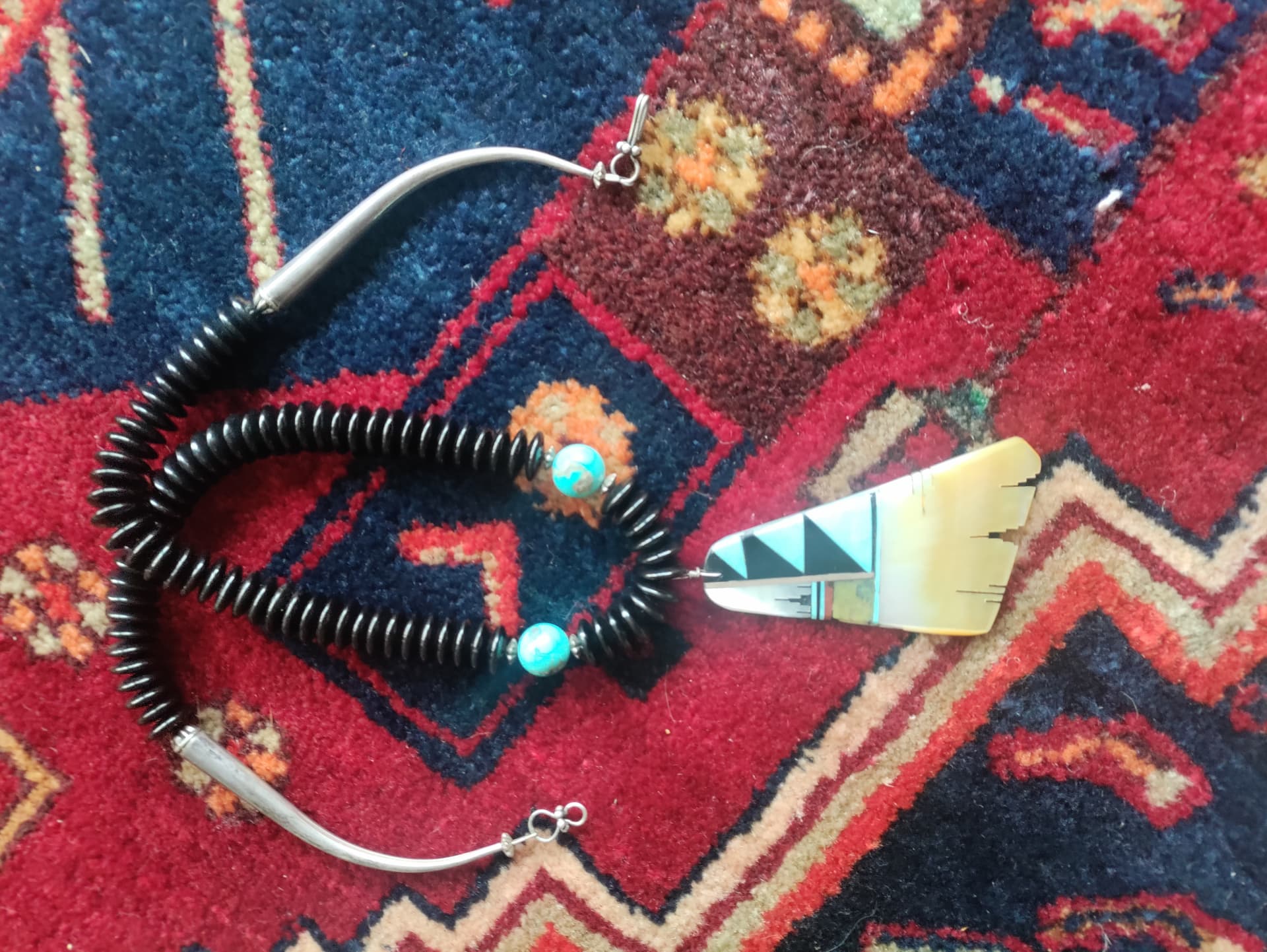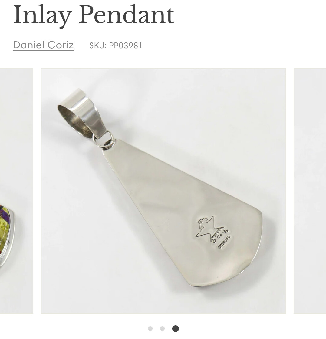 I agree that the necklace includes imported components. Those small silver-toned spacers are Thai bead-supply store bits, for ex, with probably Chinese rounds in turquoise color that may be non-turquoise, I can’t tell from these pics. Also the flattened black disks are a material and kind that’s hard to decipher from the photos. Most importantly, this doesn’t resemble Daniel Coriz’s hallmark, level of work, nor his style. The pendants known to be by him are meticulously cut inlay within a sterling silver base and framing, with a substantial sterling bale.