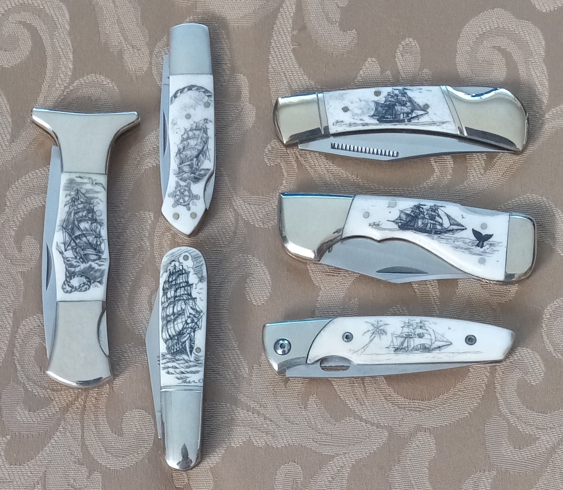 Here is husband’s knife collection. They are all bone. All were purchased on Maui, made by local artisans. Maui was once a whaling port, and scrimshaw is a cottage industry there.