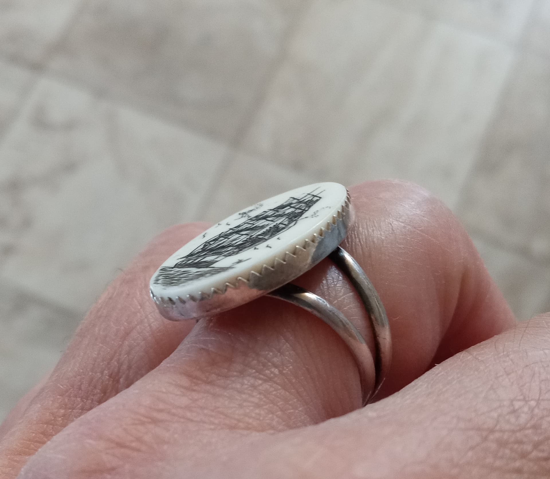 I forgot about this ring…I bought the scrimshaw piece loose, and mounted it into a sterling ring for myself. It is bone also.