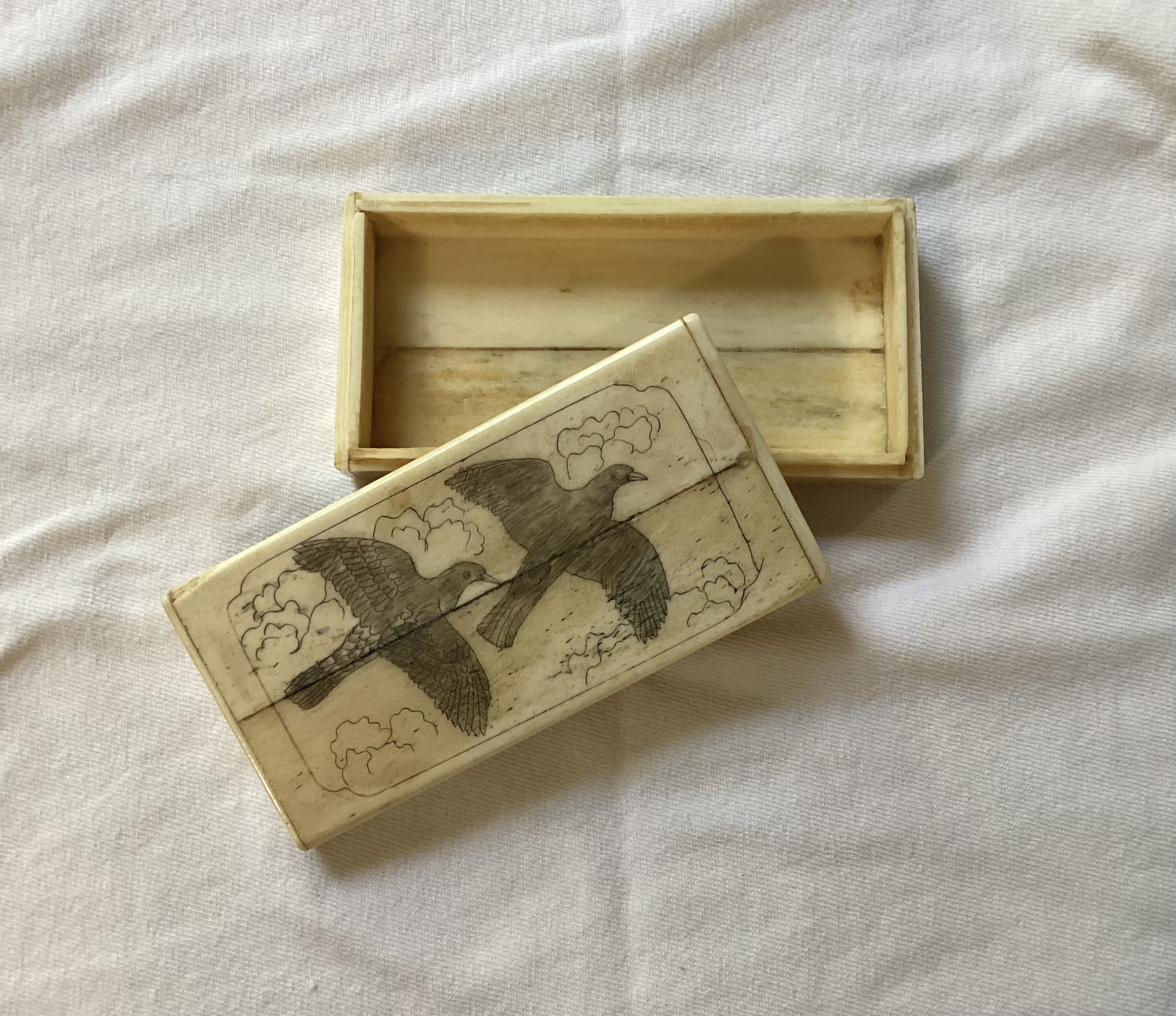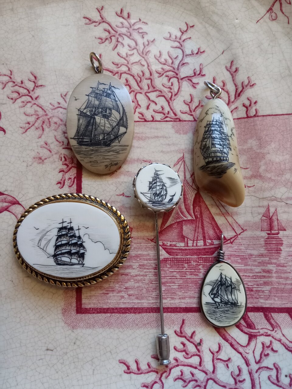 It is my understanding that scrimshaw is carving, etching or engraving done in bone. Yours looks like the silver or pewter is attached to it? So I don’t think it’s technically scrimshaw, although it does look like there’s some etching in the trim around the silver. But it’s really cool!