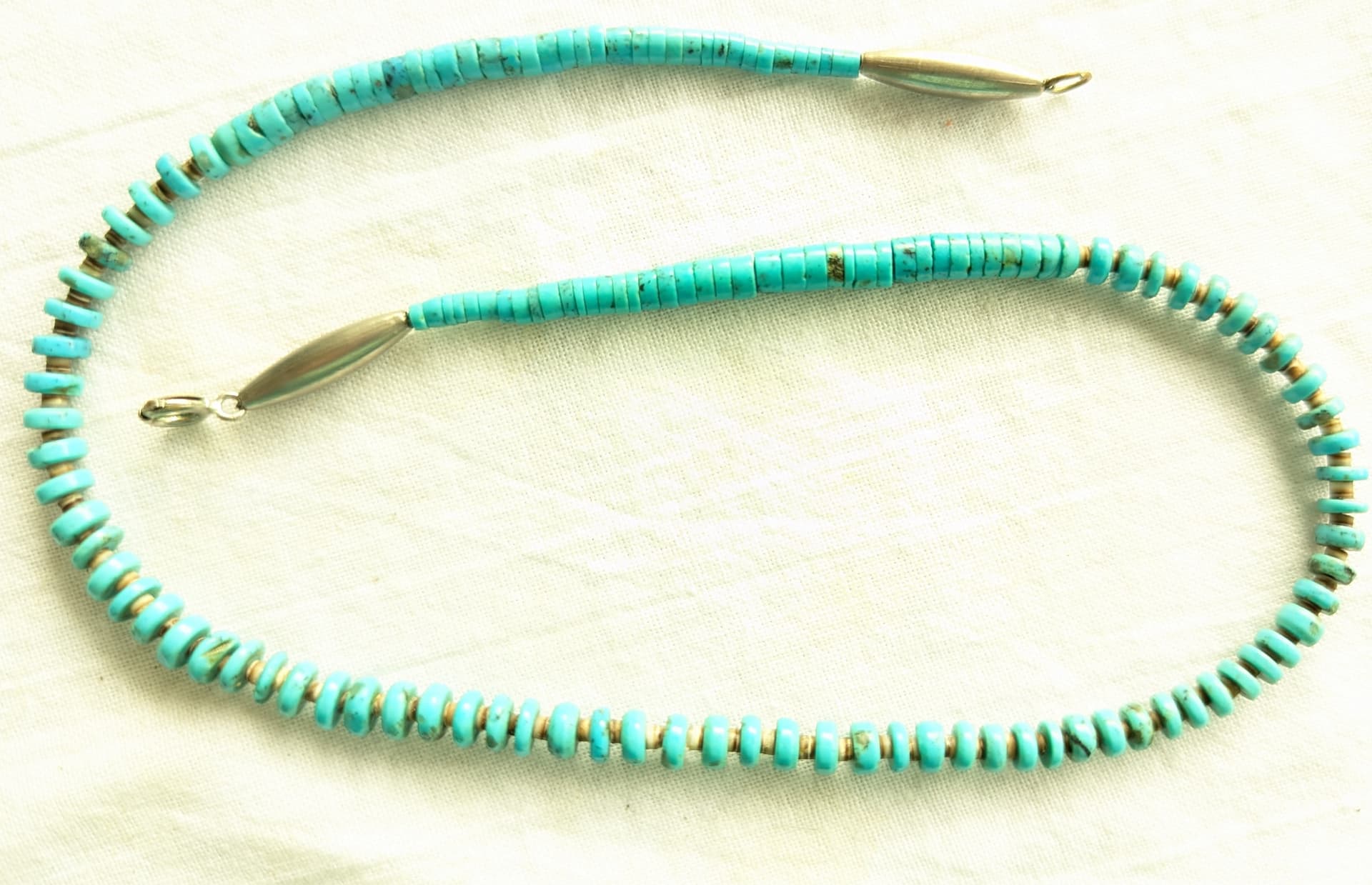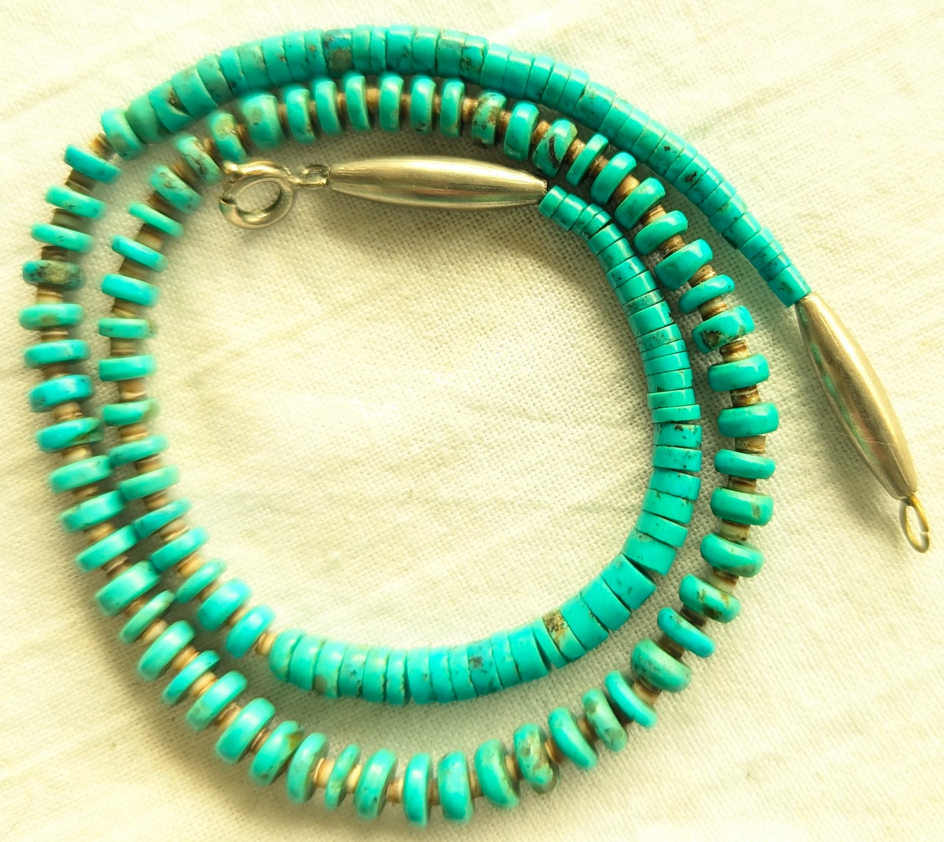 In my opinion the beads in your necklace appear handmade. Interesting that both simple cut turquoise beads and chamfered beads are used. It wants to be NA…with the interspaced heishi between the chamfered beads etc., but I agree that the spring clasp is somewhat atypical. Although I have seen this clasp used in known NA necklaces, I always worry when I see them.
