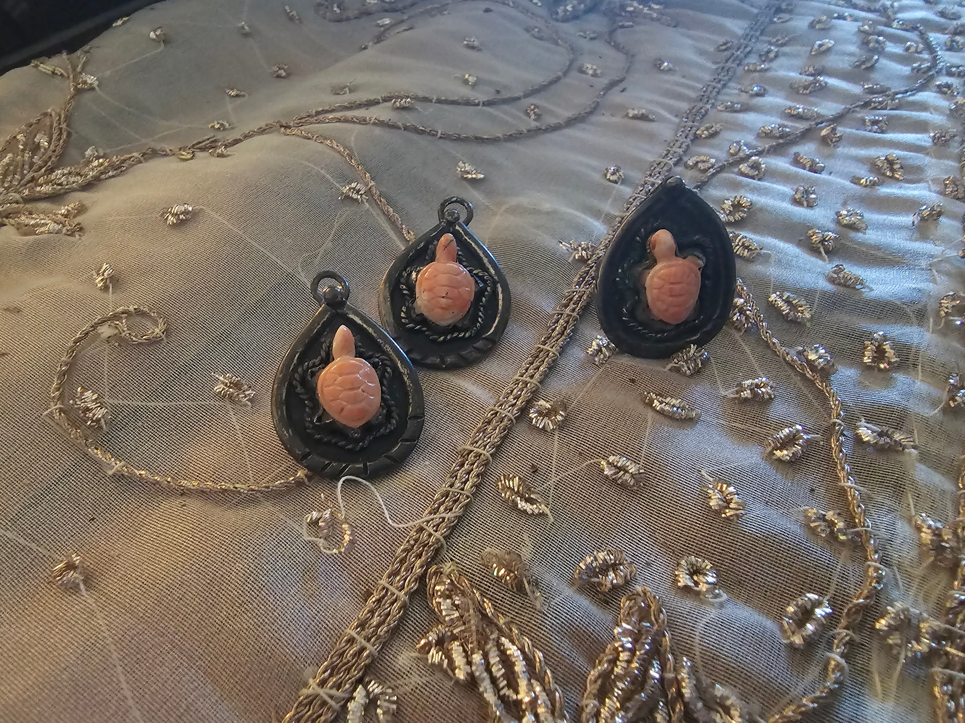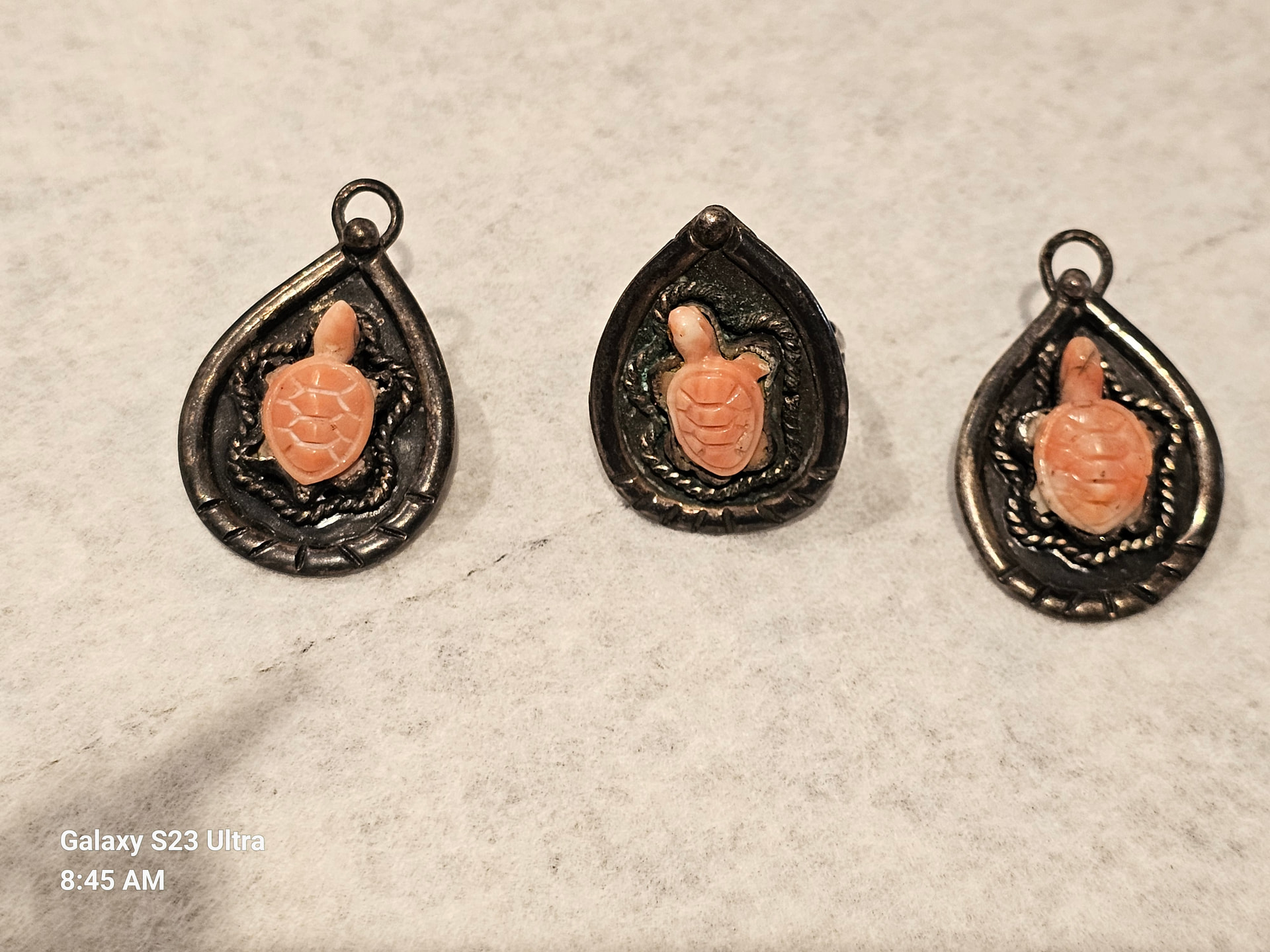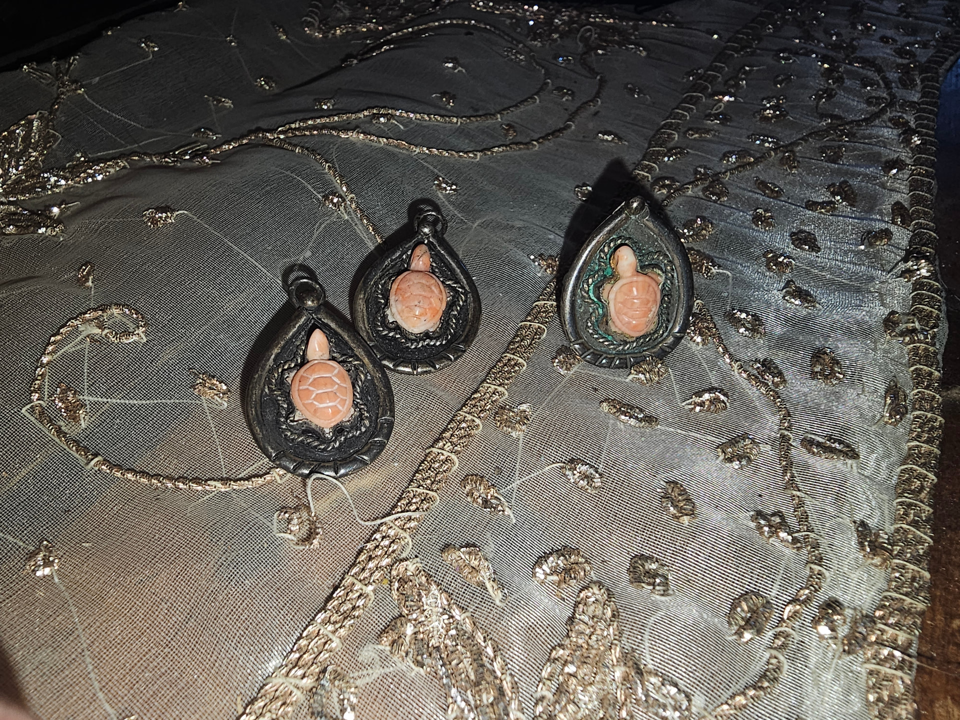 These photos are better! I’m thinking the turtles could be carved pink coral. And the earrings with the loop at the top are interesting. I’ve not seen any pieces similar to these, but they are certainly a Native American style.