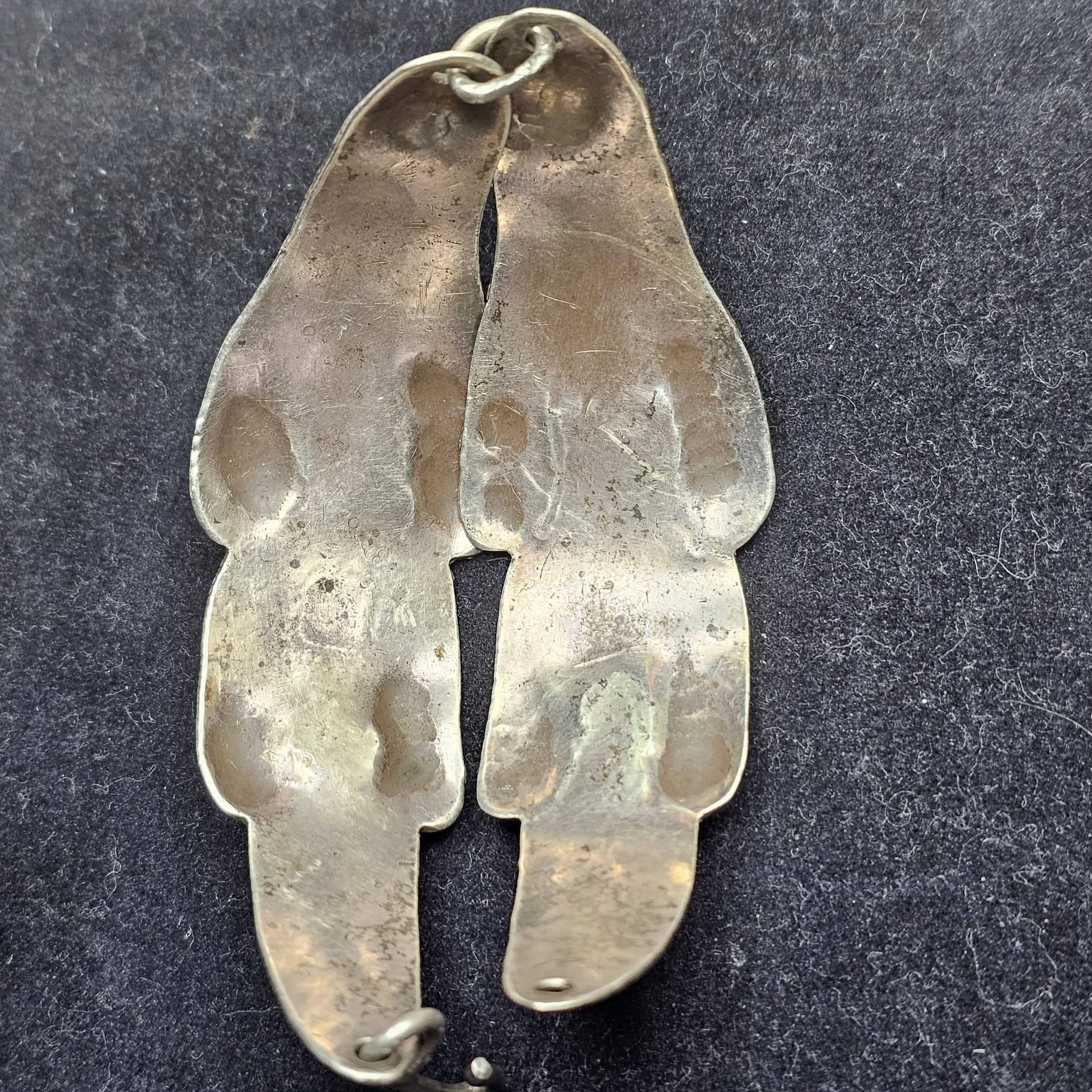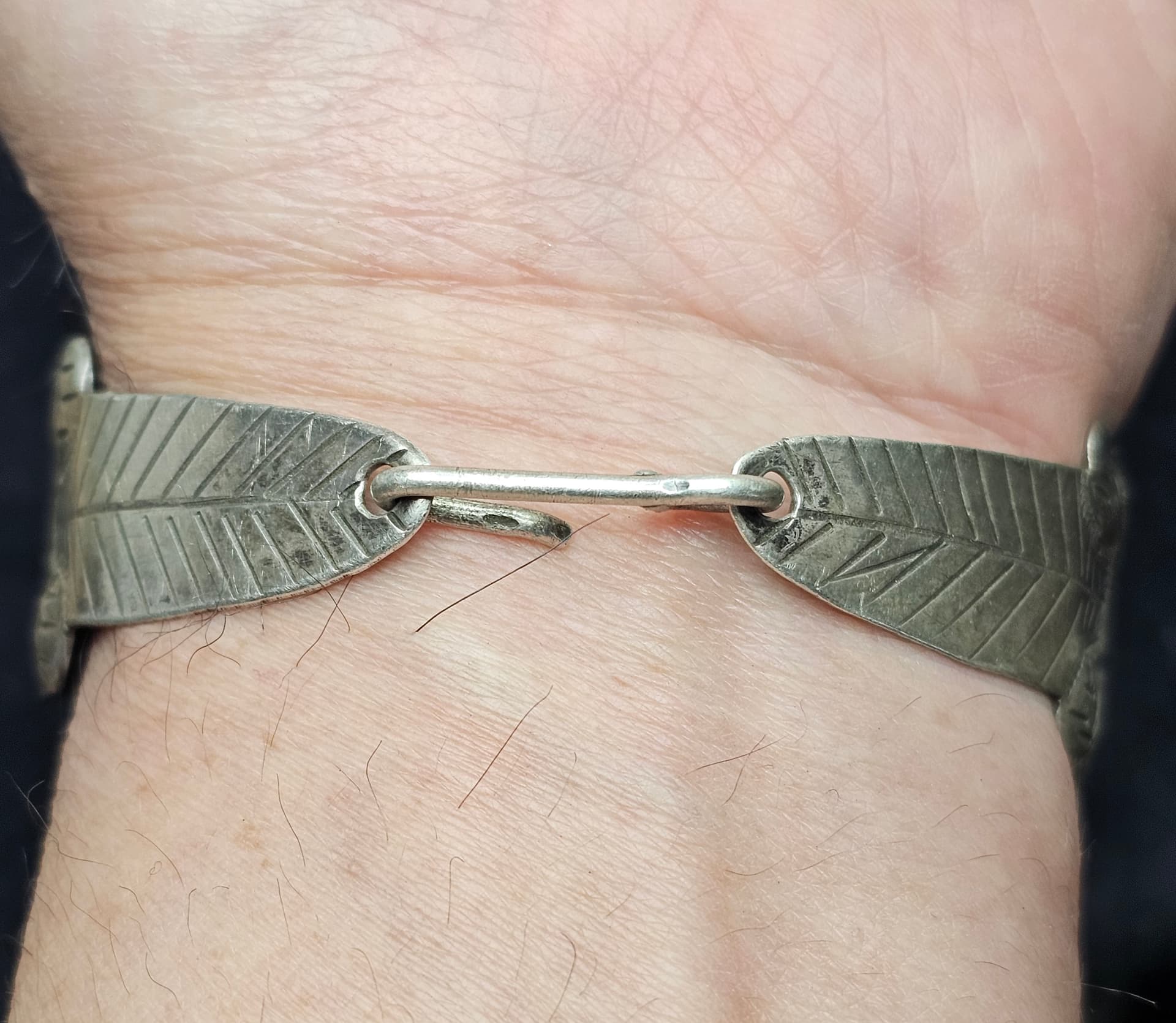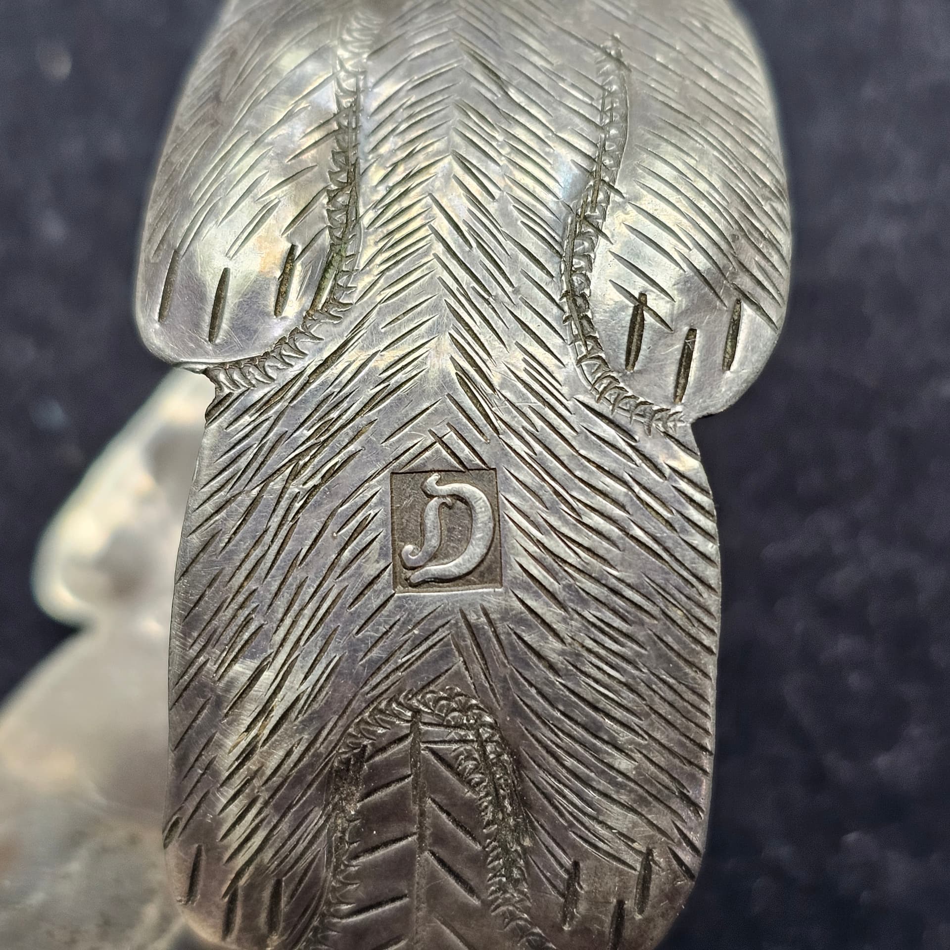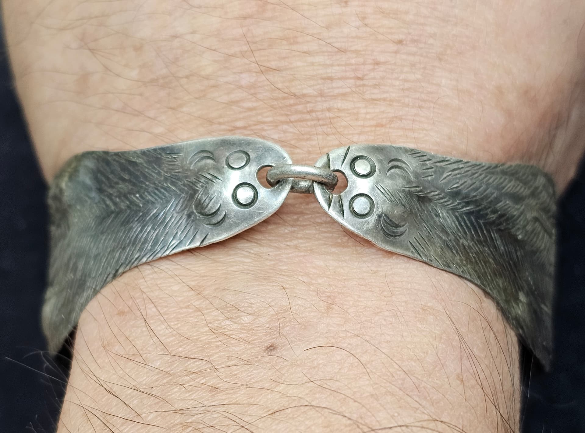 I really like this bracelet & find it intriguing. I spent a fun hour researching beaver, otter, First Nations and fur trade jewelry. (I’ve never heard of fur trade jewelry before.) I came up with nothing even remotely similar to this bracelet. The jump ring & closure look handmade so that doesn’t help me with an age range, either. I’m now wondering if this could be a one-of-a-kind piece of personal jewelry made by a silversmith for his or herself? I also find it unusual that a hallmark would appear on the outer side of the jewelry. Perhaps it’s like an ID bracelet & the “D” stands for David or Diane. IDK. Just my (long) 2 cents worth on this topic.