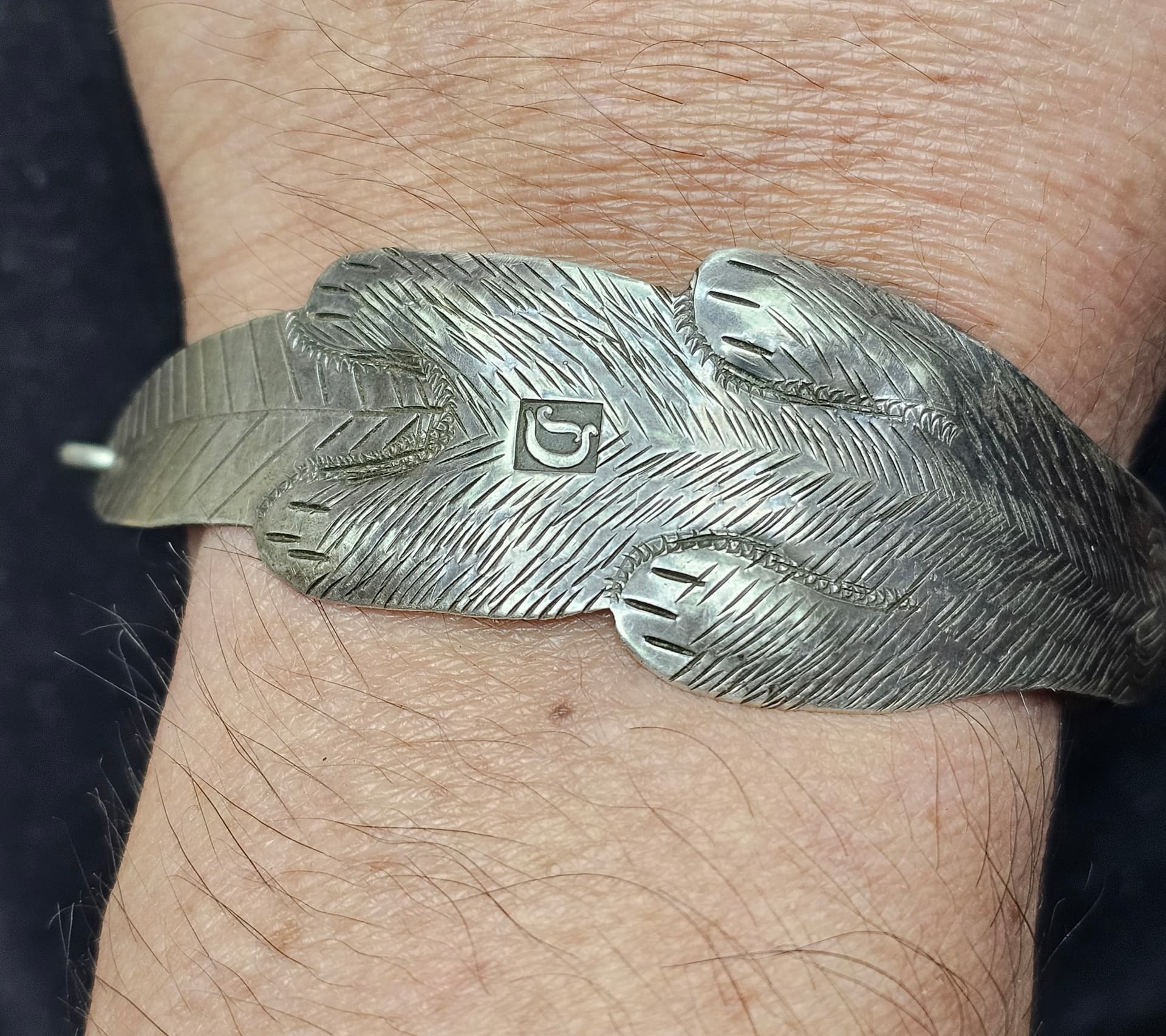 Hi, no I have not. Which doesn’t mean a lot – my “First Nations silver” experience mostly runs to Vancouver Island and mainland British Columbia. This doesn’t look local to those areas, and I don’t know the “D” monogram. (I did take a peek in the book Understanding Northwest Coast Indigenous Jewelry for this mark, but I didn’t find it. That’s unsurprising, as the mark of silversmiths out here is usually their initials, etched by hand.)