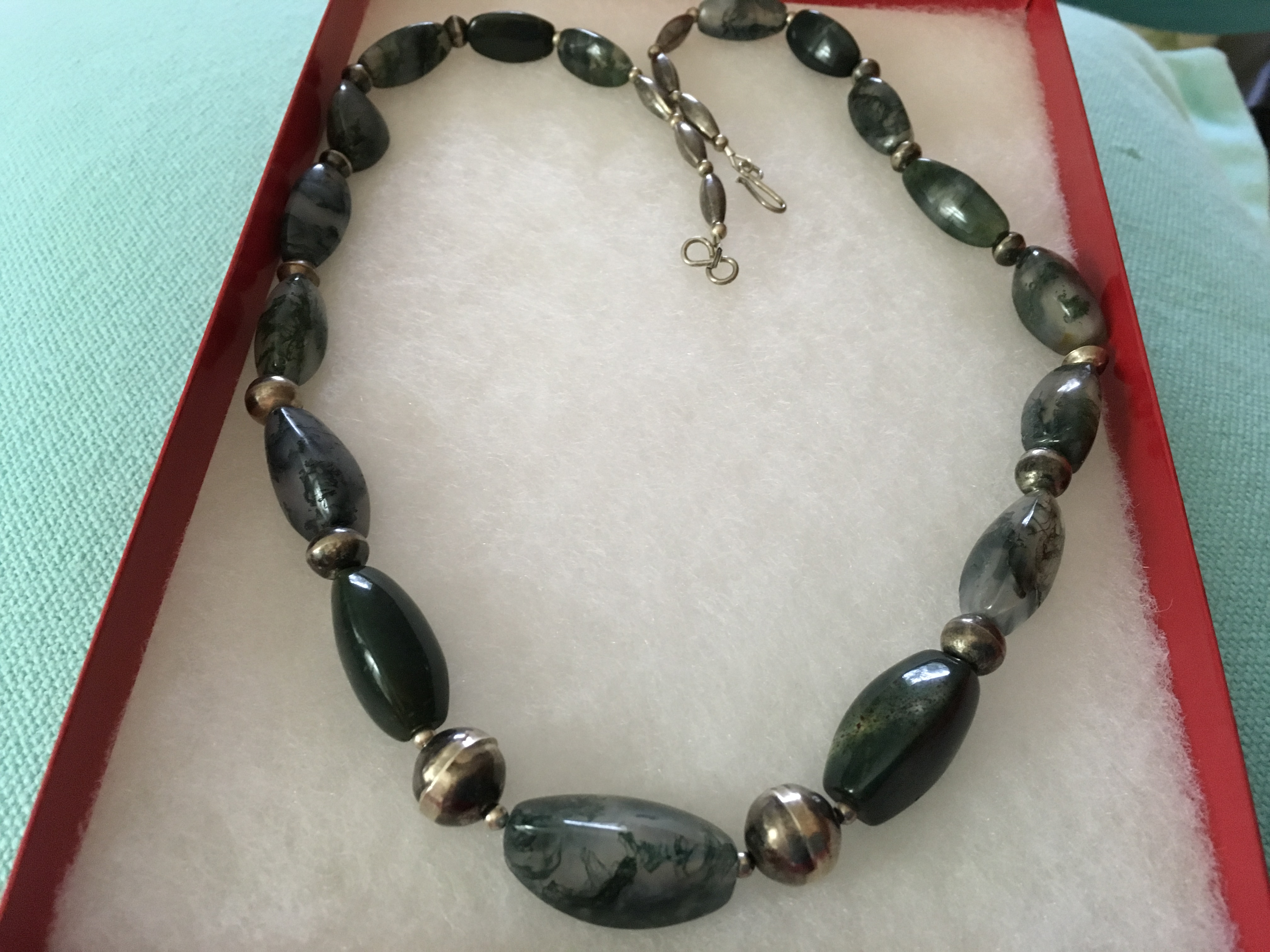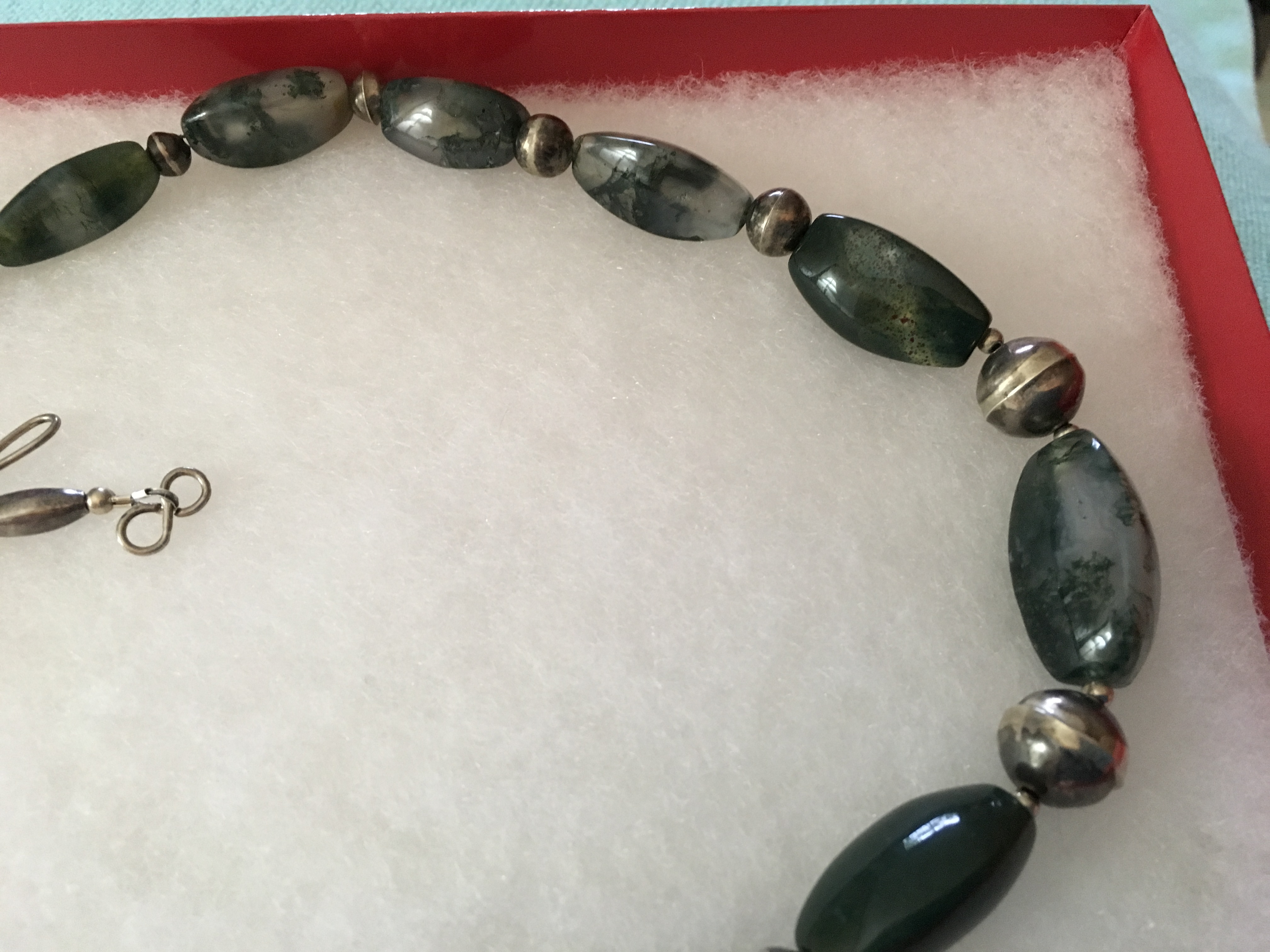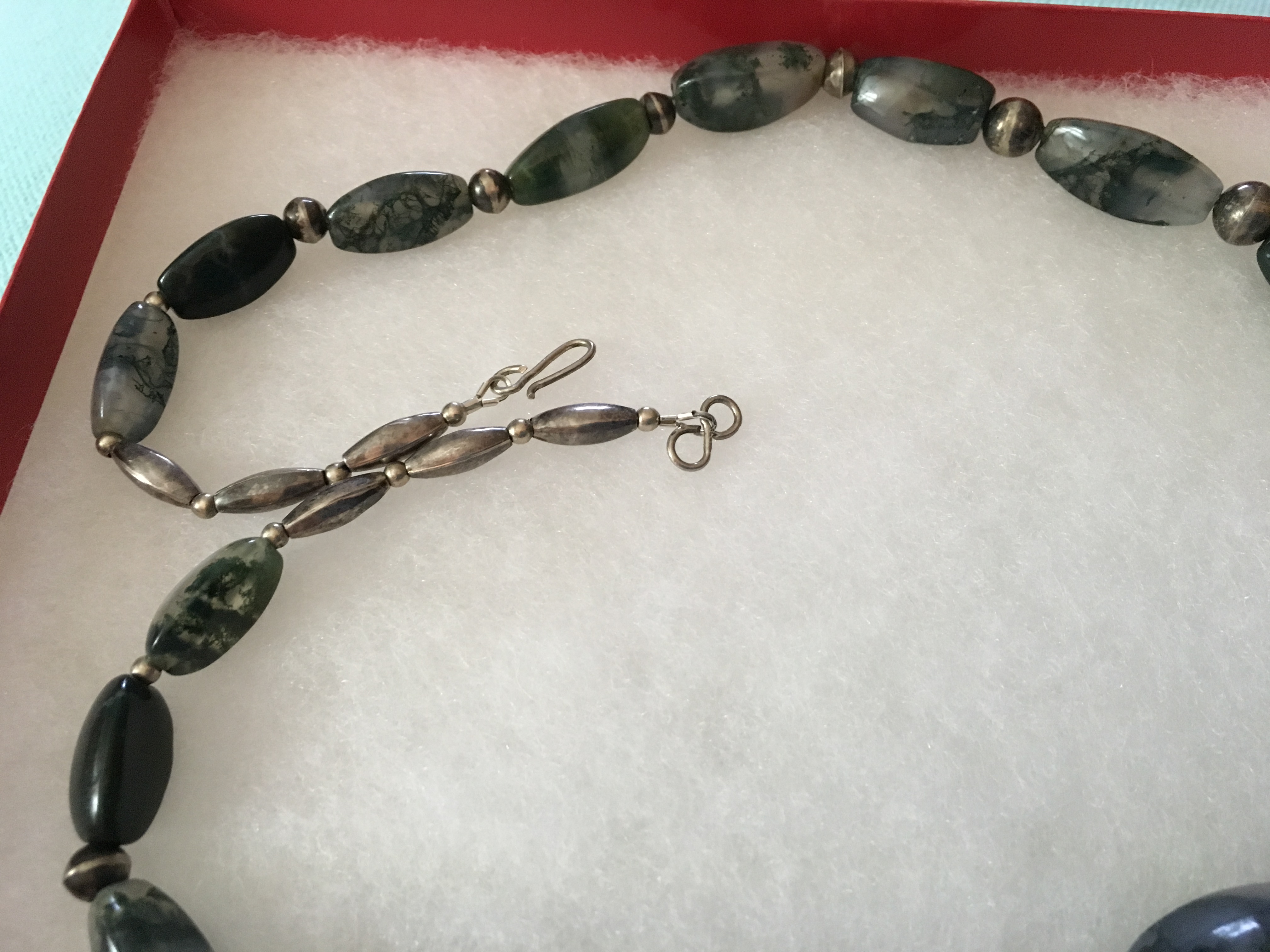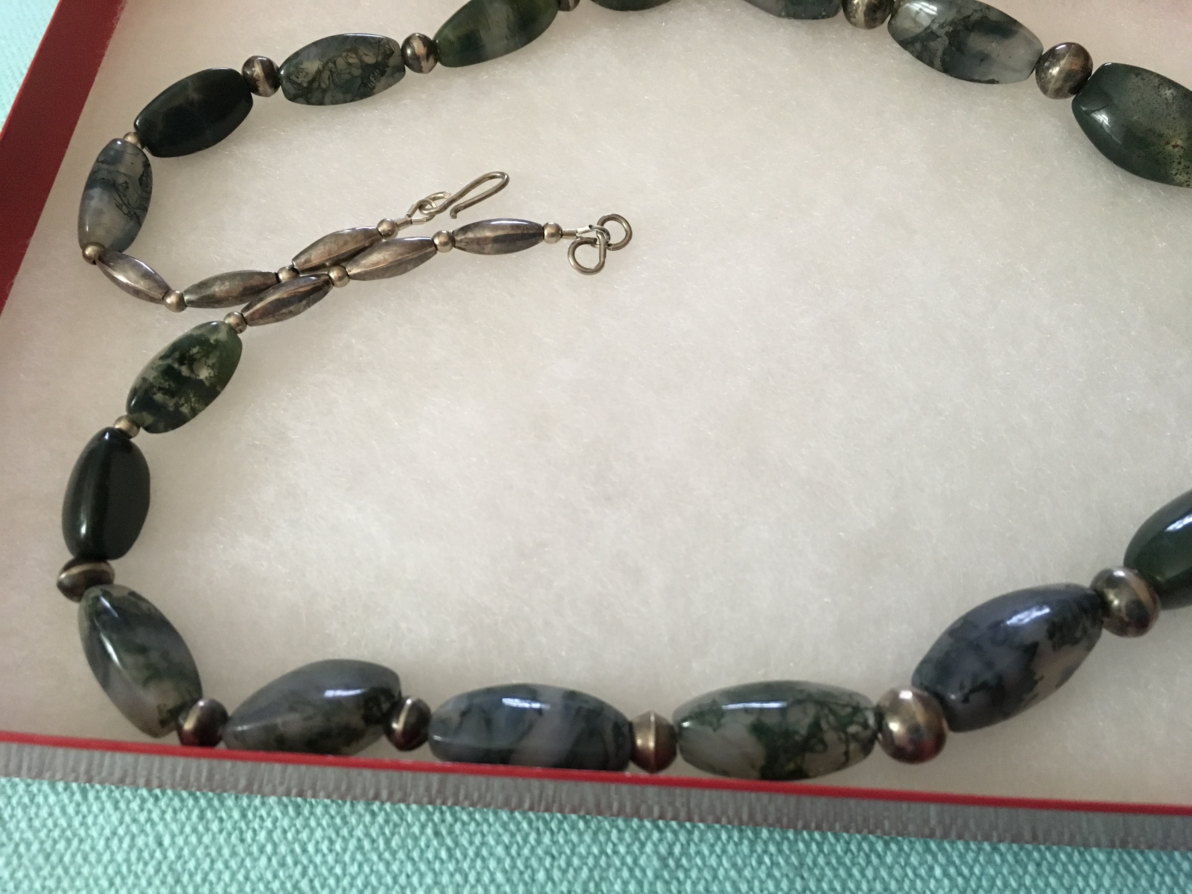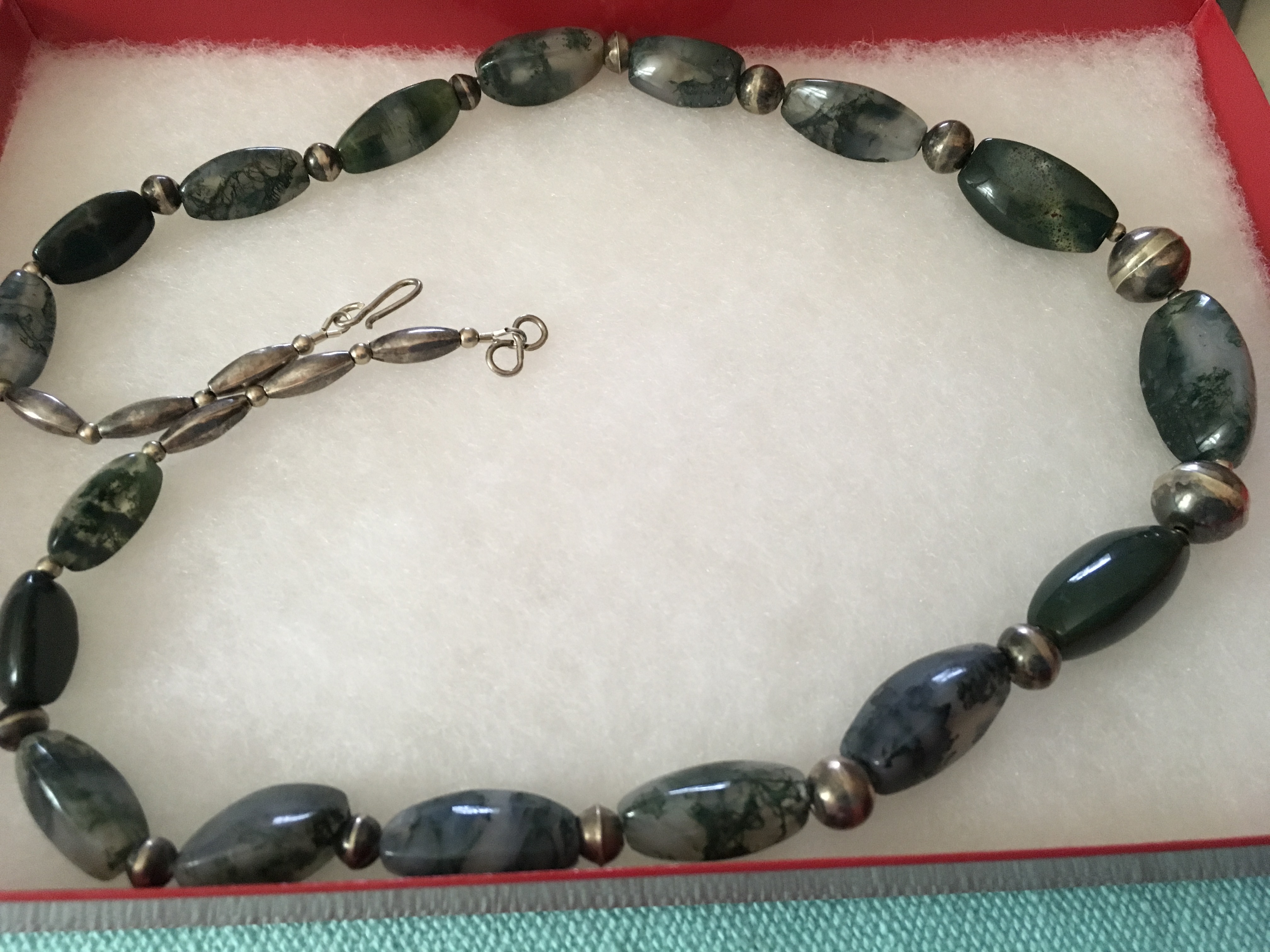 I bought this necklace recently and it was advertised as 1940’s Native American Moss Agate necklace that had been restrung. I wasn’t convinced about that part but I had been wanting a piece of MA jewelry and the stones were nicely matched and visually pleasing so I bought it.