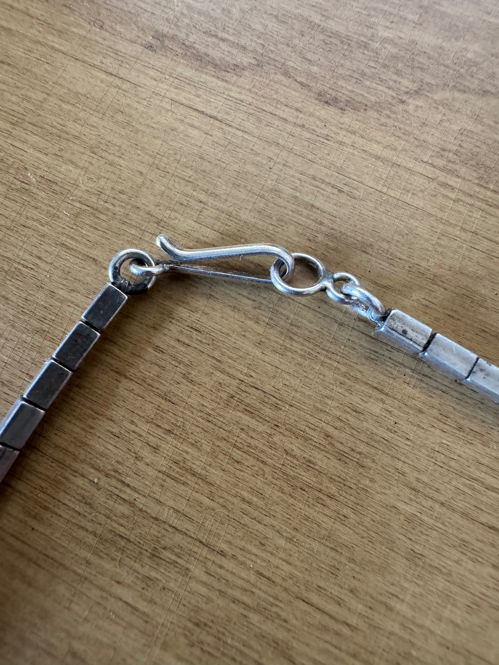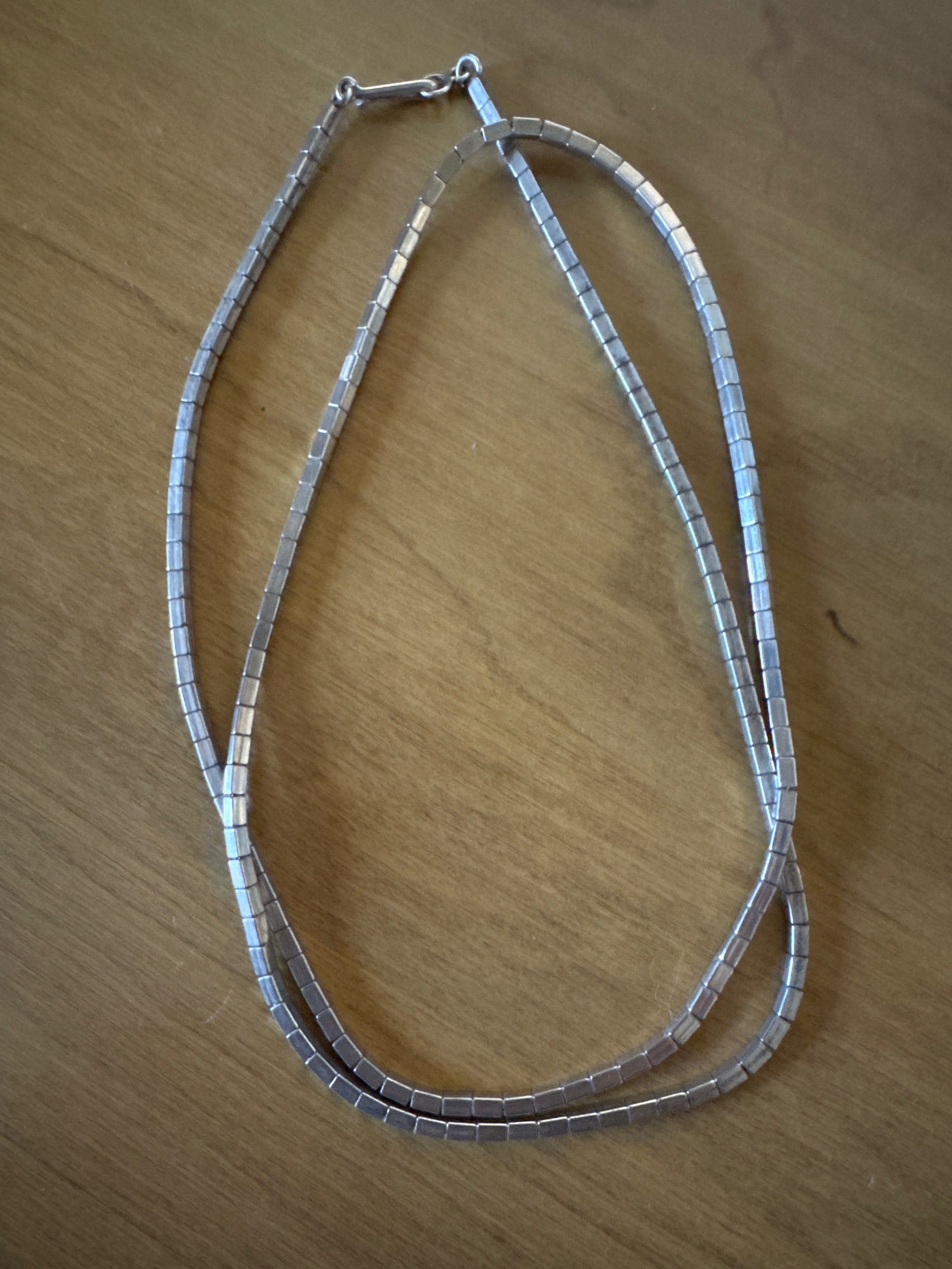 Yes @chris, I have no doubt yours is by Ed Aguilar. He Is known for his hand pulled bead chains. Ed made round tubular chains, but came to be known for his signature square chains, referred to as the “Aguilar Chain”. He was self taught and to my knowledge he is the only person who did this technique. I have several of Aguilar chains which I wear frequently. He made the hand pulled bead chains in both silver and gold; the cutting and stringing required a great deal of time effort and patience. I’ve only seen the square beads in silver. Ed passed away in the mid-2000s (I’ve seen differing dates); others attempted to make the square beads, but found it too time consuming.