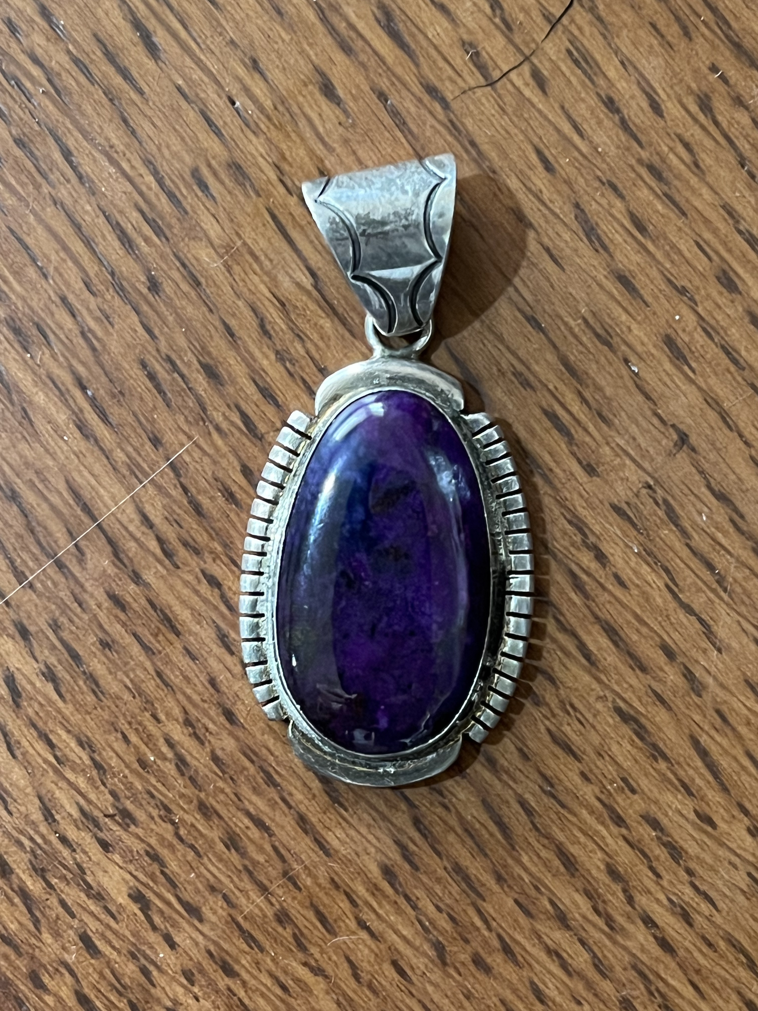 There’s a sizable chunk of gem sugilite that was used for the face in my Esther Wood kachina necklace! I purchased it and had it at home taking pictures when I saw a glint of purple! Prior to that, having seen it only under the stores fluorescent lighting, I thought it was onyx!