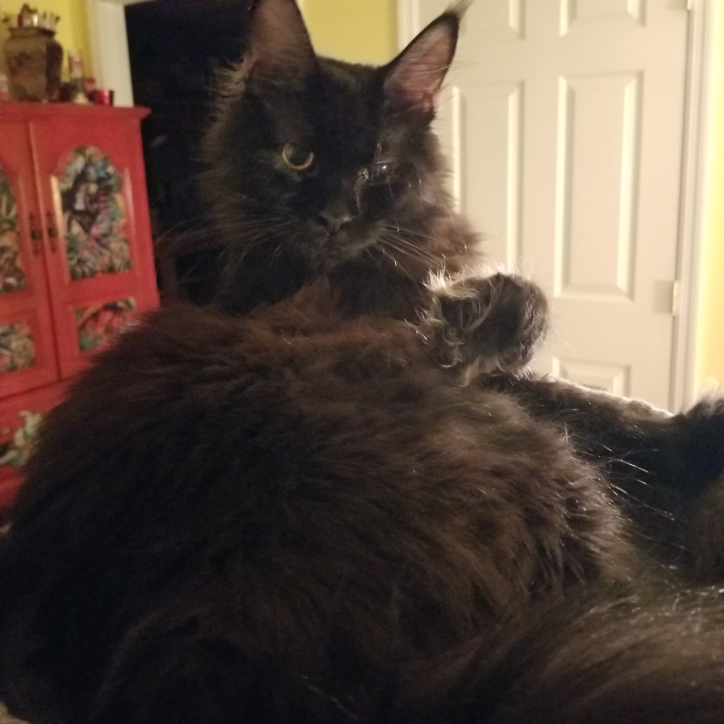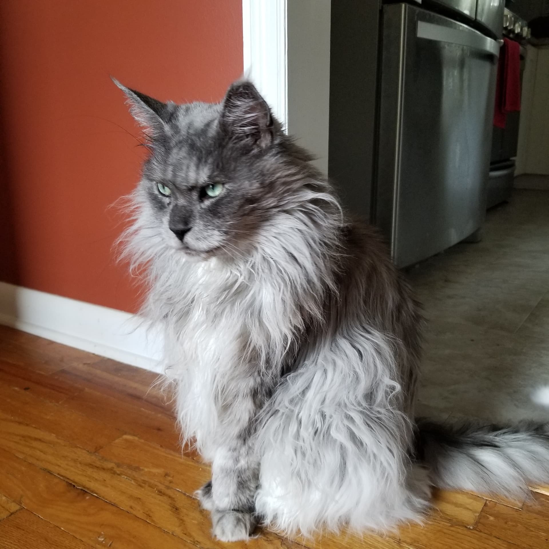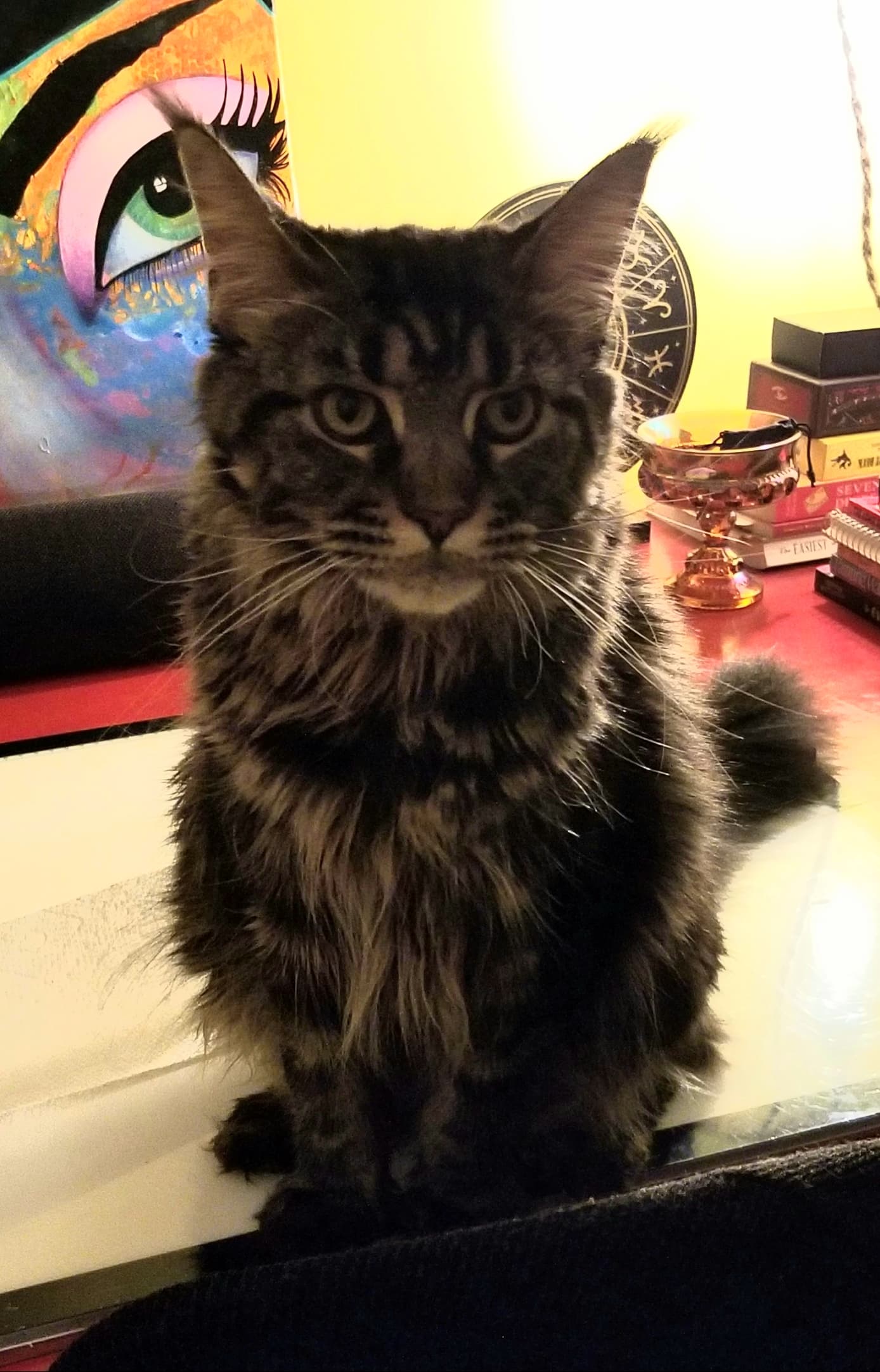 This is Bella. She hasn’t filled out yet with her fluffy face and mane. It takes at least 2 years for Maine Coons to fully mature. She is now as big as Sebastian. Huge girl.