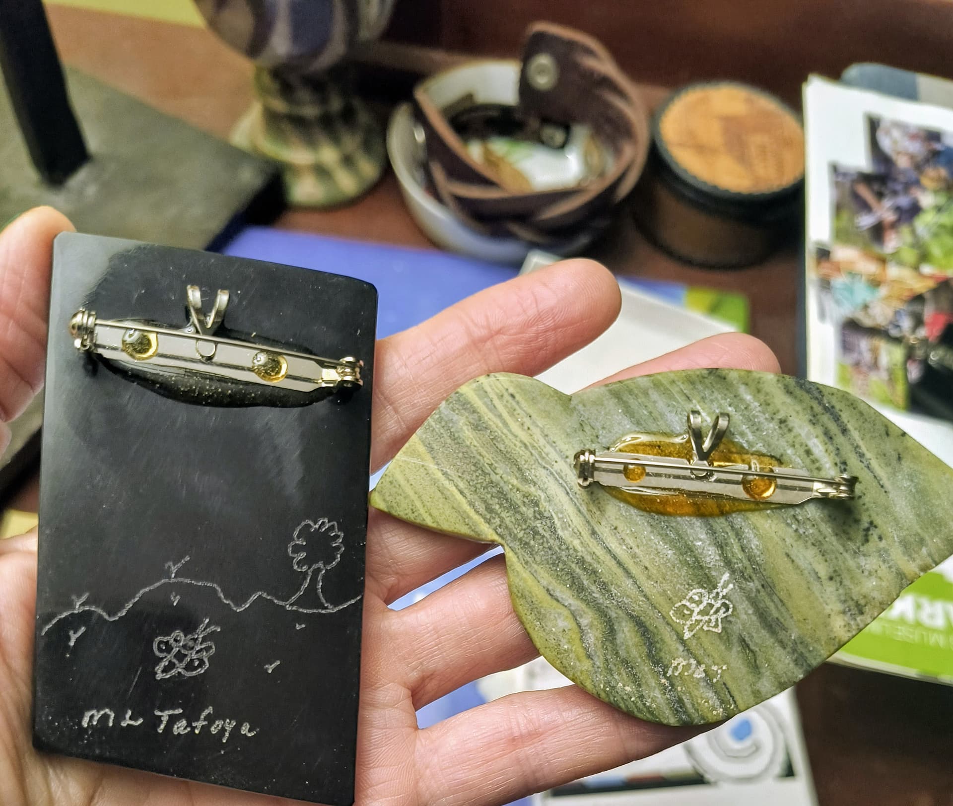 Yes I’m thankful for that! Years ago I dropped (I had forgotten this) one of her other larger pendants on my dresser and the serpentine back completely cracked, but the inlay front was not affected, and it held together. When I saw her the next year at the Eiteljorg I sent it with her to be fixed, and it only cost about 25.00. Her husband said she switched from the serpentine backing to what she mostly uses now for that exact reason. So that may be why this one didn’t crack all the way through. Here’s a pic of how the serpentine looked. The one on the left is the one she fixed.