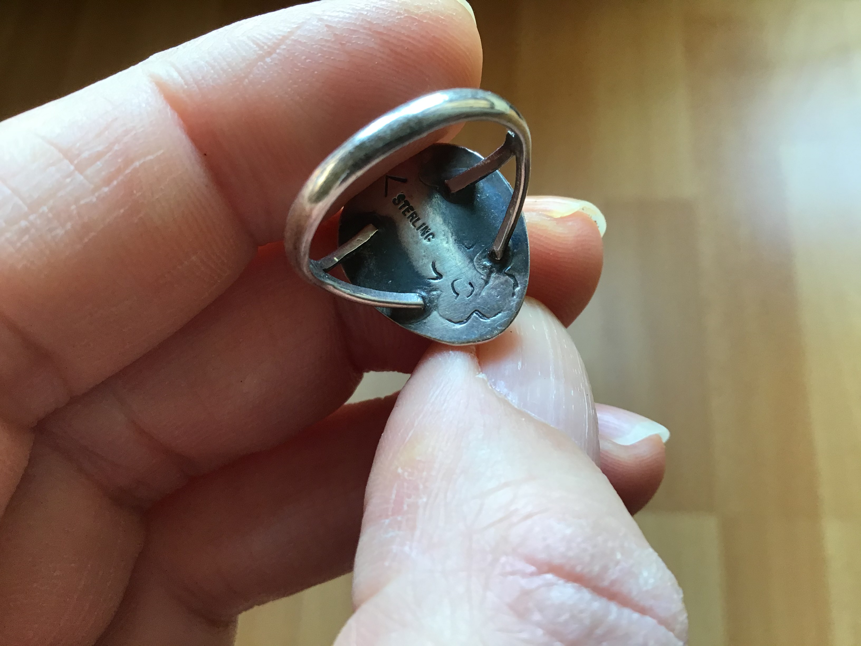 Going back to top photo and matrix rubbing off with damp cloth. Same thing happened with this ring I got yesterday. It smells sweet and cloth turned brown. I thought it was maybe the perfume of previous owner and then I remembered this thread. It was made by Bennie Ration, but extremely thin turquoise over whatever cab is on or the matrix (the cab is smooth, but matrix is dry)