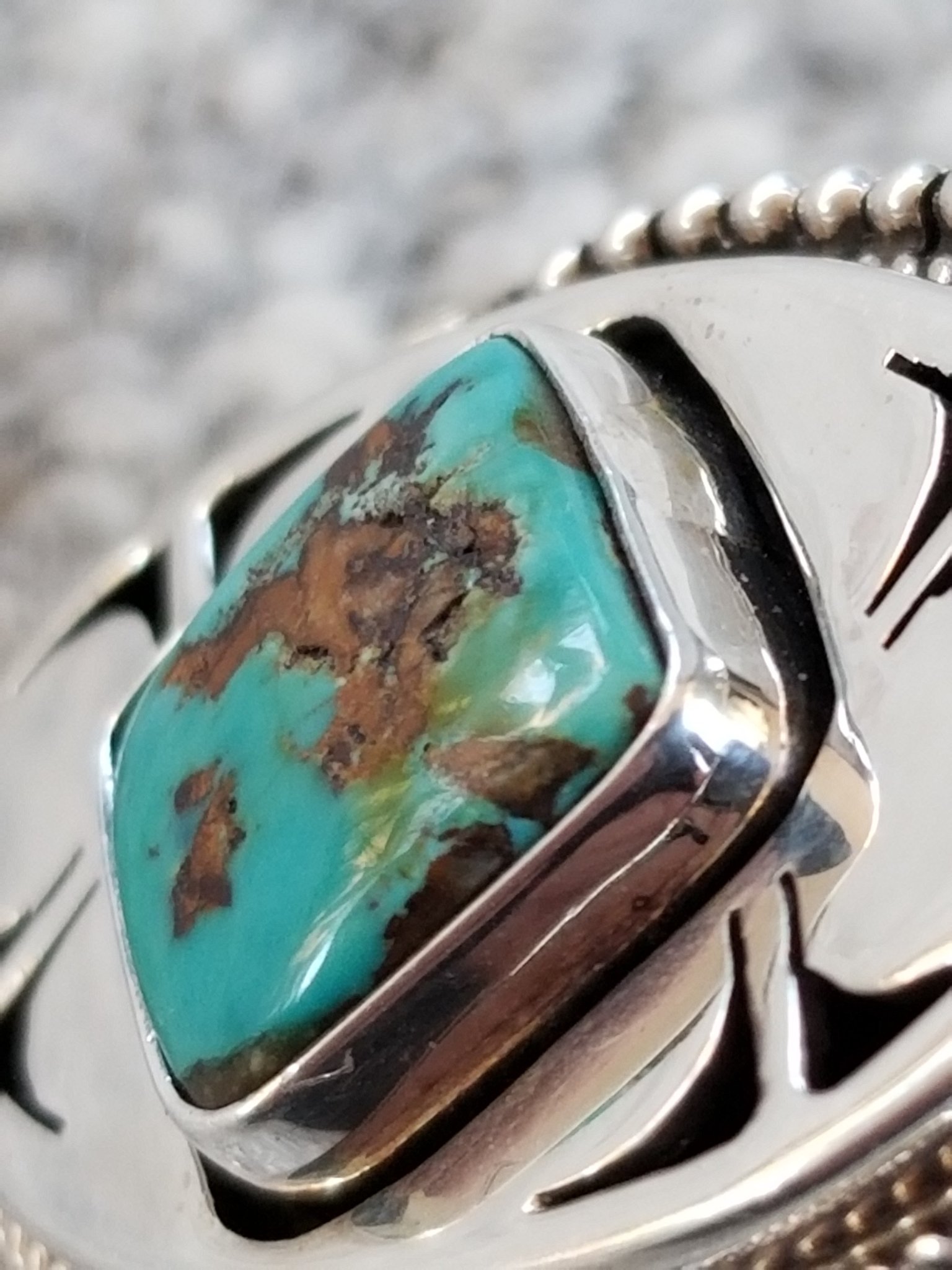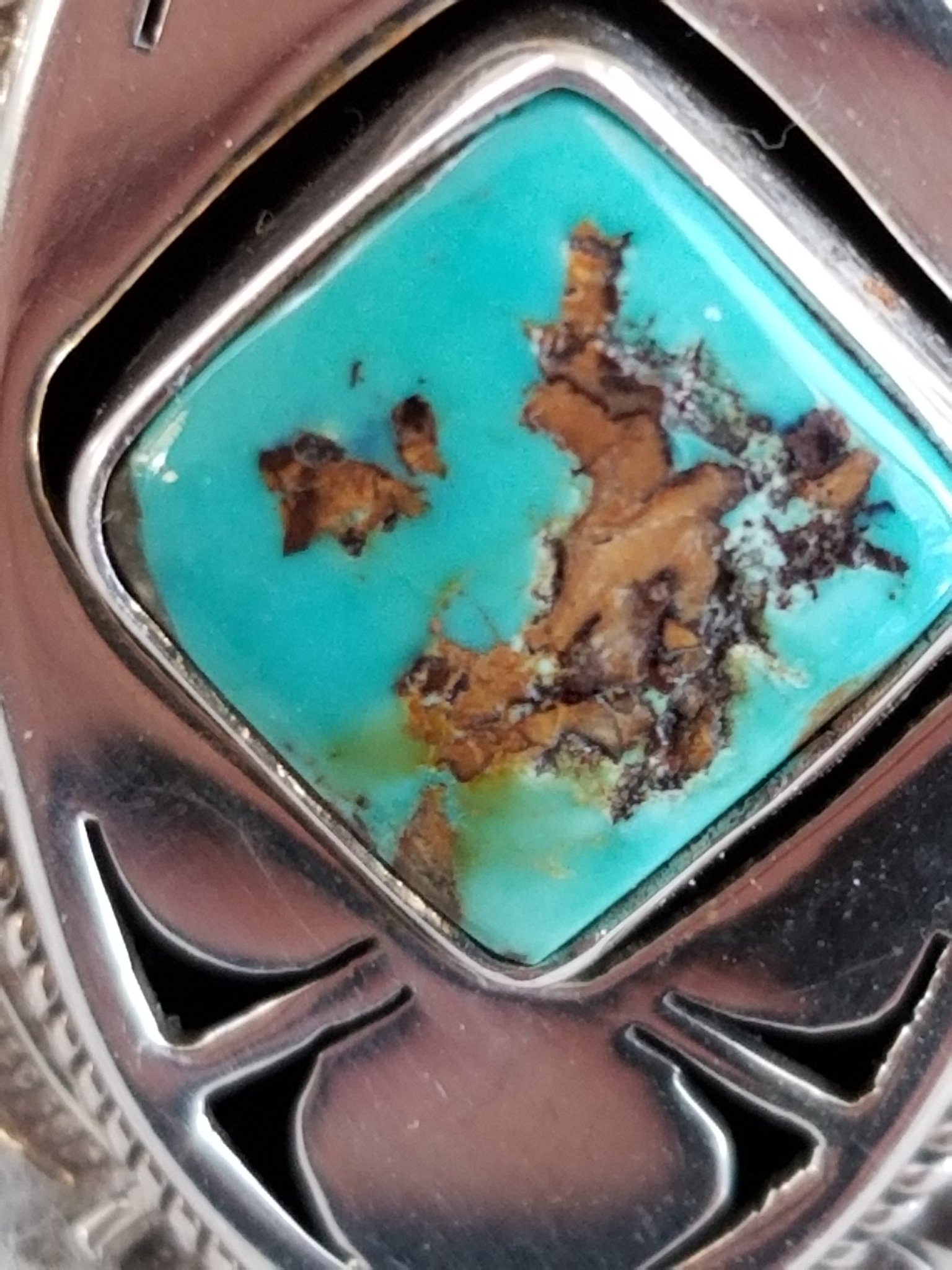 It is prettier than it looks in photo. Fox mine from the State of Nevada, USA. Signed by artist & marked sterling. purchased perhaps 2003.Hello Karne, Very beaitiful! And all the stones have the same color. Hope to find some similar to this here in Holland. Today I found what could be american Turquoise but its a small stone. Is this Navajo or some tourist ring?