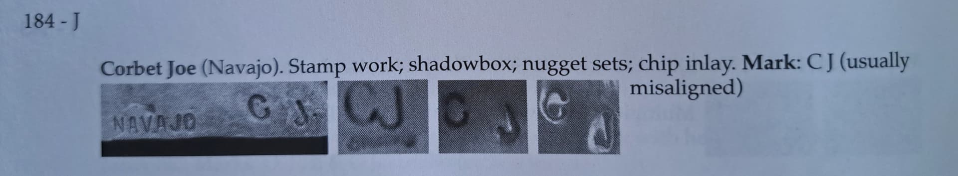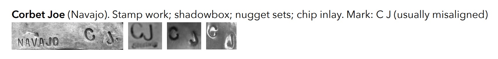 It does look a more like a Corbet Joe hallmark. What confused me is when I looked online his work seems to be mostly chip inlay. But I see the bio says stamping and nugget work also.