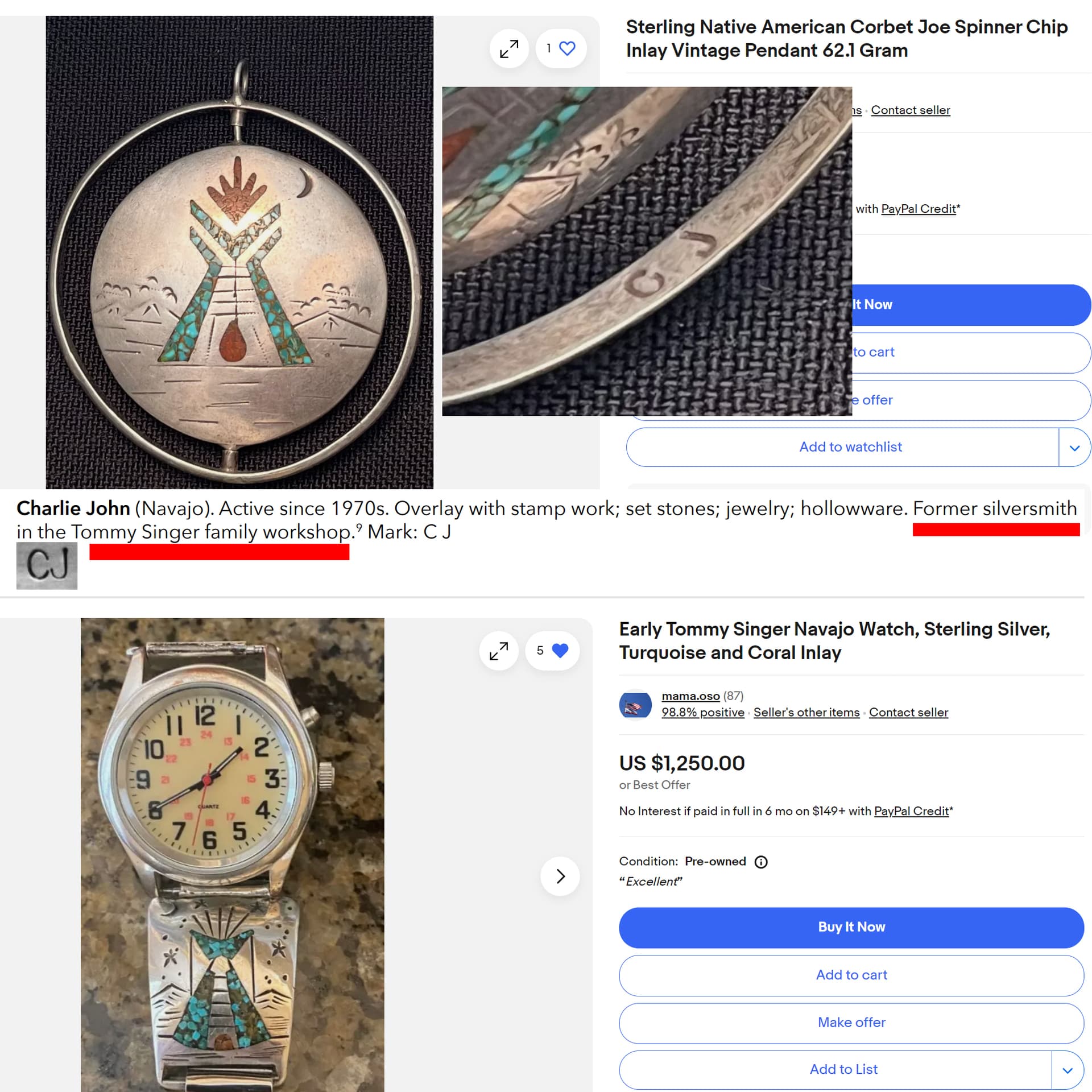 So here is what makes these hallmarks so difficult for me to discern. First is from Palm’s Trading , who does buy directly from the artist, and this is a Charlie John piece…
