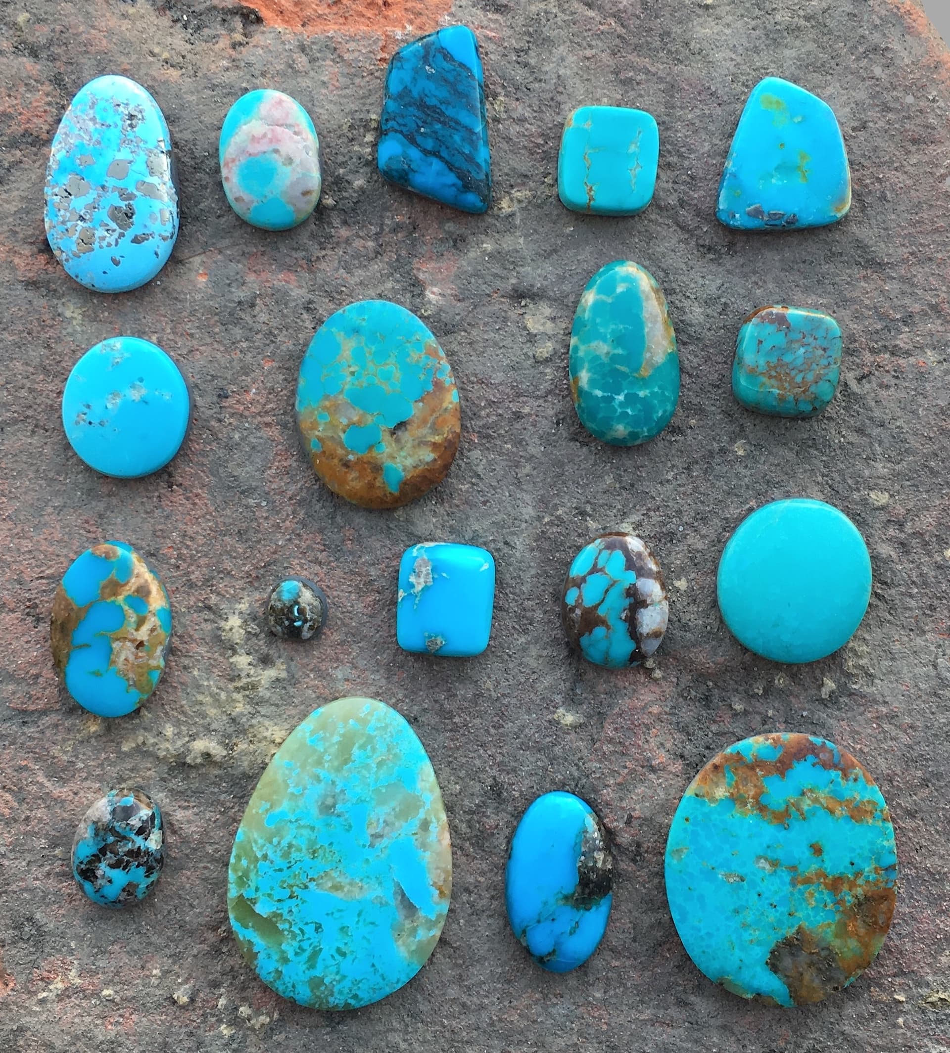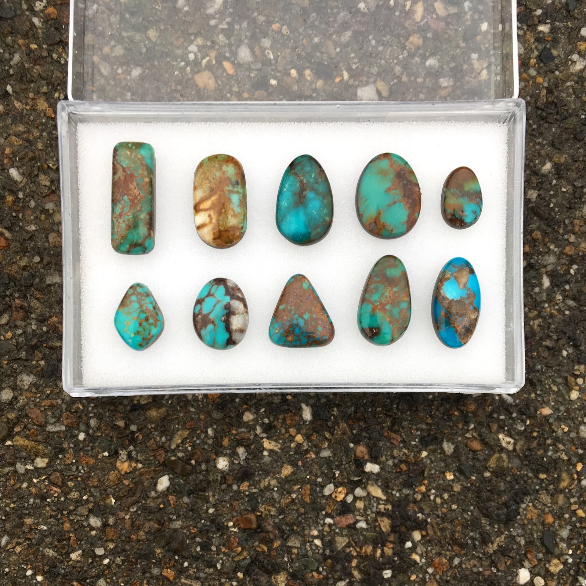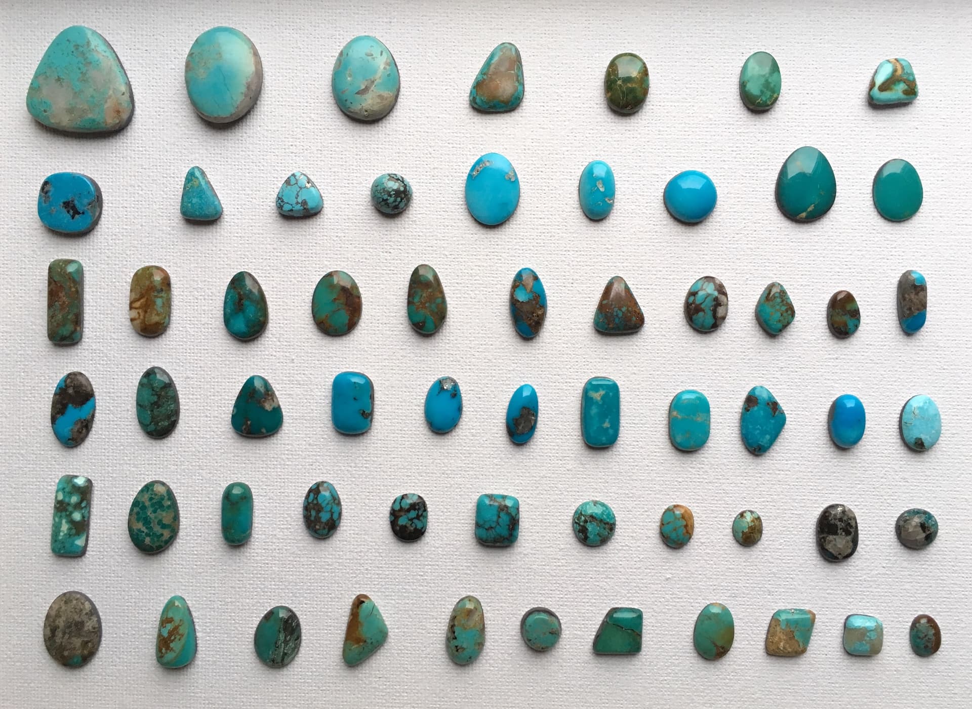 My favorite is the first stone in the 3rd row. The colors are much nicer in reality, with bright blue gradations. It’s 60s or 70s US mined and stabilized. So far my guess is Turquoise Mountain but i am very interested to hear suggestions.