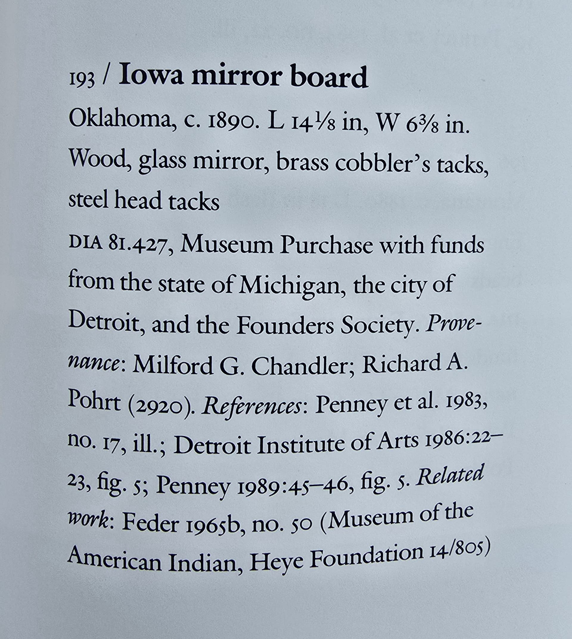 I was leafing through Art of the American Indian Frontier: The Chandler-Pohrt Collection by David W. Penney today, and came across a mirror board that resembles an example I’d posted earlier. Just wanted to share this one along with it’s provenance.