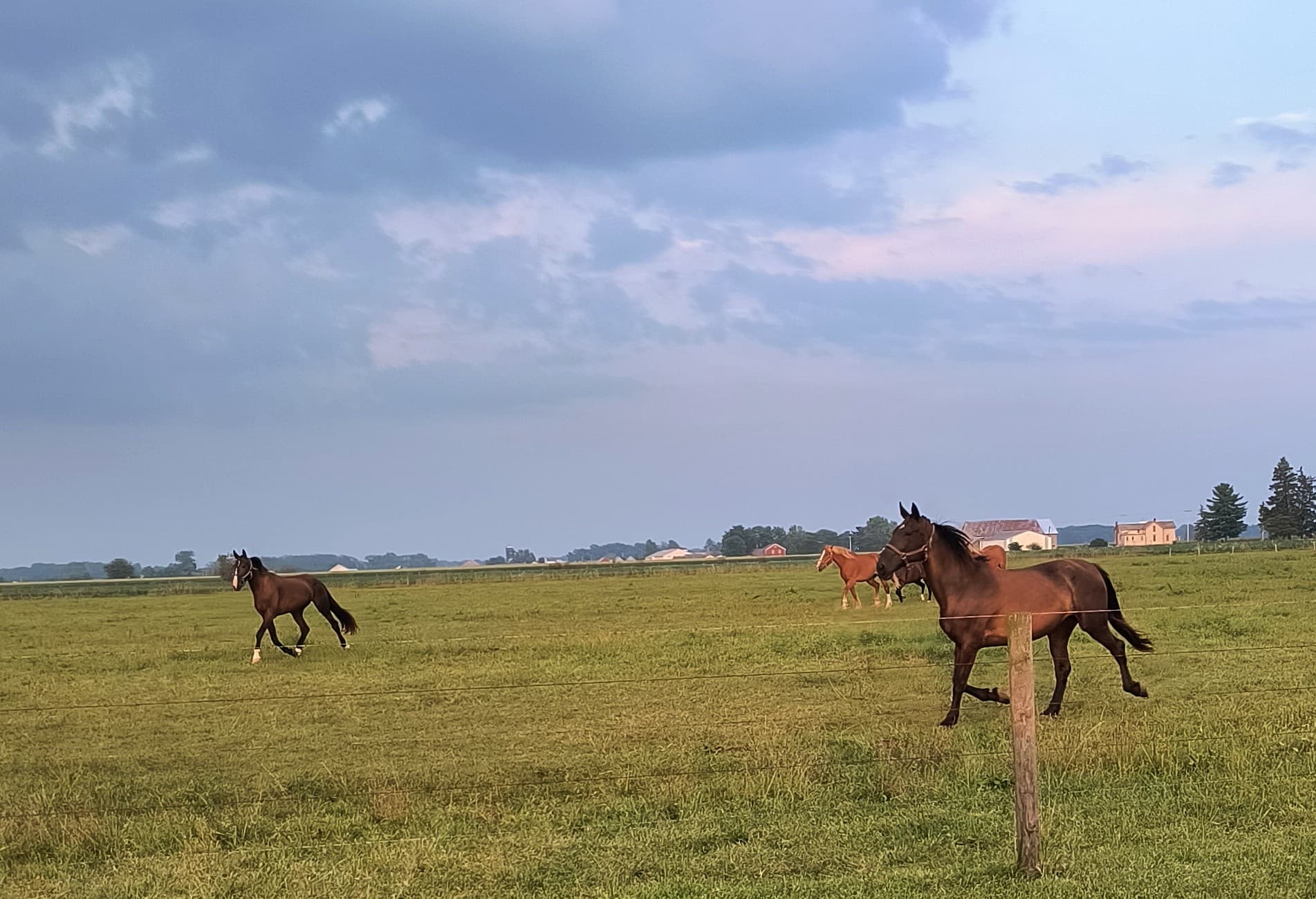 I was getting my groceries tonight, and due to construction on the interstate bypass, I chose to do a different detour than usual. I decided to drive down some roads through the Amish areas. I grew up in a small town in the middle of Amish country so they’re not unusual to me (my dad even hired them to work on his store buildings), but haven’t lately been out much that way. All their horses were out, and lots had babies. These guys all started running towards the barn, probably dinner time, as I was driving by.