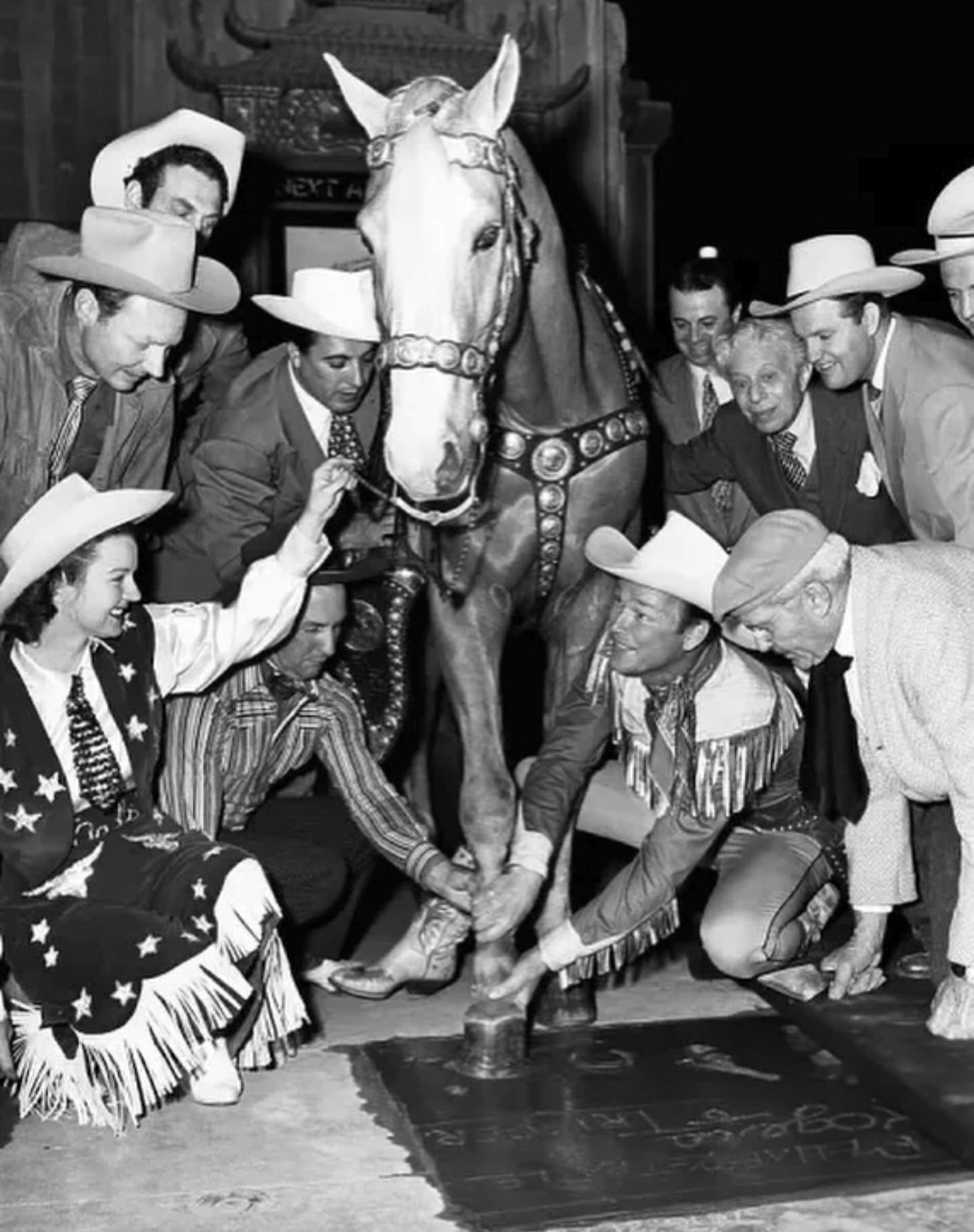 Roy Rogers and his loyal horse, Trigger, getting their respective boot and hoof prints immortalized in concrete at Grauman’s Chinese Theatre in 1949.