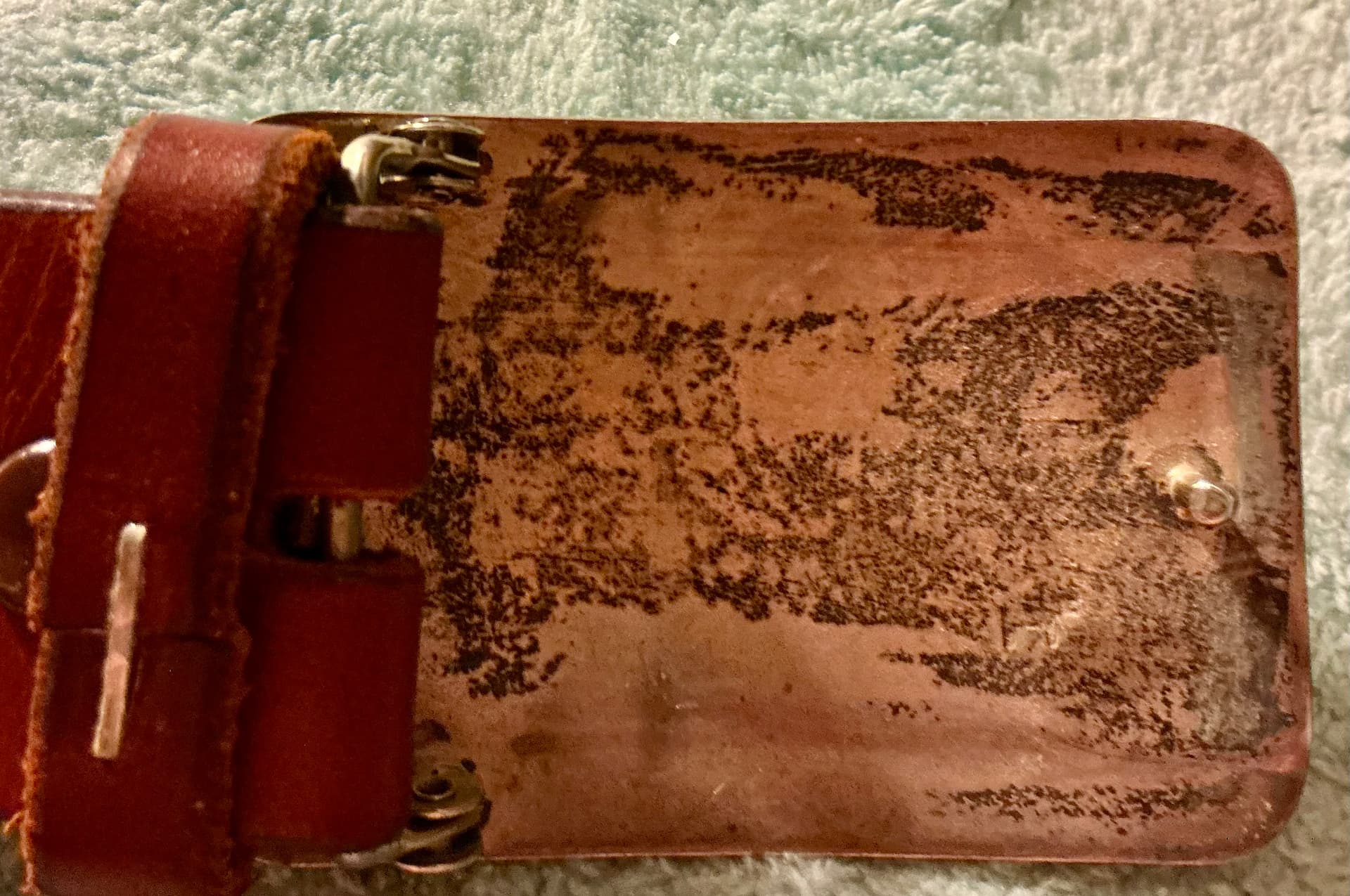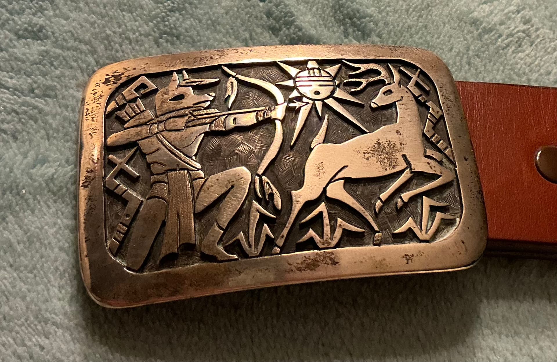 Here’s a belt buckle I got on my honeymoon in New Mexico. That was in 1994, so it’s at least 31 years old. I liked the scene…the weird patina came later.