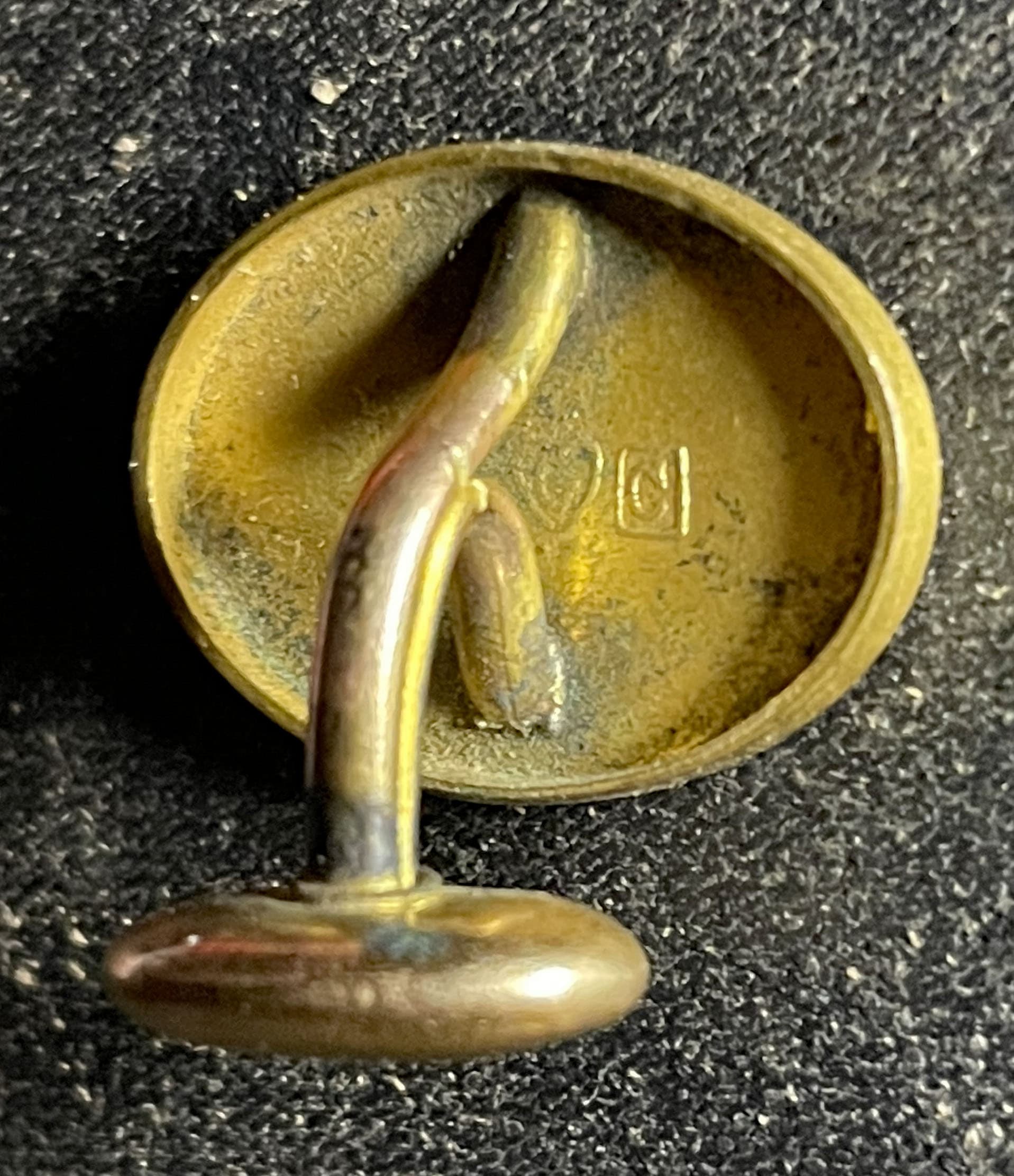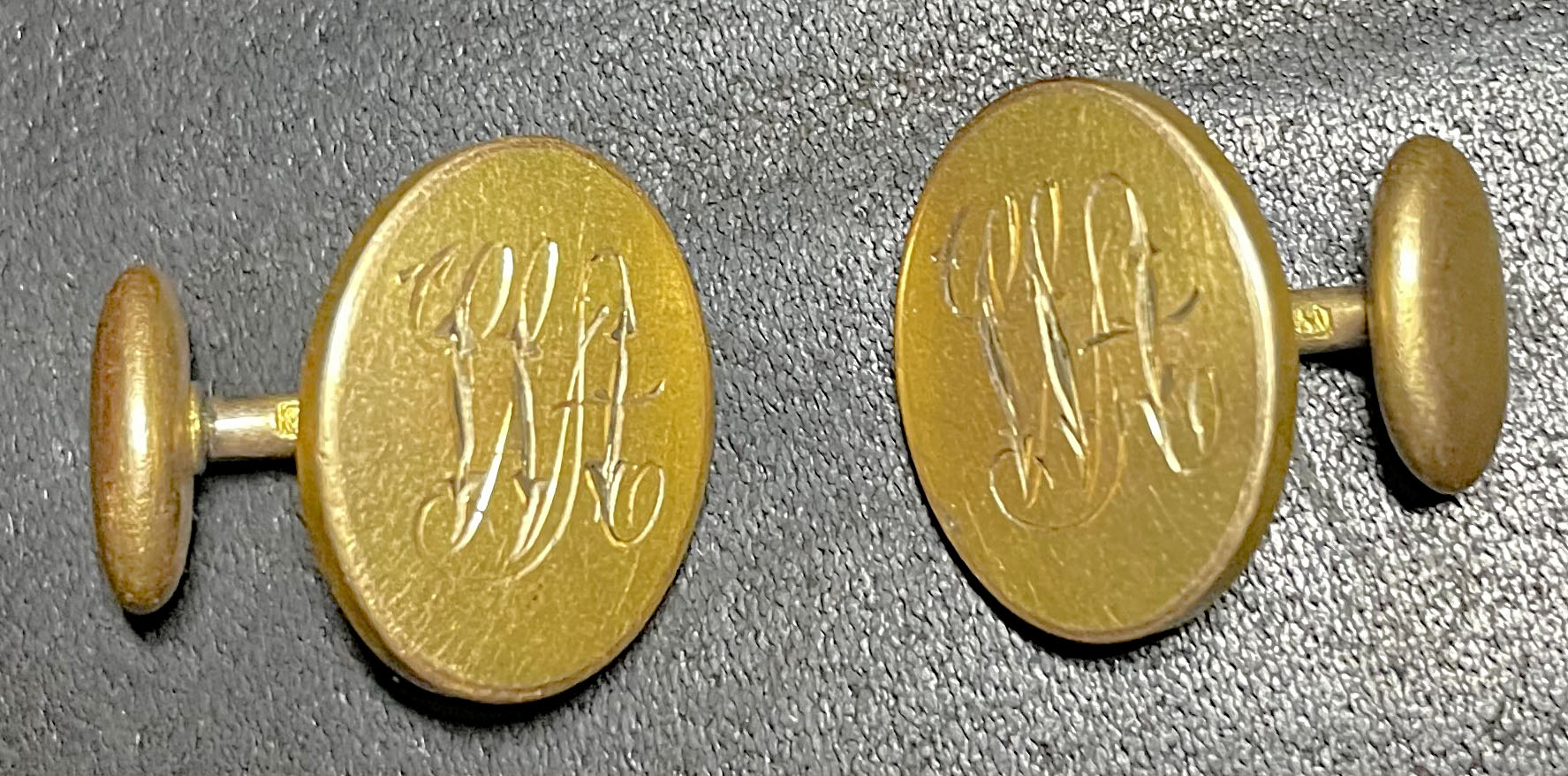 This is a great pair of monogrammed cufflinks. Sorry, but I don’t recognize the hallmark. I believe this may be a gold wash over base metal/sterling - that was a popular technique during the late 1800s. However, others here may have more info about the metal content. Such a wonderful family keepsake!