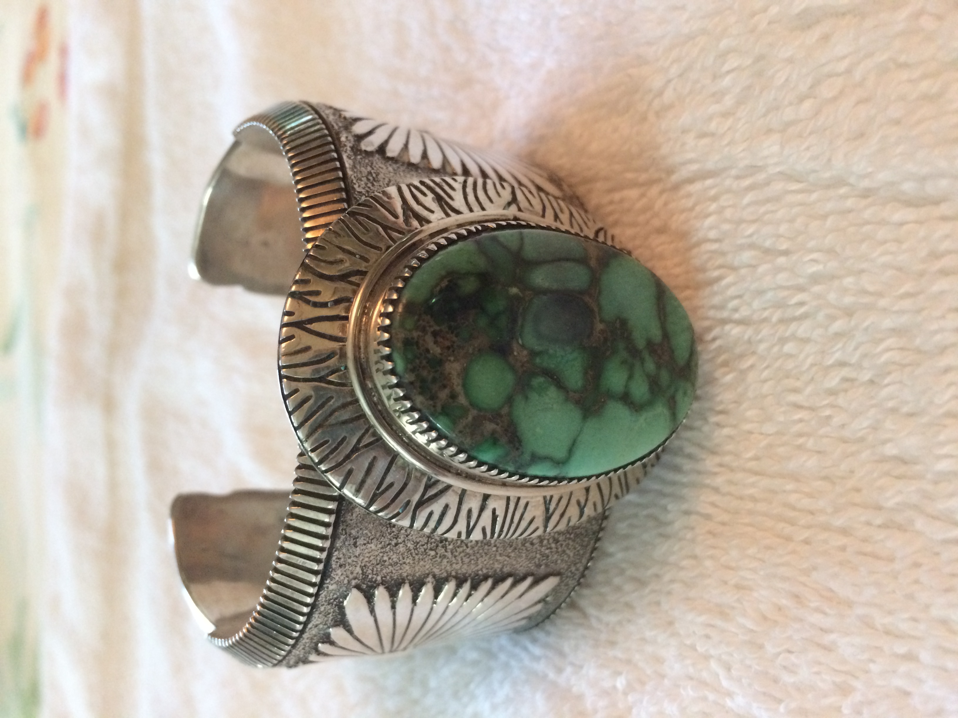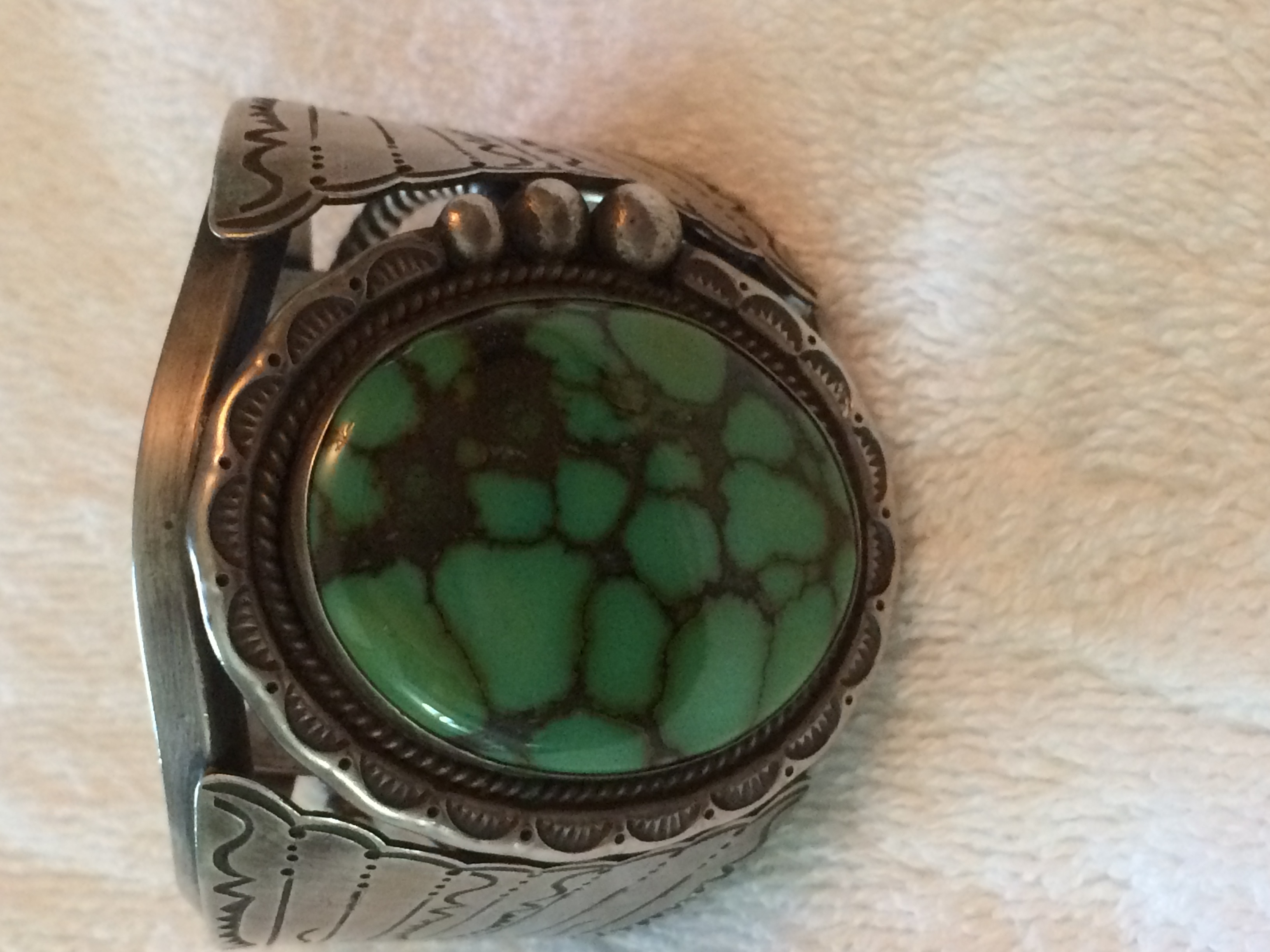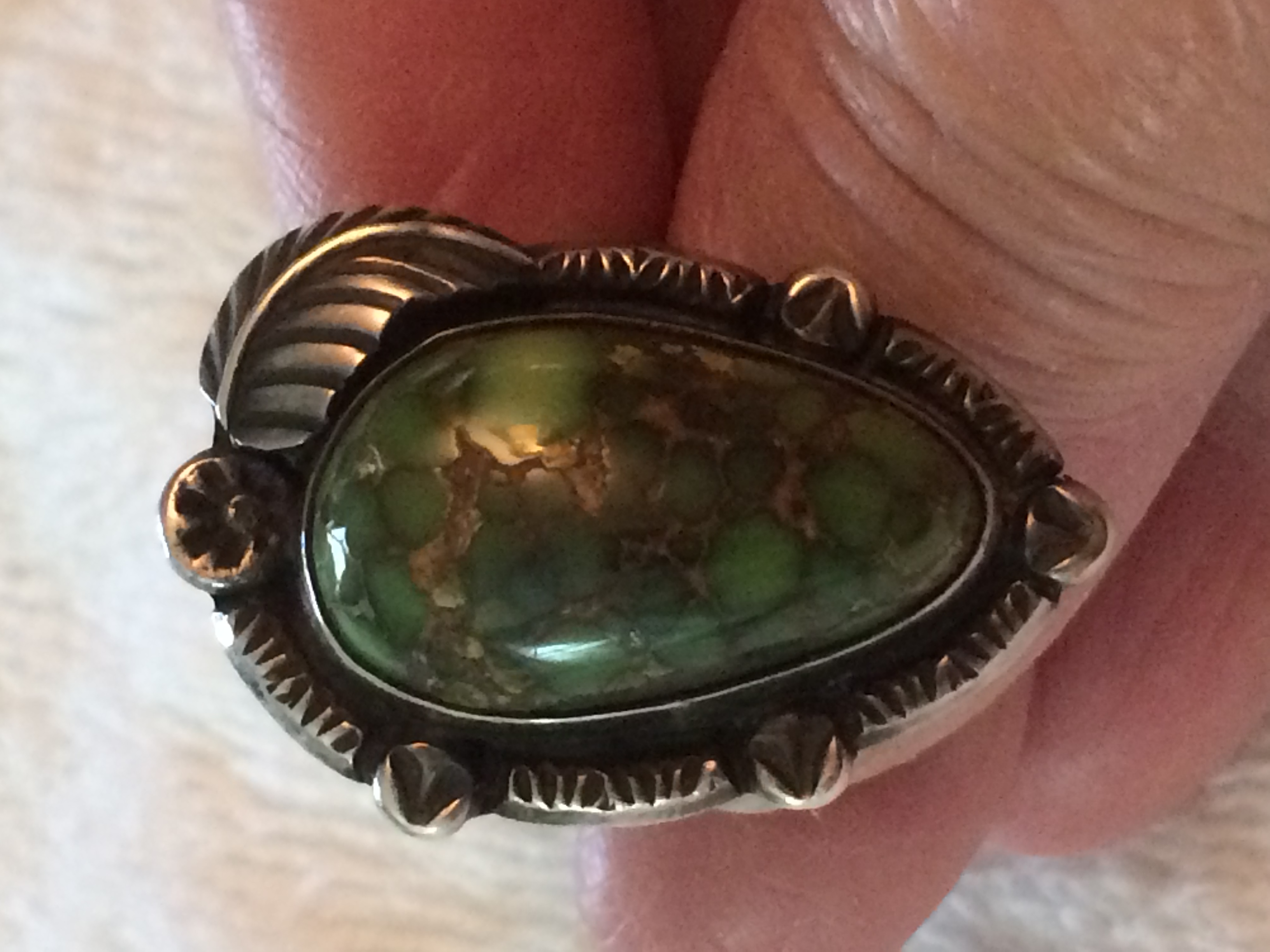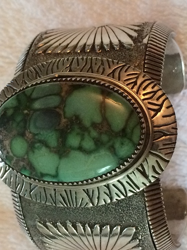 Stones can be very difficult. You see both pieces with very similar shades of green. I think of the first bracelet as being a piece of broken arrow variscite, the second bracelet Chinese and the ring Damele. Fred Thompson use to work here in this trading post, would like to see the hallmark. All three are beautiful pieces.