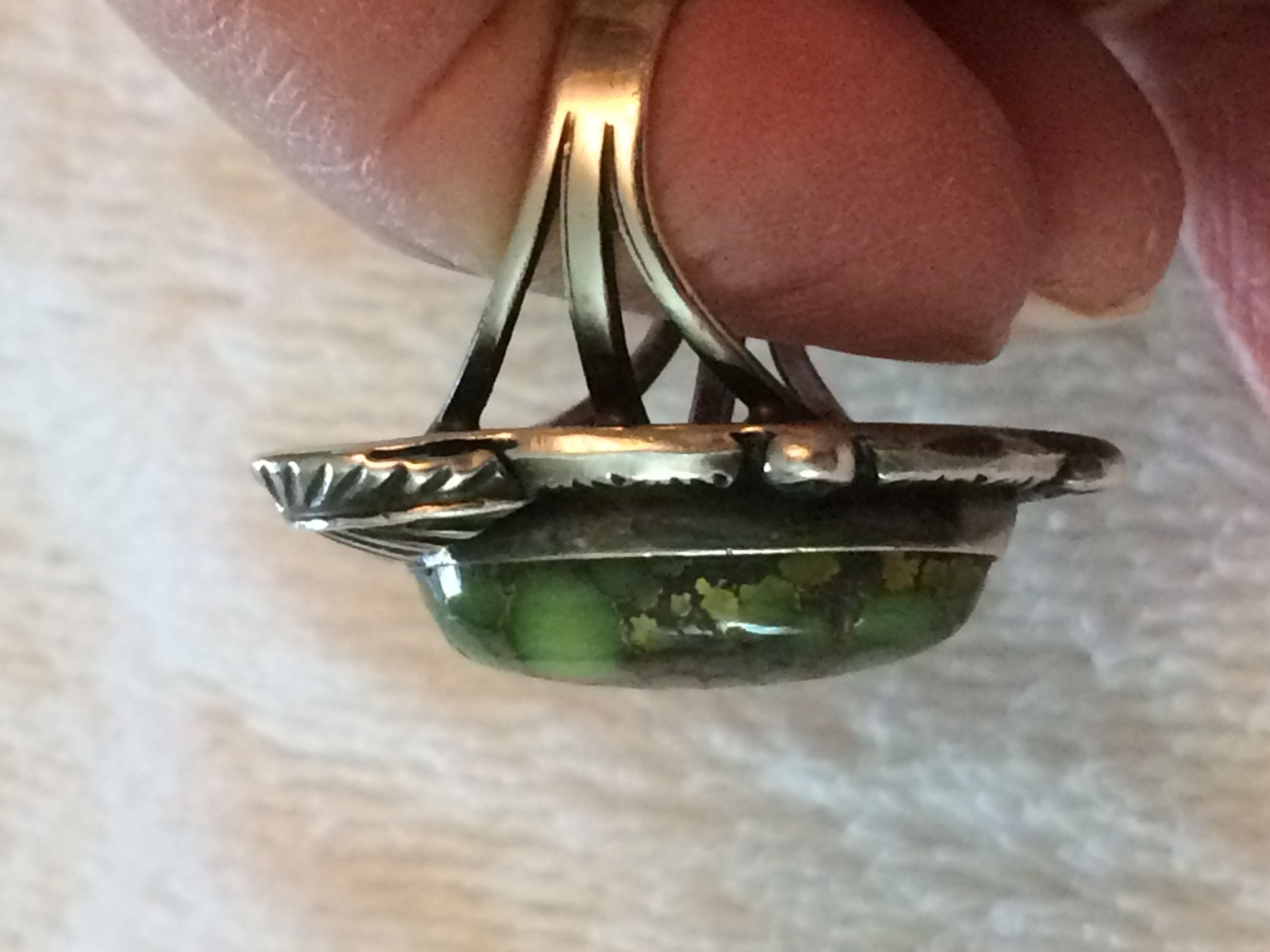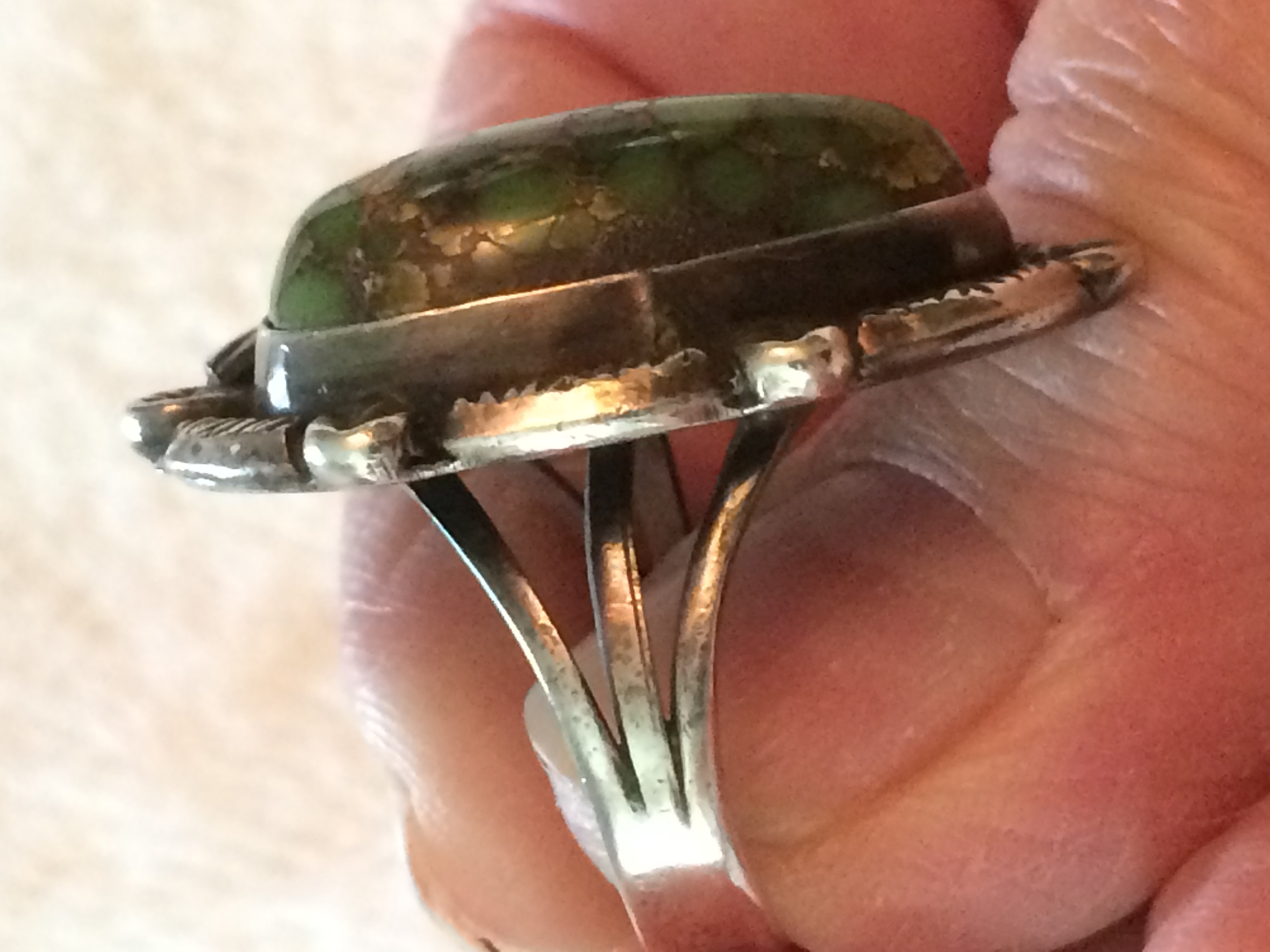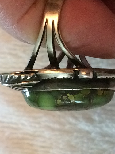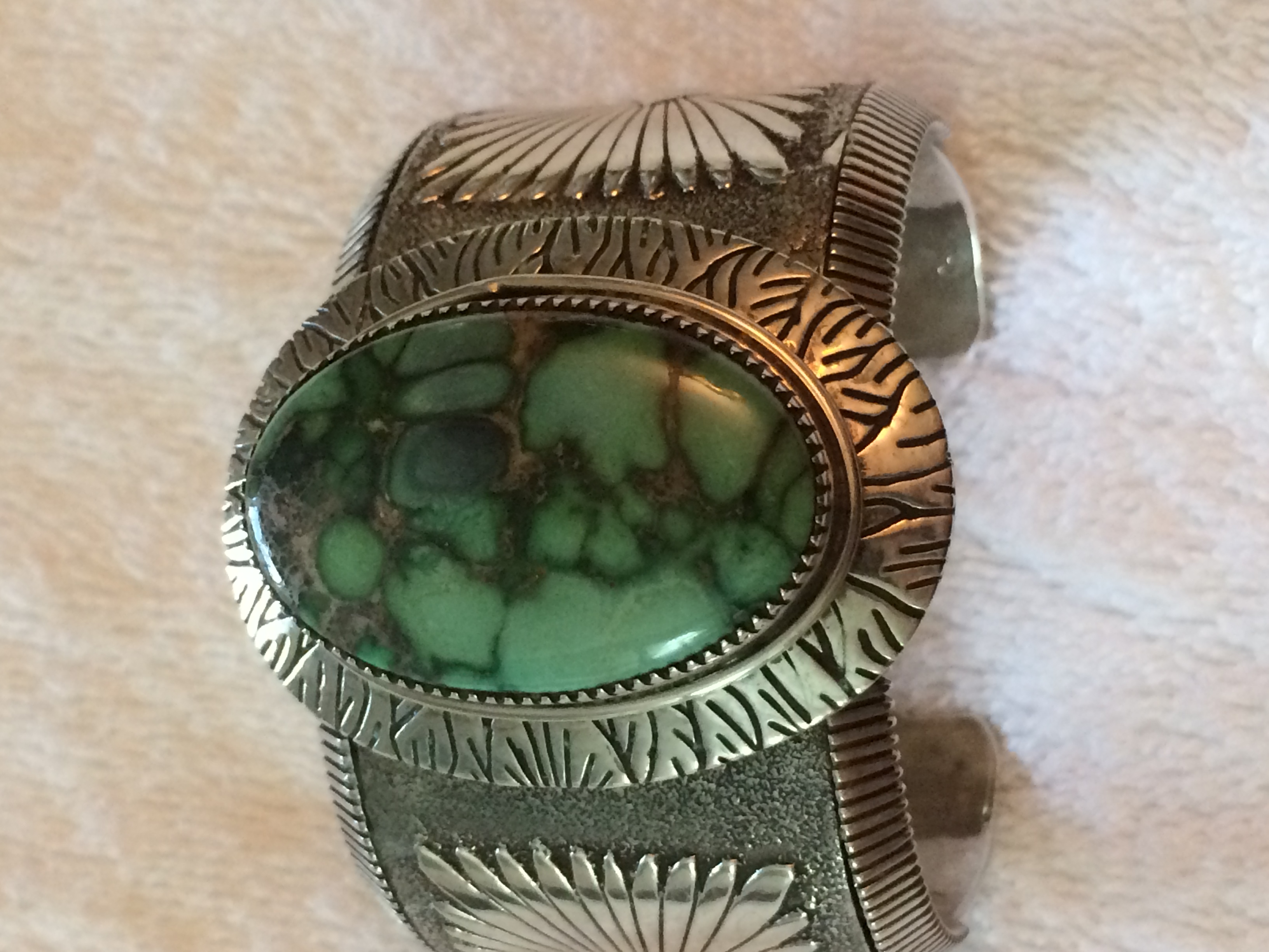 Stones can be very difficult. You see both pieces with very similar shades of green. I think of the first bracelet as being a piece of broken arrow variscite, the second bracelet Chinese and the ring Damele. Fred Thompson use to work here in this trading post, would like to see the hallmark. All three are beautiful pieces.