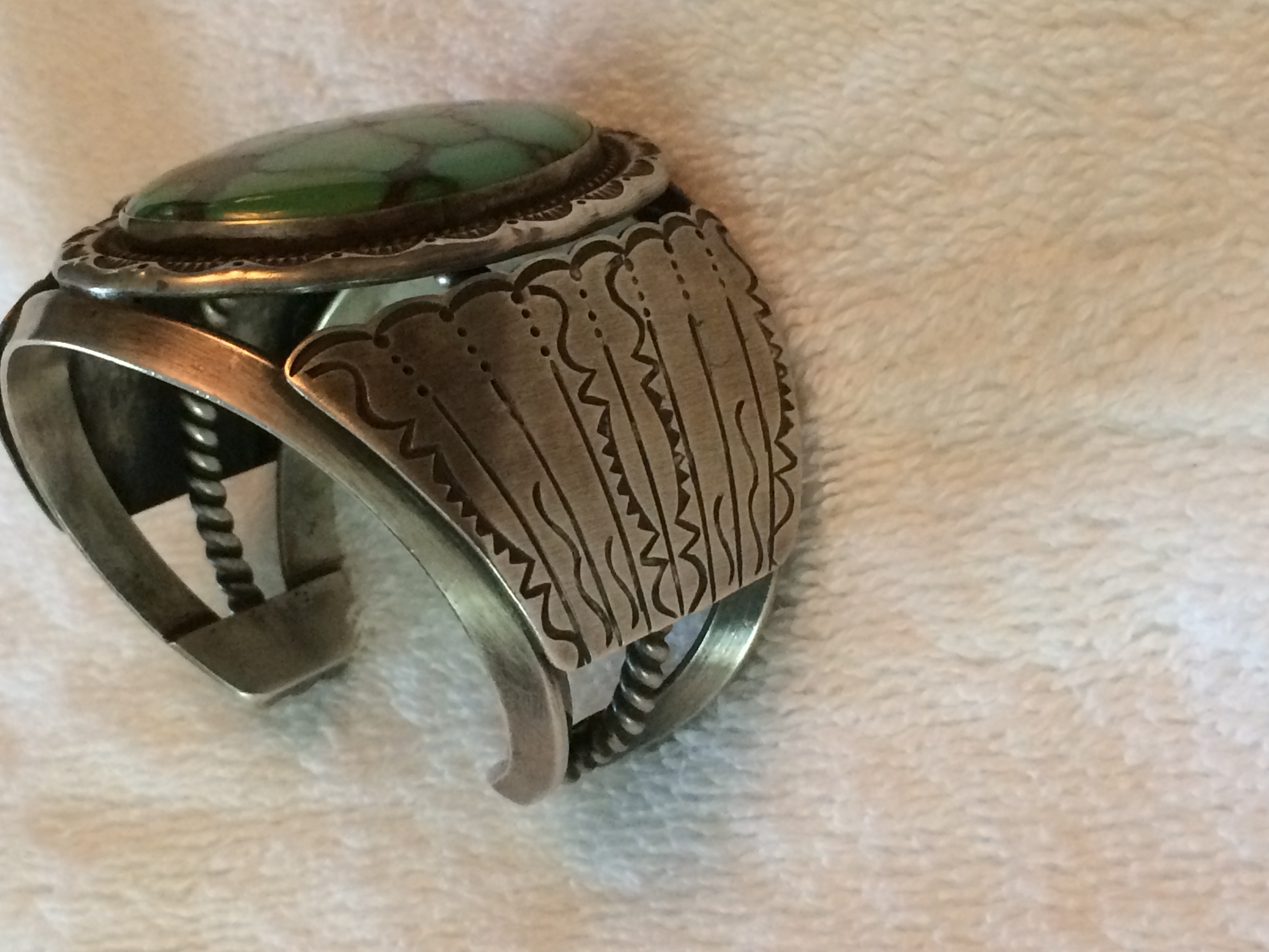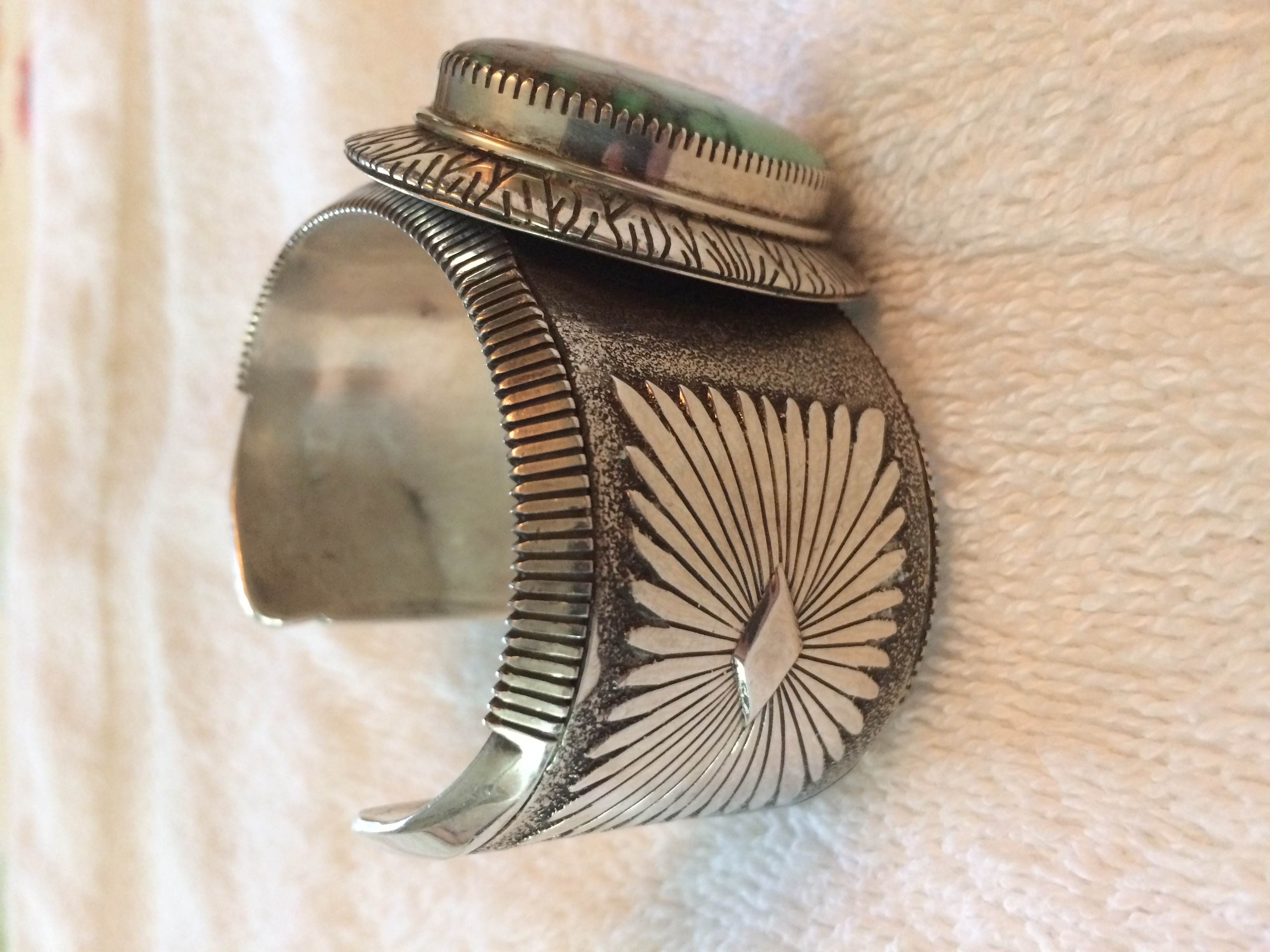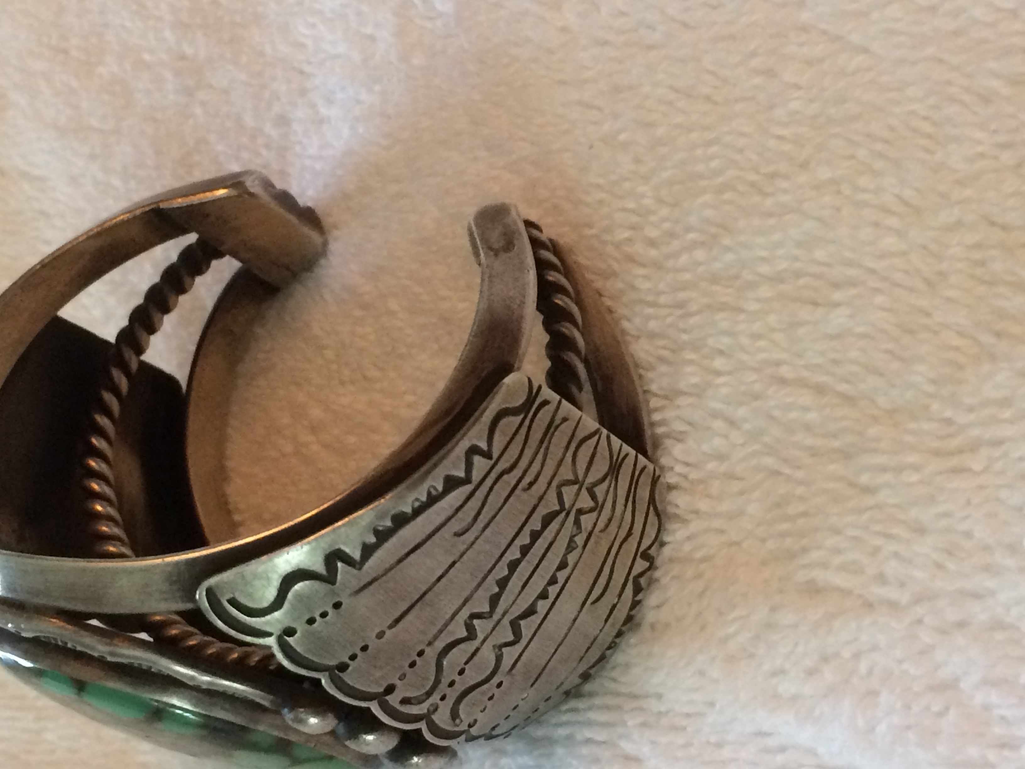 *This post is about the very first cuff in the pictures-the cast one. I am still trying to identify the maker of this cast bracelet. Several different references have identified the hallmark as Chris Beyuka, however he is listed as Zuni. I did read somewhere that he worked in different styles.