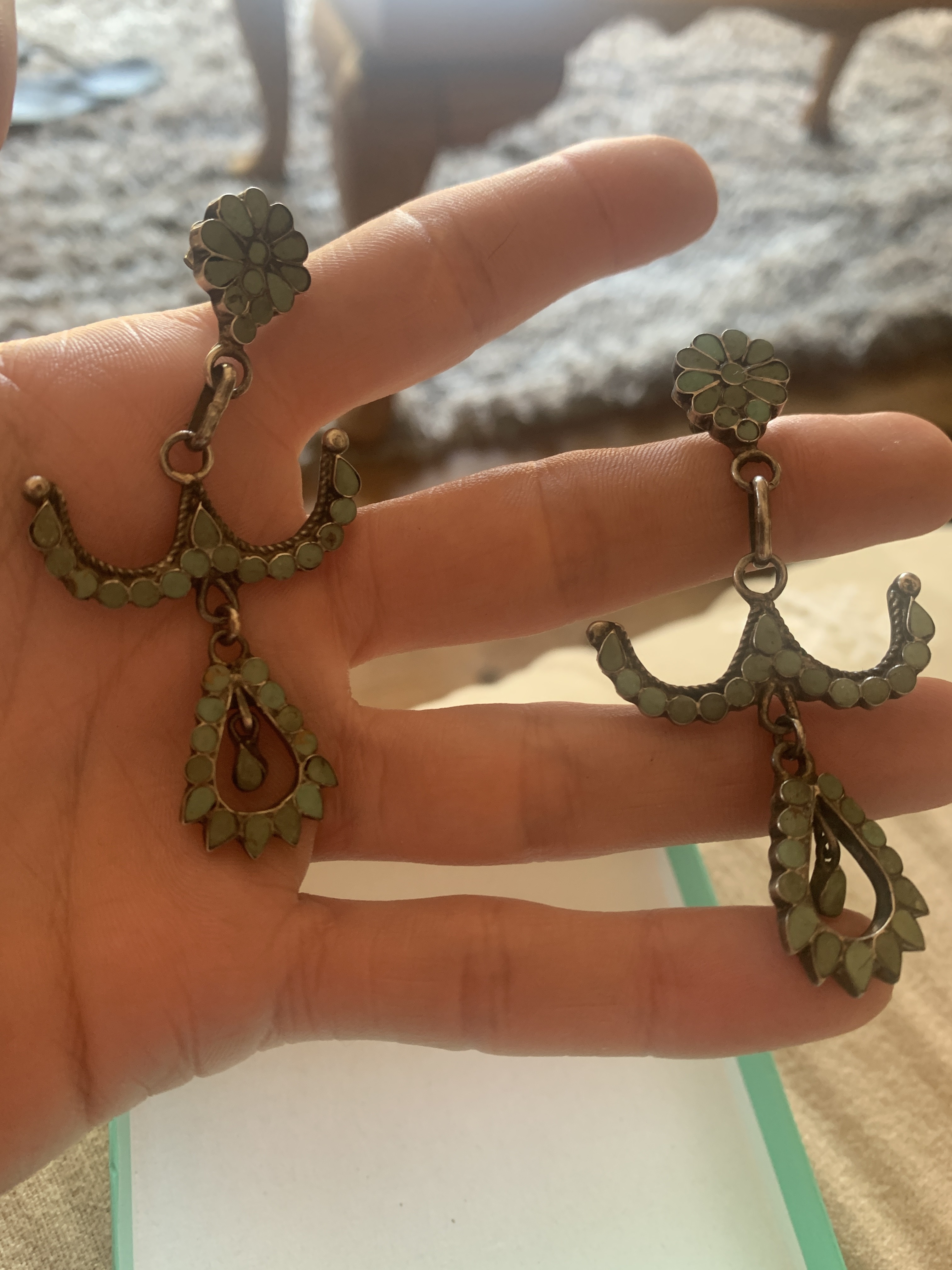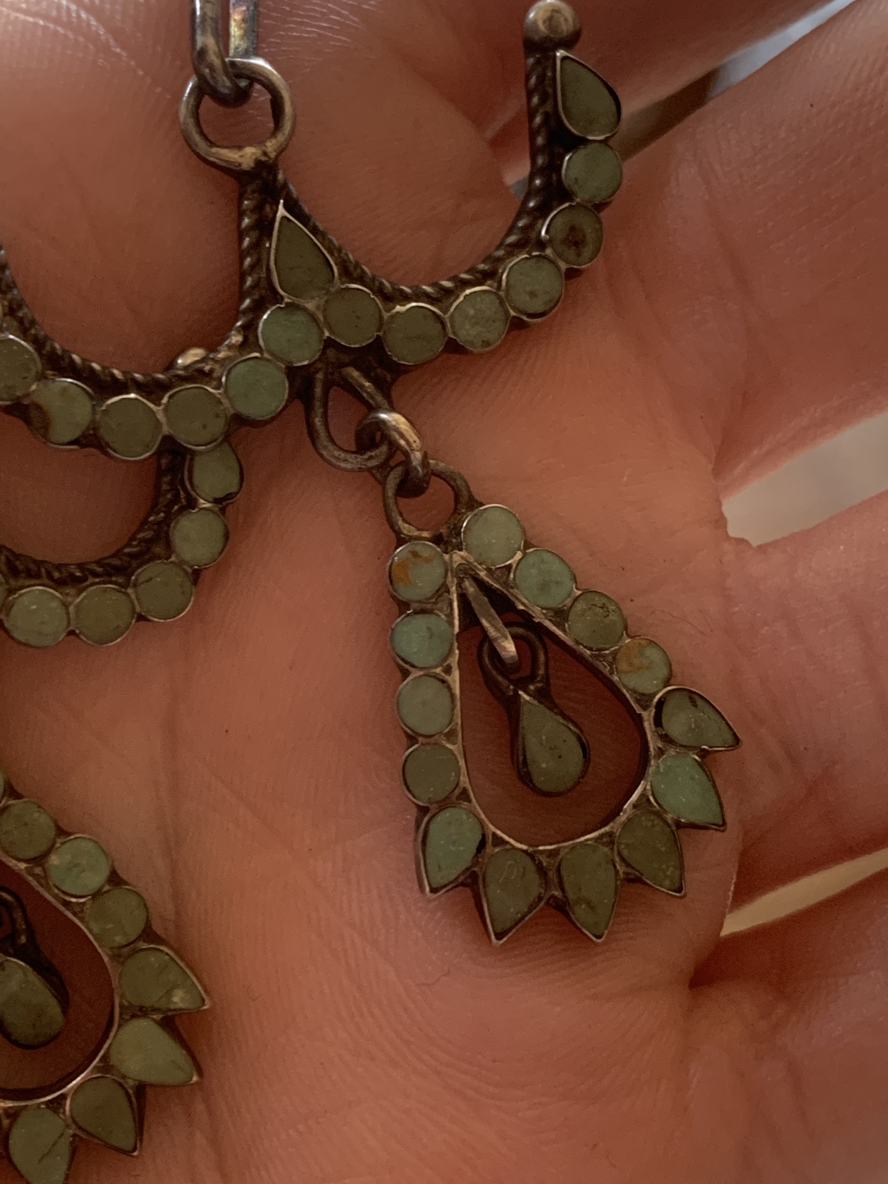Wow what beautiful earrings. They look like they might have been made by one of the Dishta’s whose family invented this style inlay way back in the 20s (I think). Here is a link to a short interview with Virgil Dishta Sr which says that the first Dishta’s (Frank Dishta and his wife) did not hallmark there and Virgil Dishta Sr didn’t start until the 50s. Unfortunately the interview didn’t talk about where they sourced their turquiose. Perry Null trading interview with Virgil Dishta