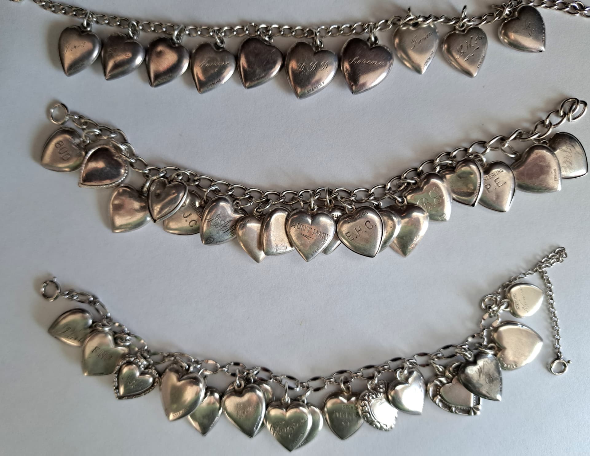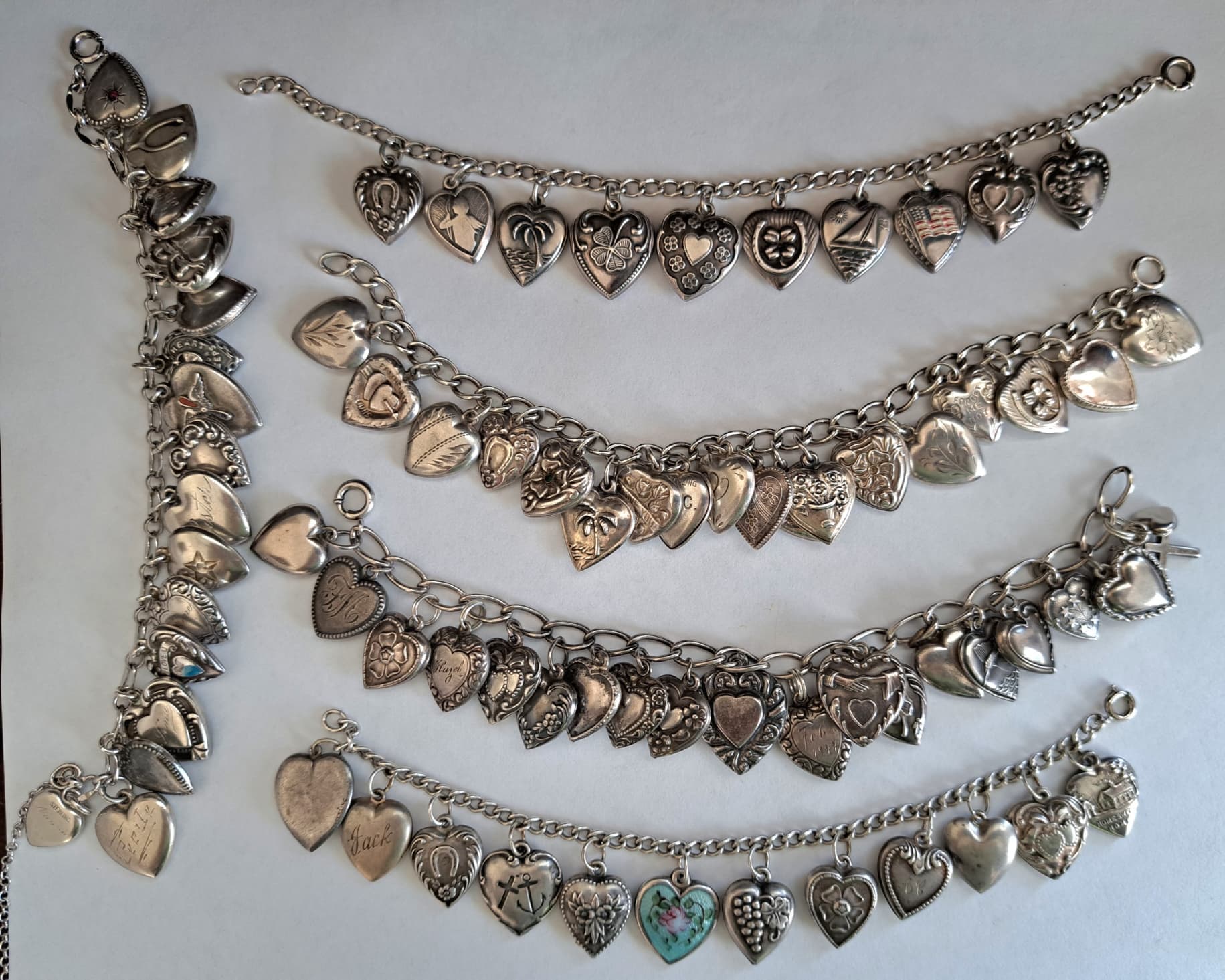 Today is all about hearts & love. This is my collection of vintage, puffy heart charm bracelets. They were enormously popular during the 1940s. Hard to capture but, most sterling hearts are engraved on the reverse with either a name, or nickname, or initials and/or date (2nd photo). Two of the hearts are dated '41 & '42, respectively. None of these hearts are reproductions.