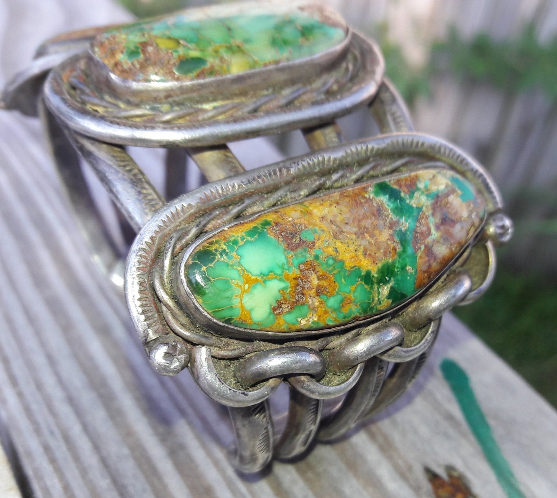 A couple of those stones in your conchos remind me of these stones on a cuff I have. Dark green fading into a lighter green with brown/gold matrix. I do not know its origins either!